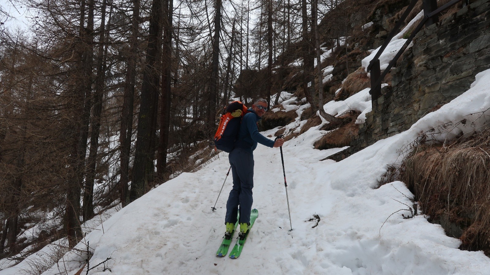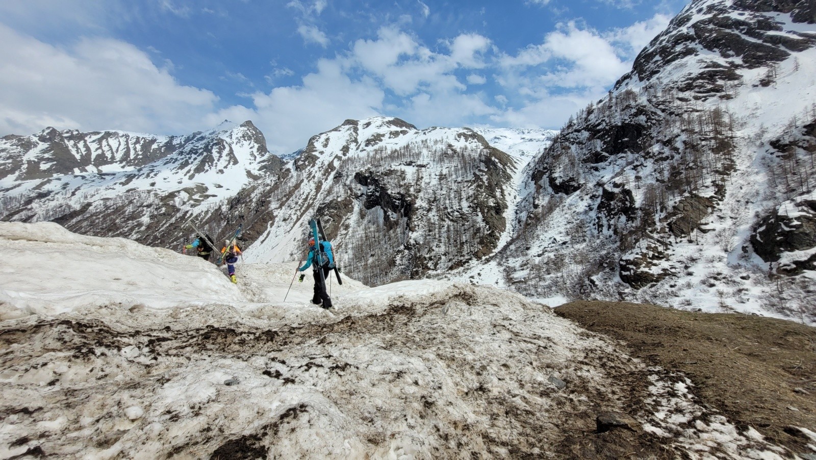 Après "la pasta" du midi au refuge de Fond, nous quittons avec regret Corrado, Claudia, Maya le chien, et le renard. Nous redescendons le Val di Rhêmes le plus bas possible sur les skis et finissons confortablement skis sur le dos.