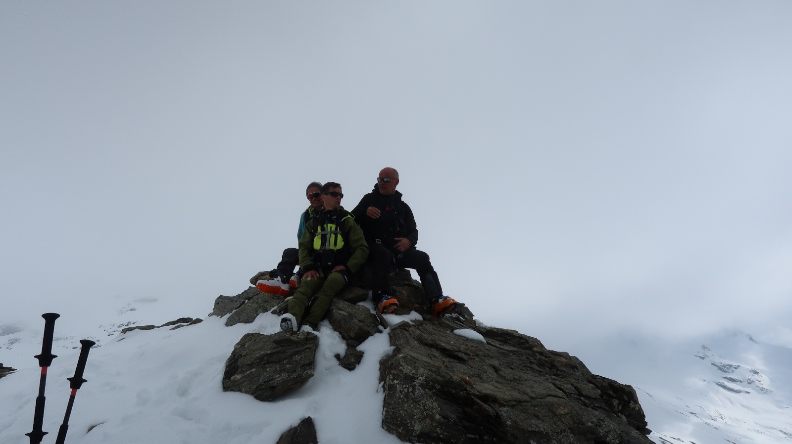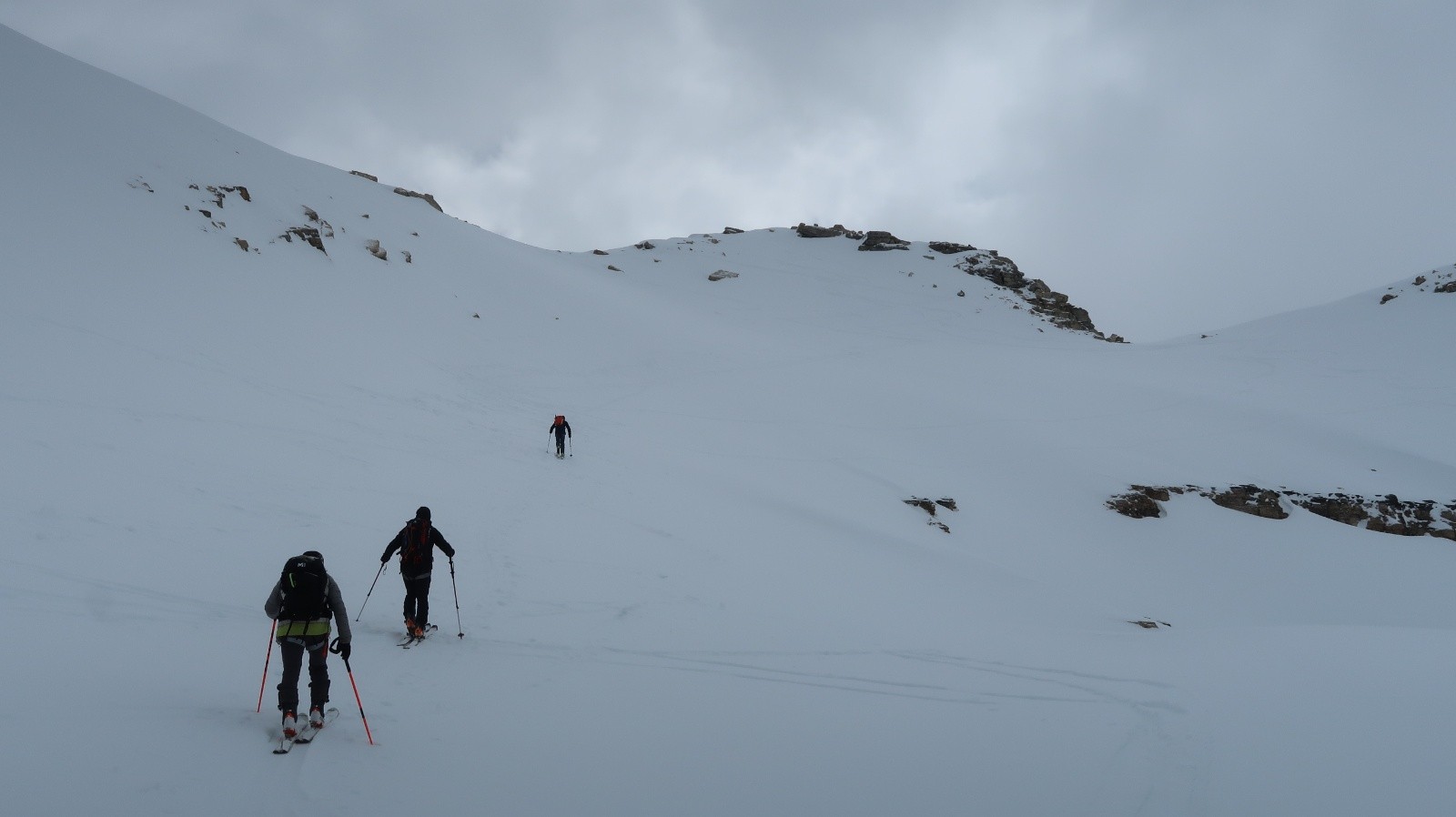 Après la fameuse "polenta concia" de Bénévolo, nous repartons en groupe réduit vers la Pointe Palettaz sud. Le ciel est couvert mais l'ambiance très agréable et nous sommes seuls dans ces pentes. Le sommet est atteint assez facilement en moins de 2h. Nous nous régalons à la descente sur une neige légèrement transformée.
