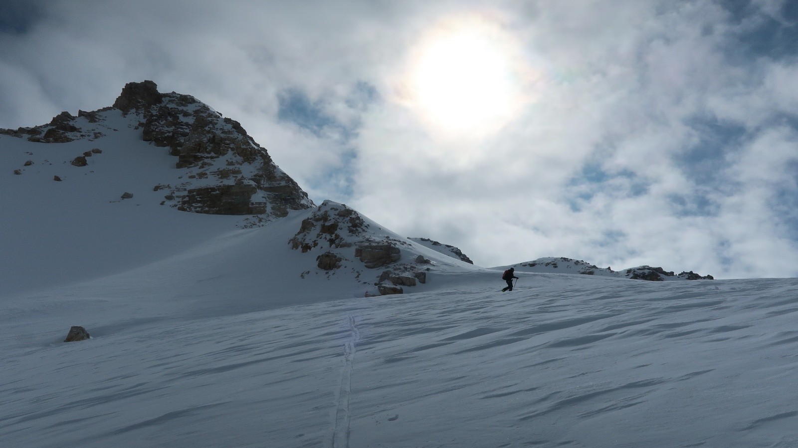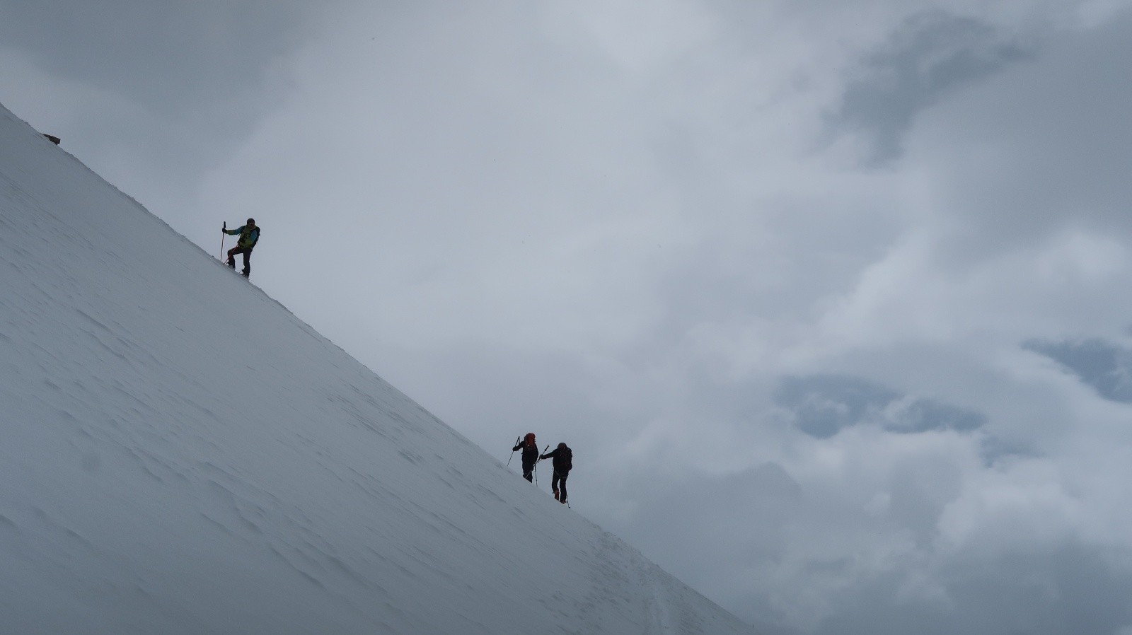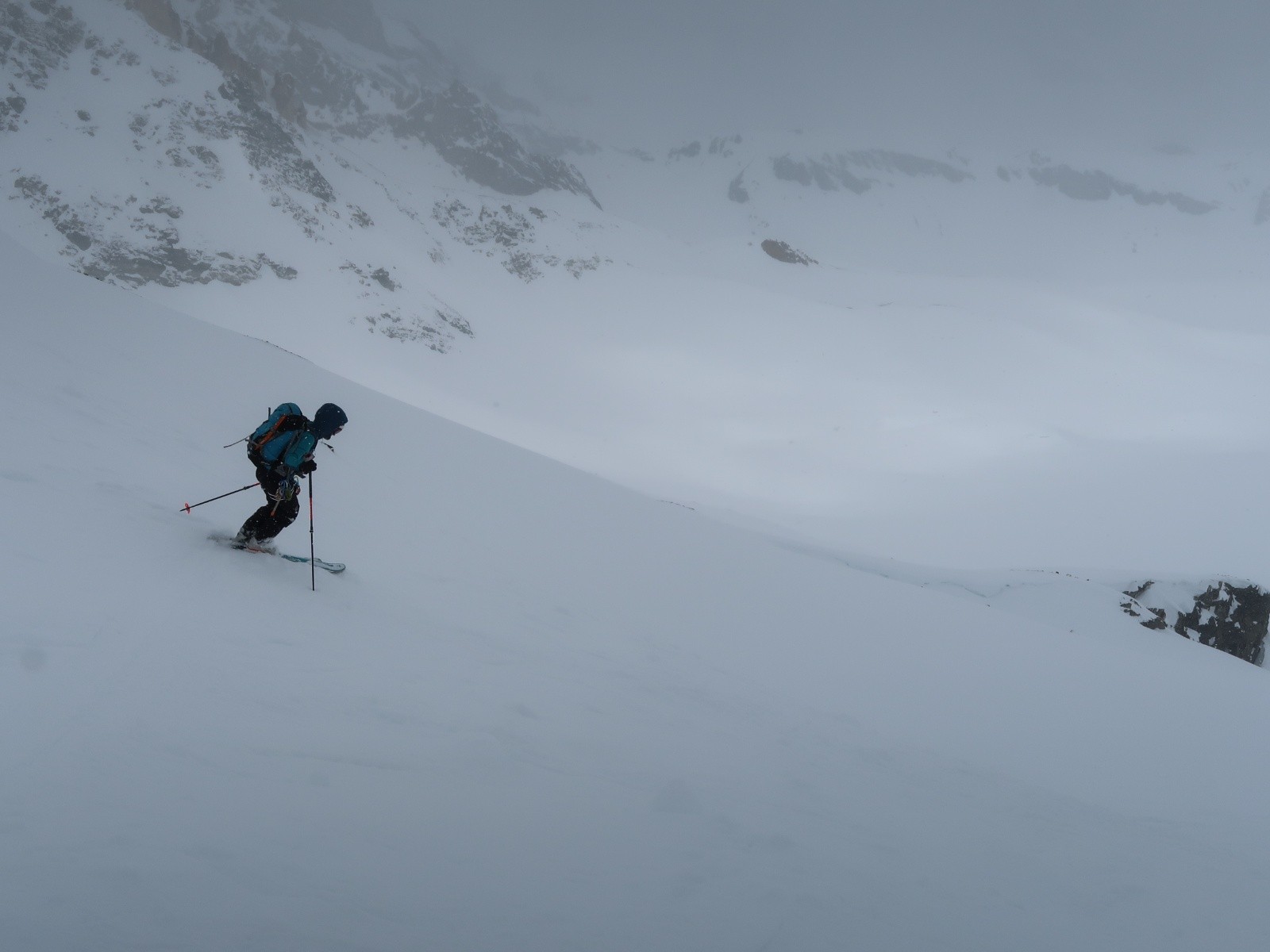 La Haute Vallée de Rhêmes est couronnée de dizaines de sommets et cols à plus de 3000m. Notre objectif du jour est la Pointe de la Galise, Punta Galisa, un sommet frontalier, direction plein sud. L'ambiance est hivernale, les sommets jouent à cache-cache. A partir du glacier, la visibilité diminue, nous arrêtons notre montée à 3300m, à quelques encablures du sommet. En descente sur le Glacier du Fond, la neige est poudreuse mais la visibilité nous oblige à la retenue. Une fois à mi-pente, la Punta Galisa nous nargue en dévoilant sa silhouette. Tant pis, un jour, nous l'aurons!