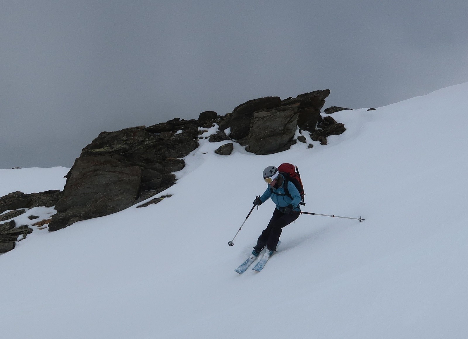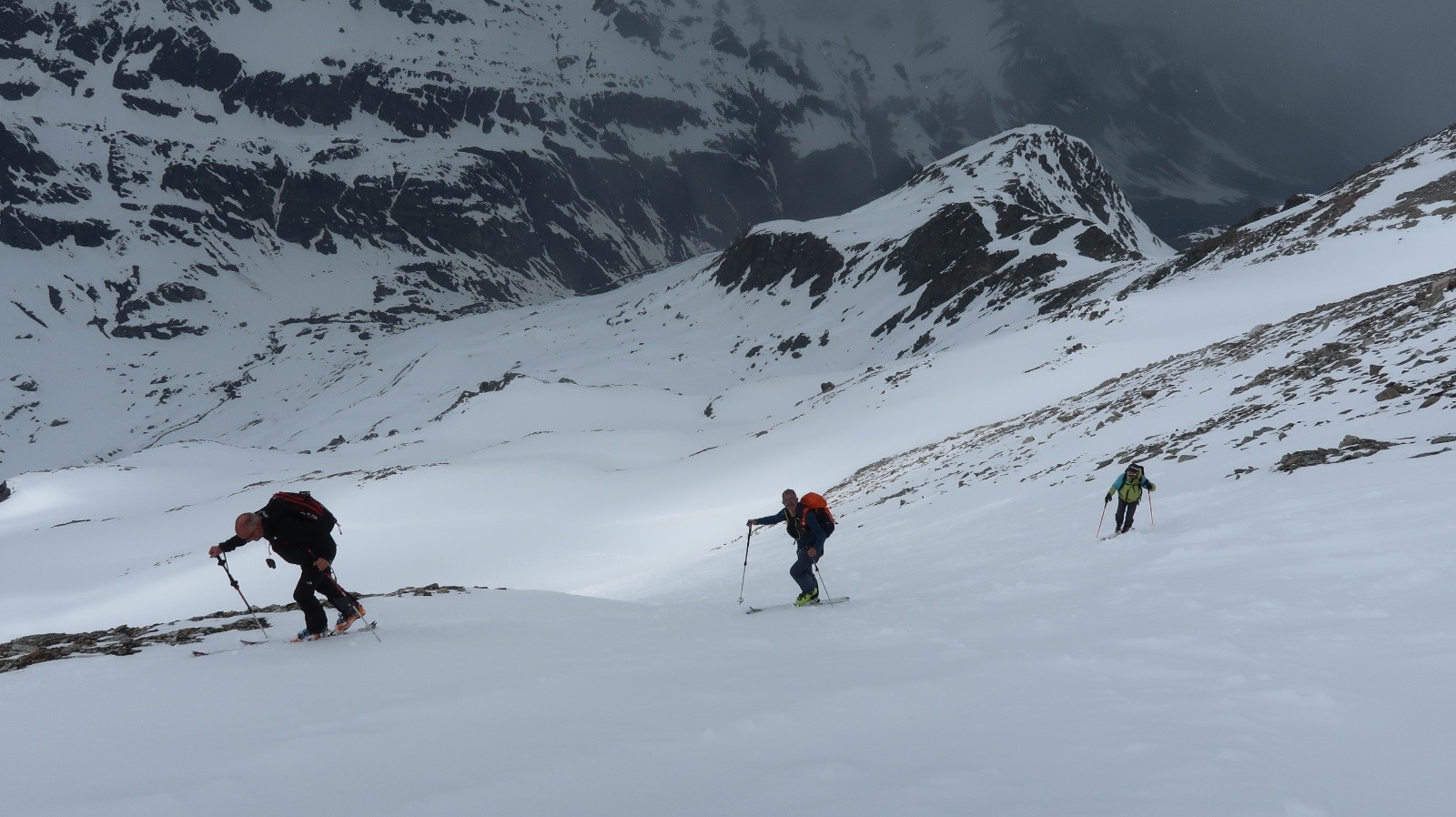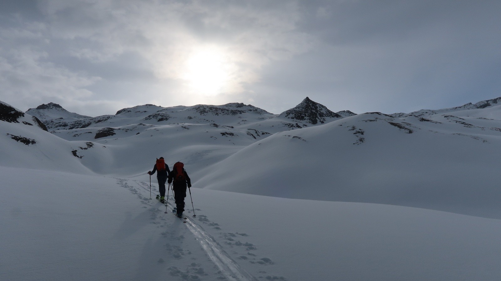 La Haute Vallée de Rhêmes est couronnée de dizaines de sommets et cols à plus de 3000m. Notre objectif du jour est la Pointe de la Galise, Punta Galisa, un sommet frontalier, direction plein sud. L'ambiance est hivernale, les sommets jouent à cache-cache. A partir du glacier, la visibilité diminue, nous arrêtons notre montée à 3300m, à quelques encablures du sommet. En descente sur le Glacier du Fond, la neige est poudreuse mais la visibilité nous oblige à la retenue. Une fois à mi-pente, la Punta Galisa nous nargue en dévoilant sa silhouette. Tant pis, un jour, nous l'aurons!