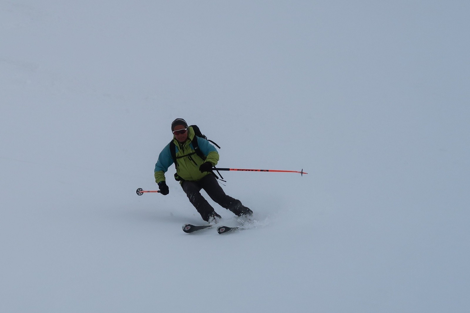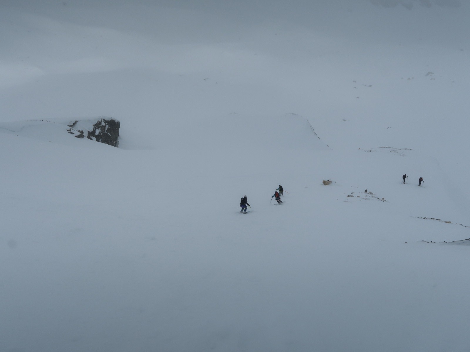 Nous maitrisons maintenant parfaitement le début du parcours qui chemine dans le lit de La Doire. A 2750, c'est jour blanc. Compliqué d'aller plus loin, nous redescendons dans une neige toujours très agréable à skier. Une éclaircie arrive pour nous motiver à remonter en direction du Grand Croux, un dôme sur l'itinéraire de Grand Vaudala. Sur le haut, nous skions une poudreuse réchauffée agréable dans le pentu. L'après-midi sera consacrée à la partie de tarot et autres jeux.