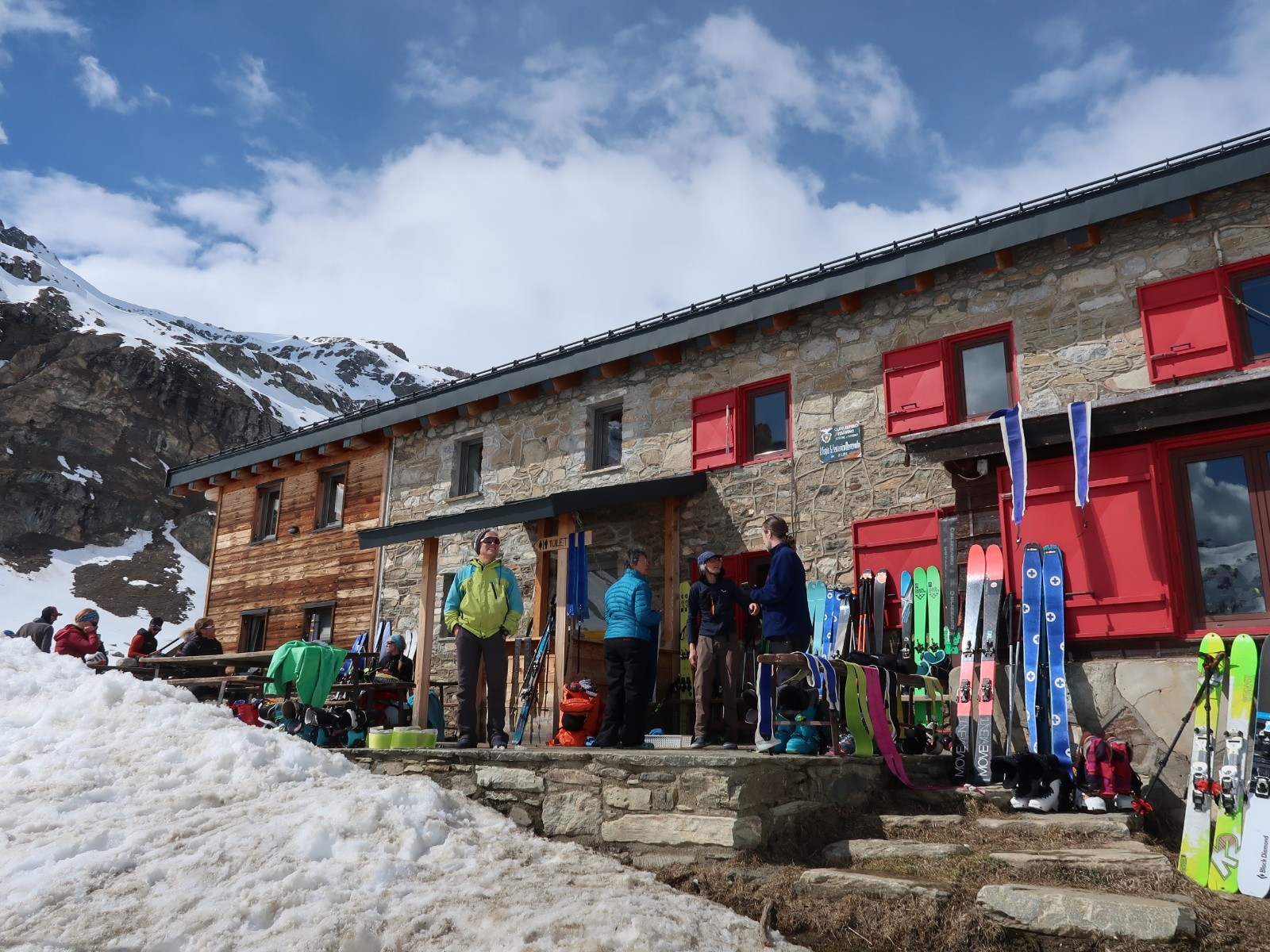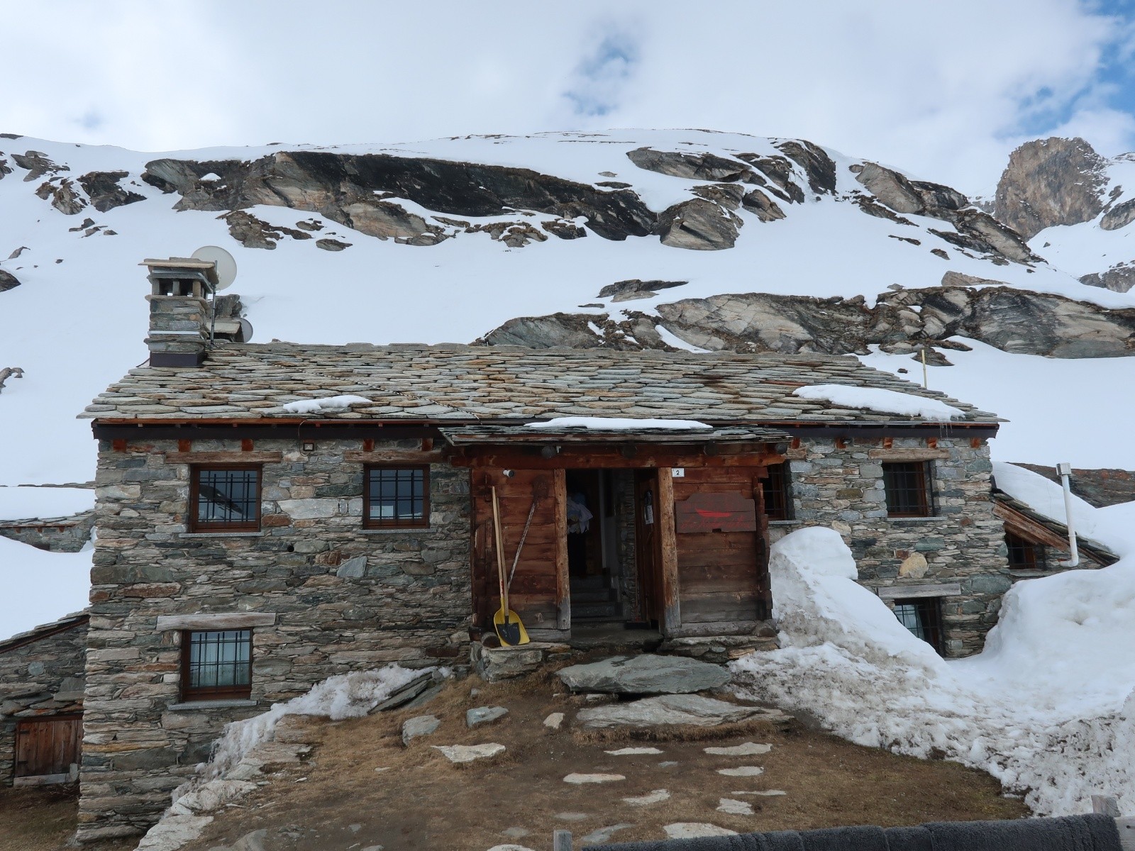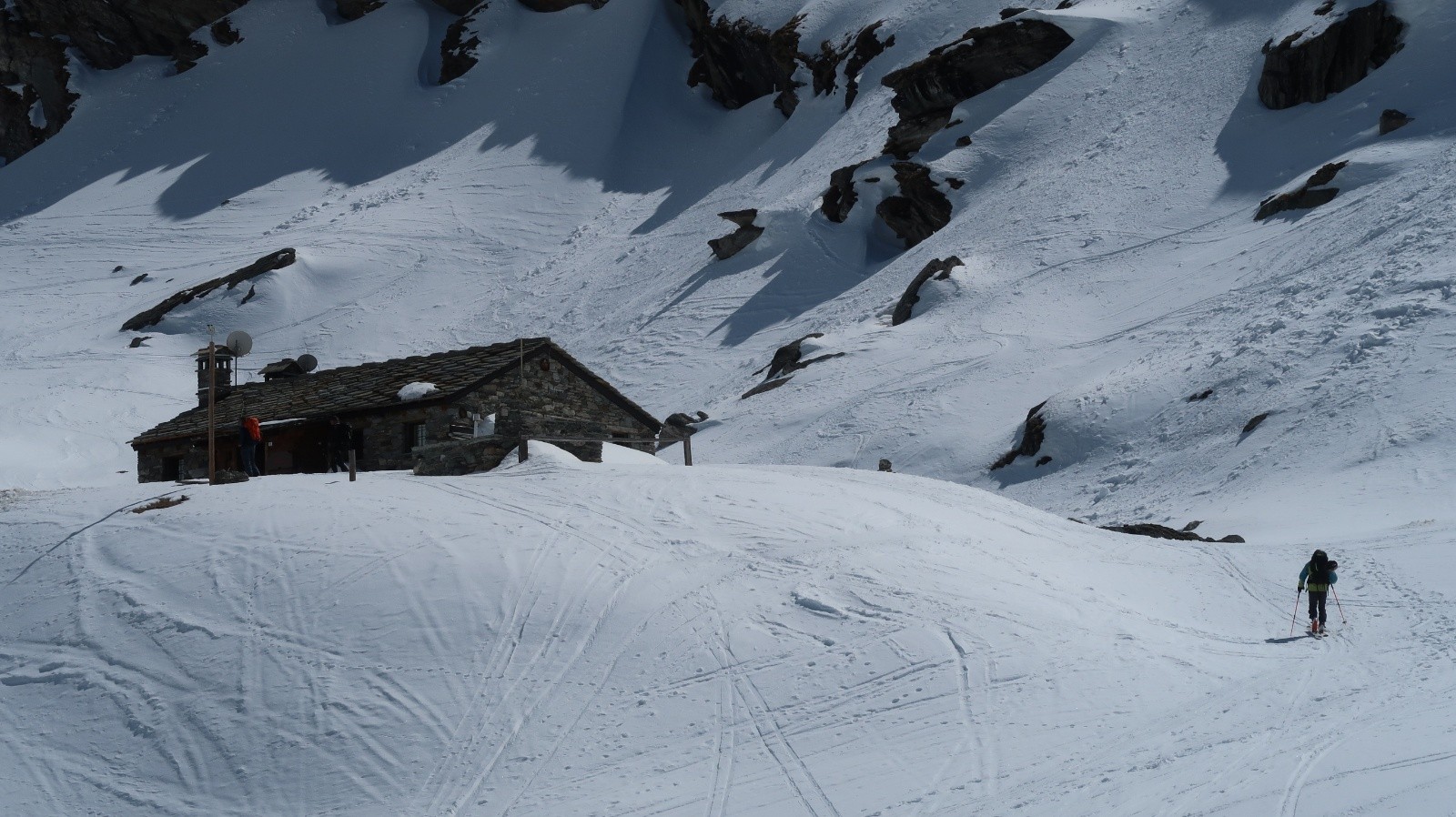 Nous chaussons les skis après 5 mn de portage en montant d'abord rive gauche puis rive droite le long de la Doire de Rhêmes. Nous découvrons le Refuge Bénévolo en milieu d'après-midi, l'accueil est parfait. La fin d'après-midi est l'occasion d'aller explorer les pentes à l'est du refuge en direction des Pointes Palettaz. Le temps nous manque pour atteindre un des deux sommets, ce sera partie remise. Cette première descente est bonne et nous met l'eau à la bouche pour la suite et la bière aussi!