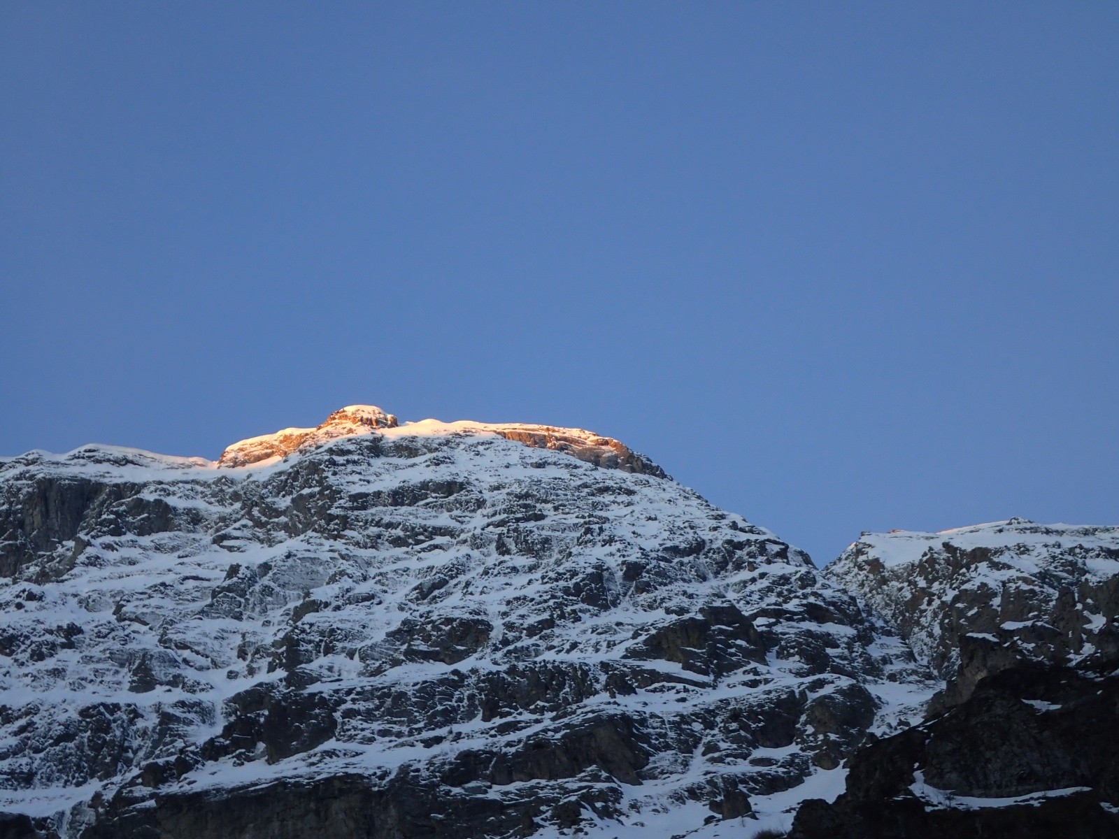 Ca marche bien cette saison. Mais je suis prêt à signer le premier but de l'année lorsque je vois ce ressaut vers 2200mètres, mentionné nulle part, je vois bien les traces de descente de mes prédecesseurs, plein axe sur la glace/cailloux (lundi ça devait être neige!), j'ai tenté d'y monter mais c'était franchement foireux. Alors pour info je suis passé rive droite à la montée, ça passait bien, 3 mètres avec de la glace et du rocher avec bonne prise. Puis je me suis rendu compte que des traces arrivaient de la rive gauche, et à la descente étant curieux je suis passé par là, et ça passe bien aussi, déneigé, un pas d'escalade de 2 mètre sur l'arête puis un chemin à chamois ramène à la neige. Ce passage doit passer tout le temps en cas d'hiver sec, ce qui semble être la tendance actuelle. Celui rive droite plus variable. Je n'avais qu'un piolet et je l'ai regretté, en sachant que je ne suis pas un spécialiste de la discipline, mais finalement ça passait très bien comme ça.