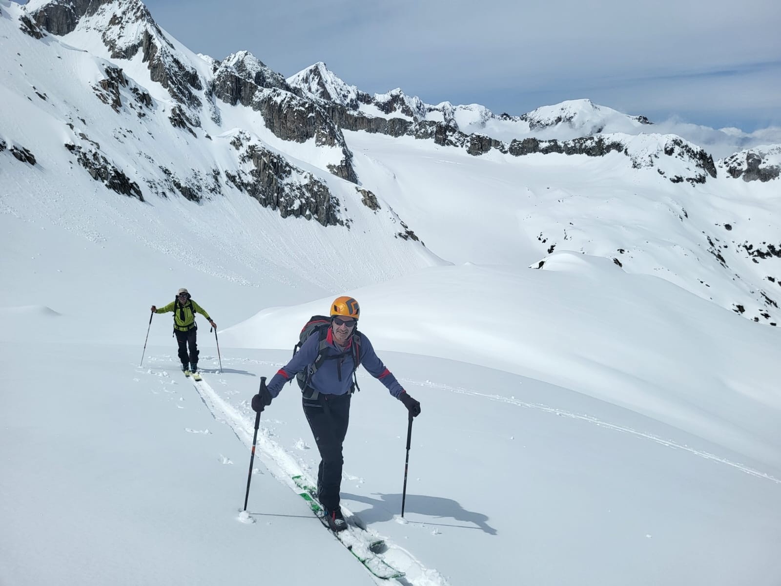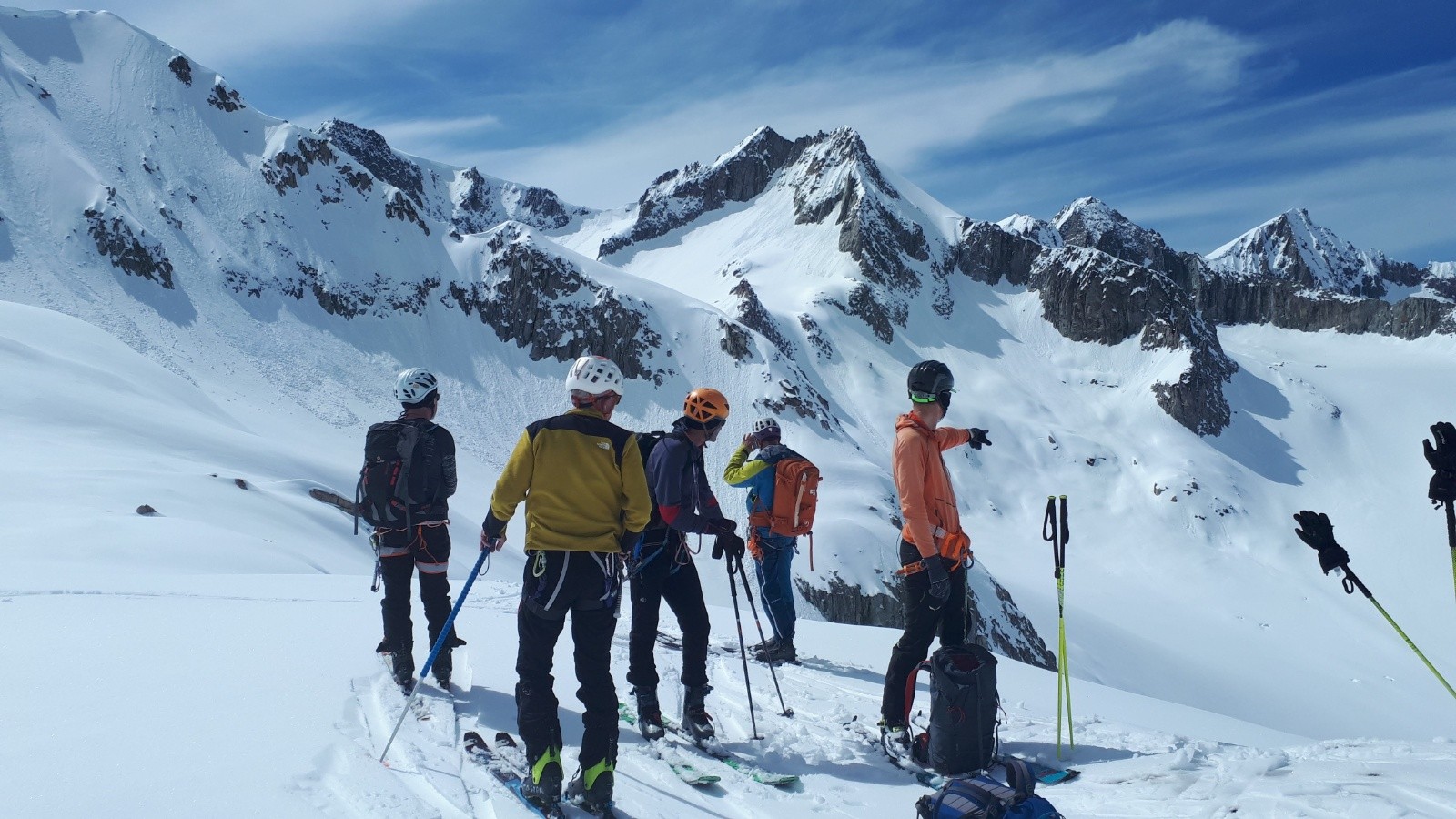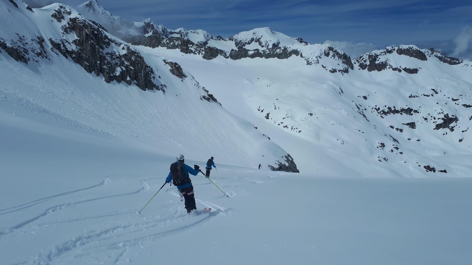 On file sur le bout de glacier pour de beaux virages poudreux, jusqu'à environ 2800 pour certains. Et on rejoint une épaule pour revenir vers le versant de montée. Nous choisissons un autre collu plus bas, et après une courte remontée de 108m (vendue pour 60-70m max ! 😋), on retrouve les pentes au-dessus du refuge, en lourdasse façon sous-marin ou ski-nautique, selon la largeur des patins. On retrouve Francis qui a bien récupéré. Heureusement il n'a pas sifflé toutes les binouzes, ouf !