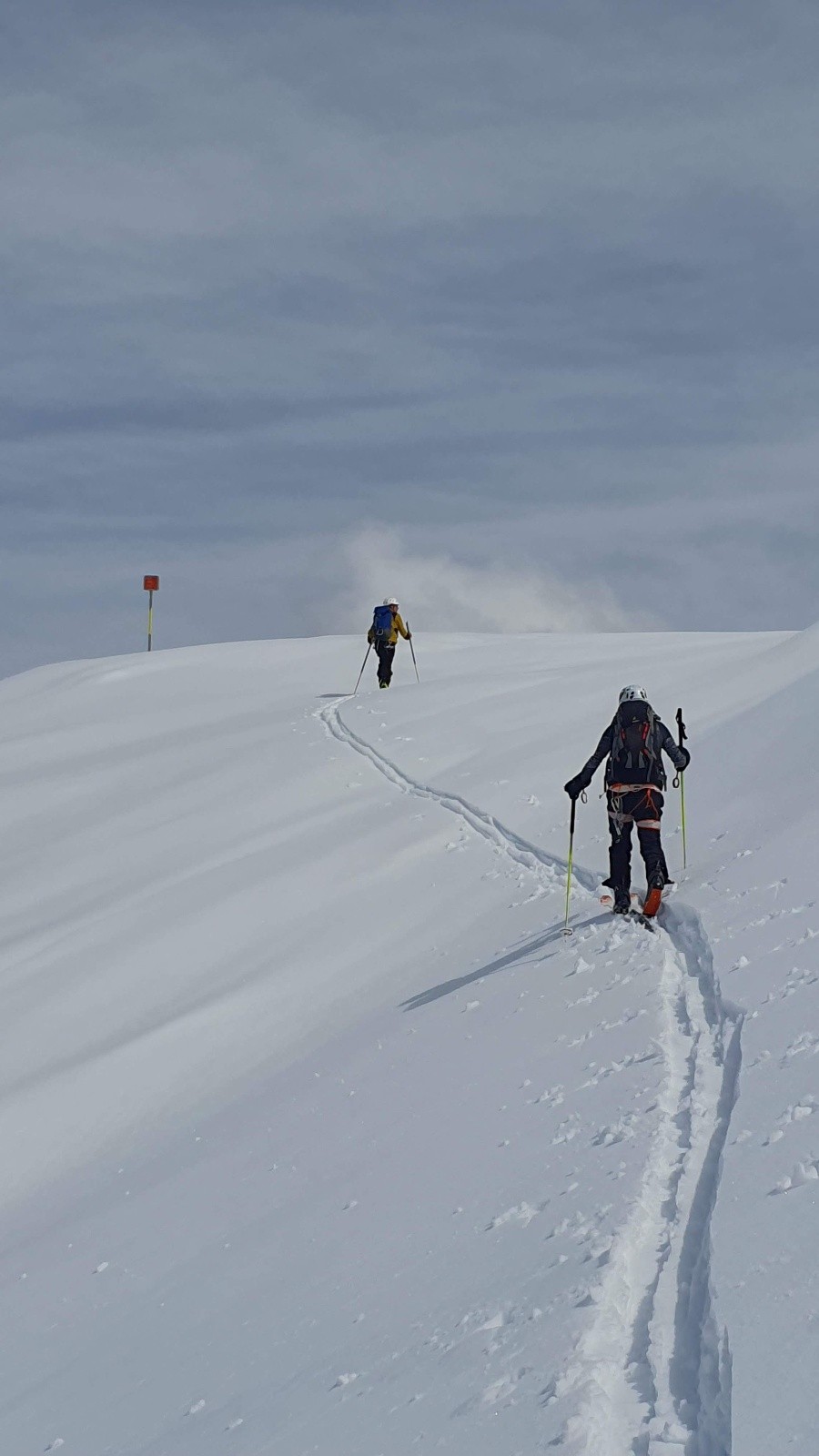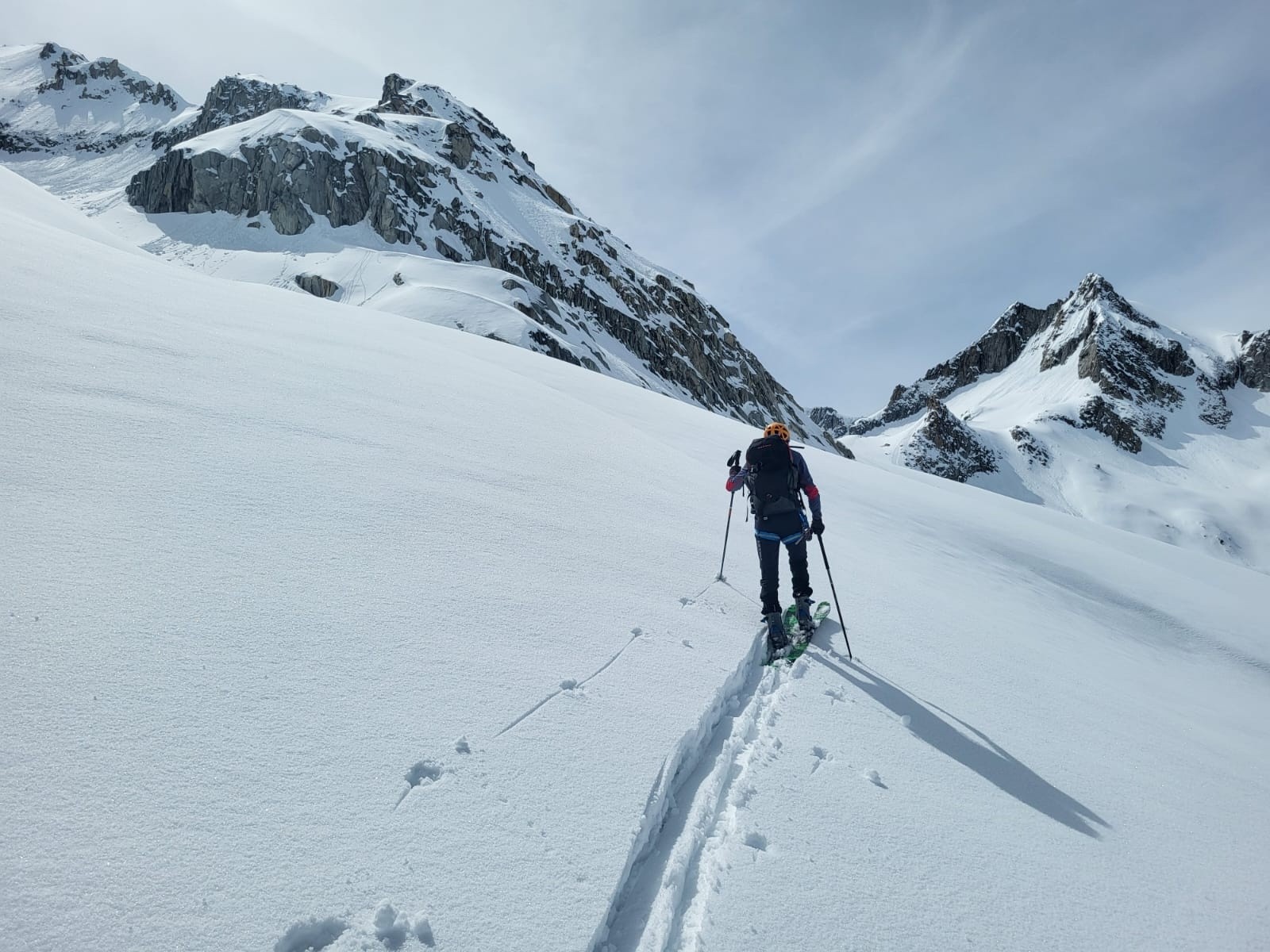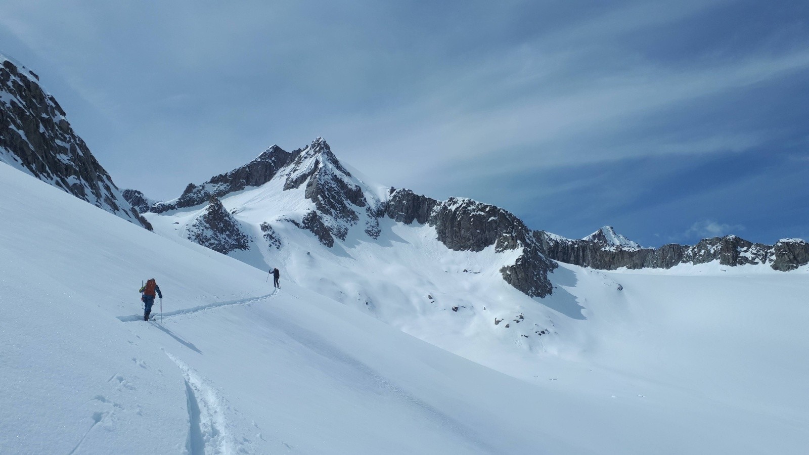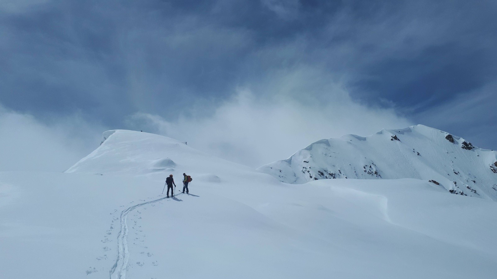 On file sur le bout de glacier pour de beaux virages poudreux, jusqu'à environ 2800 pour certains. Et on rejoint une épaule pour revenir vers le versant de montée. Nous choisissons un autre collu plus bas, et après une courte remontée de 108m (vendue pour 60-70m max ! 😋), on retrouve les pentes au-dessus du refuge, en lourdasse façon sous-marin ou ski-nautique, selon la largeur des patins. On retrouve Francis qui a bien récupéré. Heureusement il n'a pas sifflé toutes les binouzes, ouf !