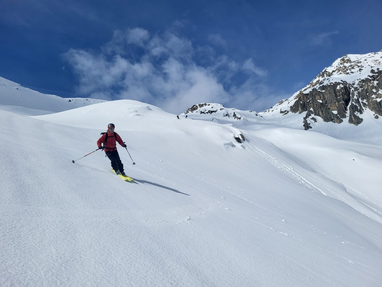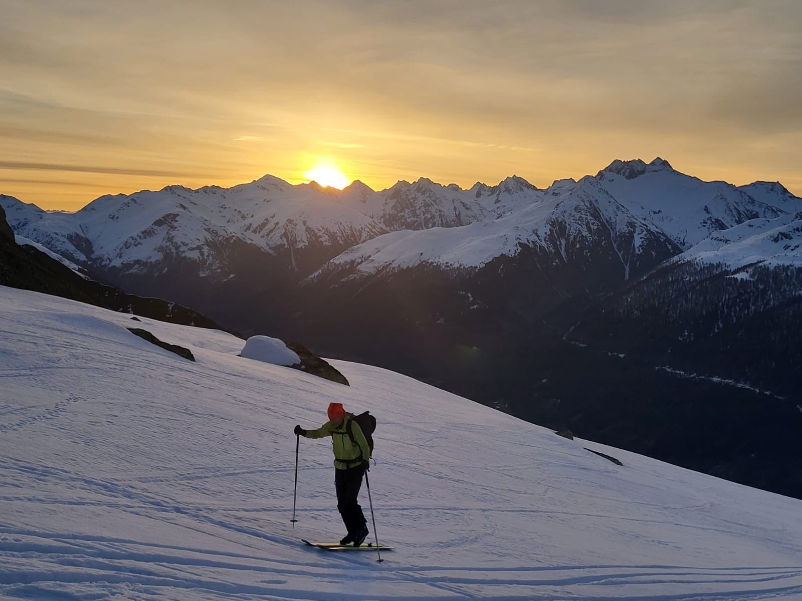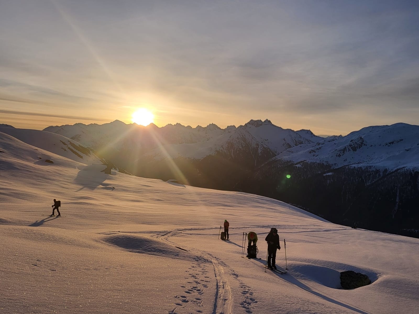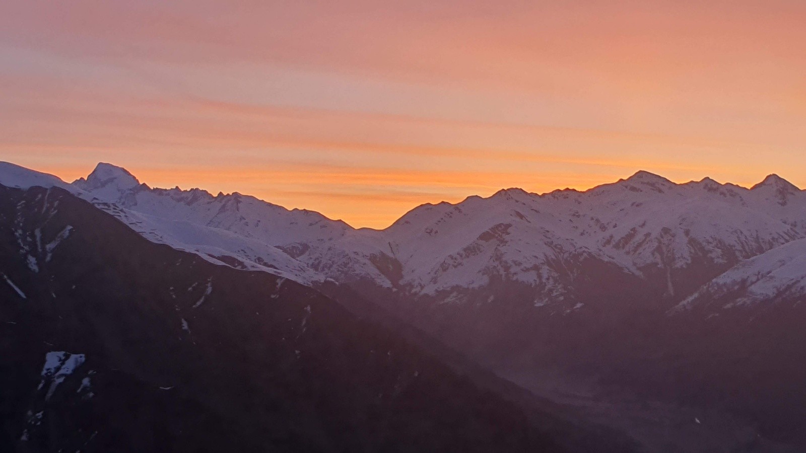 Après nos escapades précédentes, ICI et LA, nous remontons à notre sommet de la veille, pour envisager une descente NE dans le vallon de Minstigertal en empruntant un défilé esthétique. Nous partons tôt pour profiter d'un bon regel après la nuit claire. Le lever de soleil est splendide. Les sommets lointains s'allument les uns après les autres. Nous profitons aussi de la trace de la veille, en découvrant des passages qui étaient restés quelque peu opaques lors du la montée précédente dans les nuages. Heji Zwächte, nous revoilà ! La neige est ferme avec juste ce qu'il faut de revenu en surface entre le sommet et jusqu'à environ 2400 et un ressaut plus raide. Ensuite, c'est combat dans la polenta ou la croûtée, en évitant quelques boules. C'est que ce passage aurait été inenvisageable la veille avec la douceur et le non-regel. Beaucoup trop dangereux. Aujourd'hui, c'est bien mieux et notre horaire est bien adapté. On finit dans le large vallon entrecoupé de grosses avalanches qui ont arraché de nombreux débris. Le genre de truc qui dégringole avec fracas. Un petit quart d'heure à pied sur un superbe chemin carrossable tapissé d'aiguilles de mélèze, et nous voilà de retour au parking. Les voitures nous attendent sagement. On peut rentrer à Grenoble tranquillement, des étoiles dans les yeux, des images plein la tête, et des moments partagés à se remémorer. Merci les amis pour votre sympathie, votre solidarité, et la bonne humeur du groupe. Merci Seb pour tes conseils avisés, ton expertise et le petit push au collectif pour se remettre en piste pour ce deuxième opus. Wundervolle Momente !
