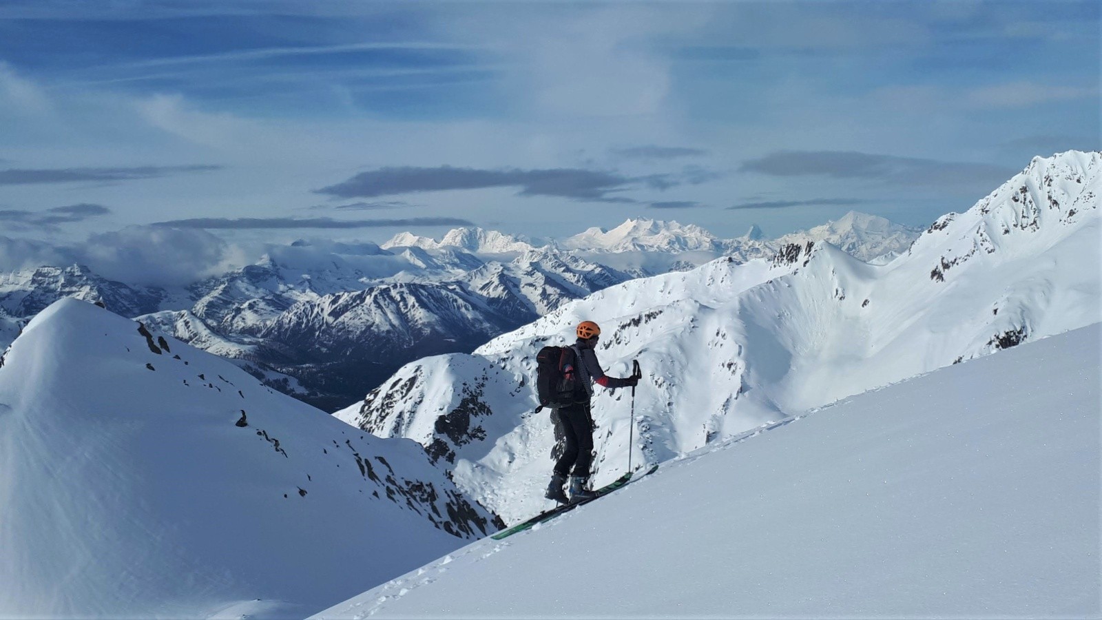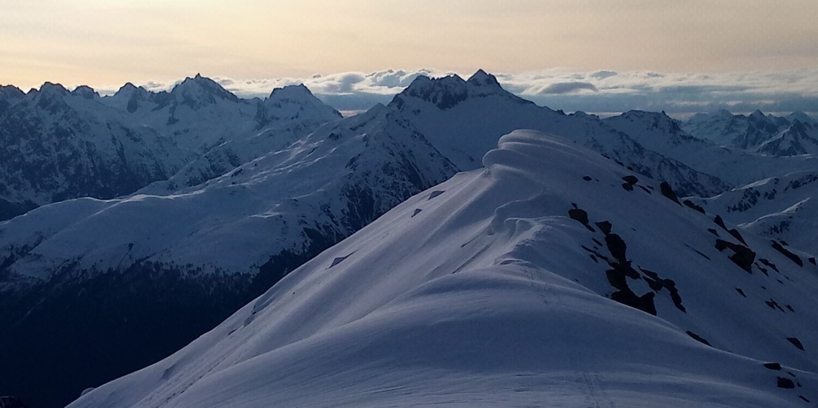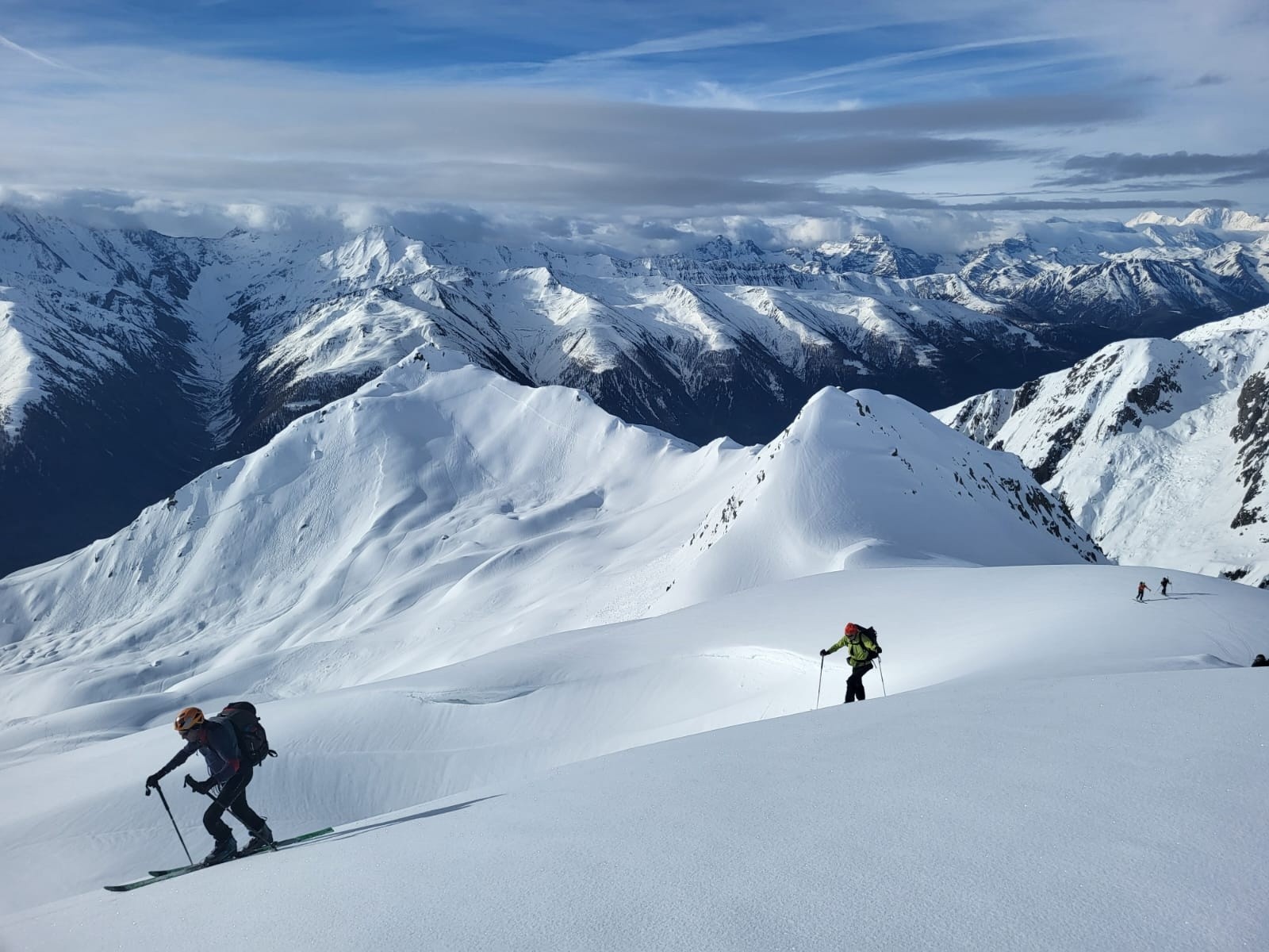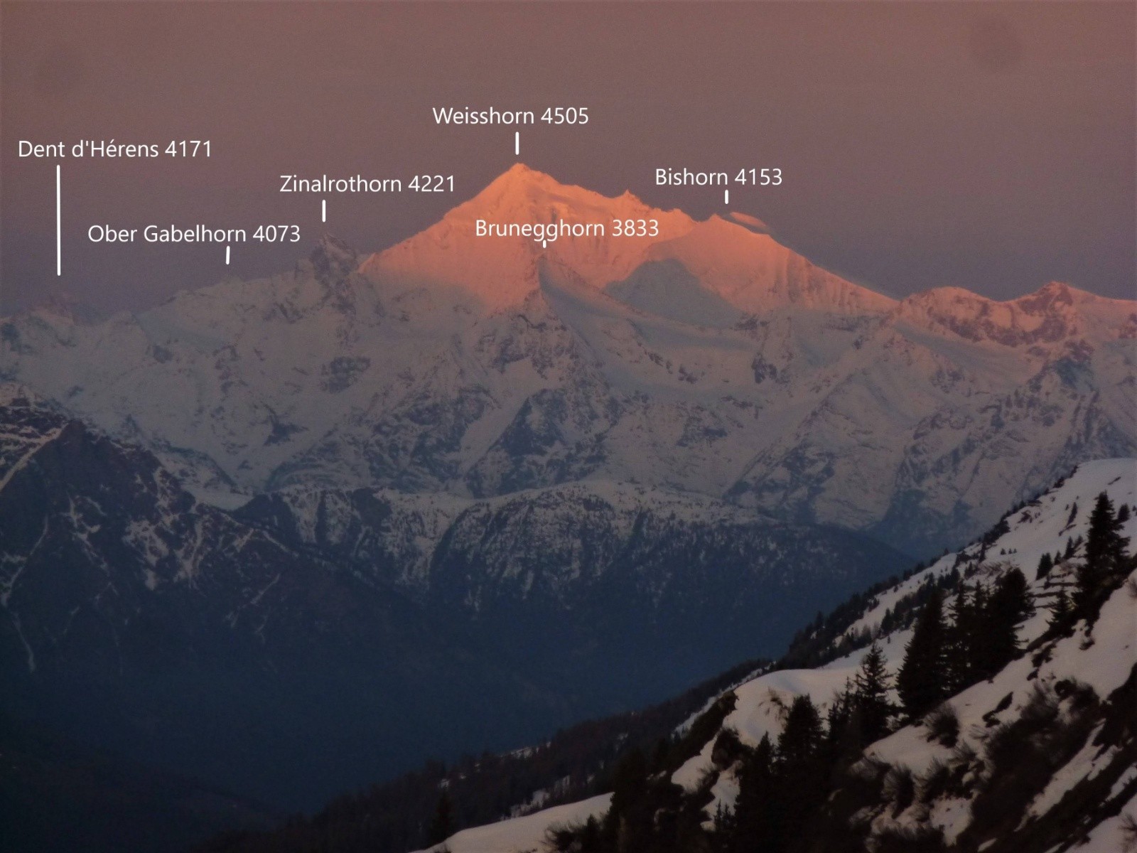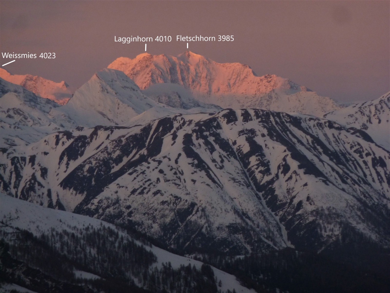 Après nos escapades précédentes, ICI et LA, nous remontons à notre sommet de la veille, pour envisager une descente NE dans le vallon de Minstigertal en empruntant un défilé esthétique. Nous partons tôt pour profiter d'un bon regel après la nuit claire. Le lever de soleil est splendide. Les sommets lointains s'allument les uns après les autres. Nous profitons aussi de la trace de la veille, en découvrant des passages qui étaient restés quelque peu opaques lors du la montée précédente dans les nuages. Heji Zwächte, nous revoilà ! La neige est ferme avec juste ce qu'il faut de revenu en surface entre le sommet et jusqu'à environ 2400 et un ressaut plus raide. Ensuite, c'est combat dans la polenta ou la croûtée, en évitant quelques boules. C'est que ce passage aurait été inenvisageable la veille avec la douceur et le non-regel. Beaucoup trop dangereux. Aujourd'hui, c'est bien mieux et notre horaire est bien adapté. On finit dans le large vallon entrecoupé de grosses avalanches qui ont arraché de nombreux débris. Le genre de truc qui dégringole avec fracas. Un petit quart d'heure à pied sur un superbe chemin carrossable tapissé d'aiguilles de mélèze, et nous voilà de retour au parking. Les voitures nous attendent sagement. On peut rentrer à Grenoble tranquillement, des étoiles dans les yeux, des images plein la tête, et des moments partagés à se remémorer. Merci les amis pour votre sympathie, votre solidarité, et la bonne humeur du groupe. Merci Seb pour tes conseils avisés, ton expertise et le petit push au collectif pour se remettre en piste pour ce deuxième opus. Wundervolle Momente !
