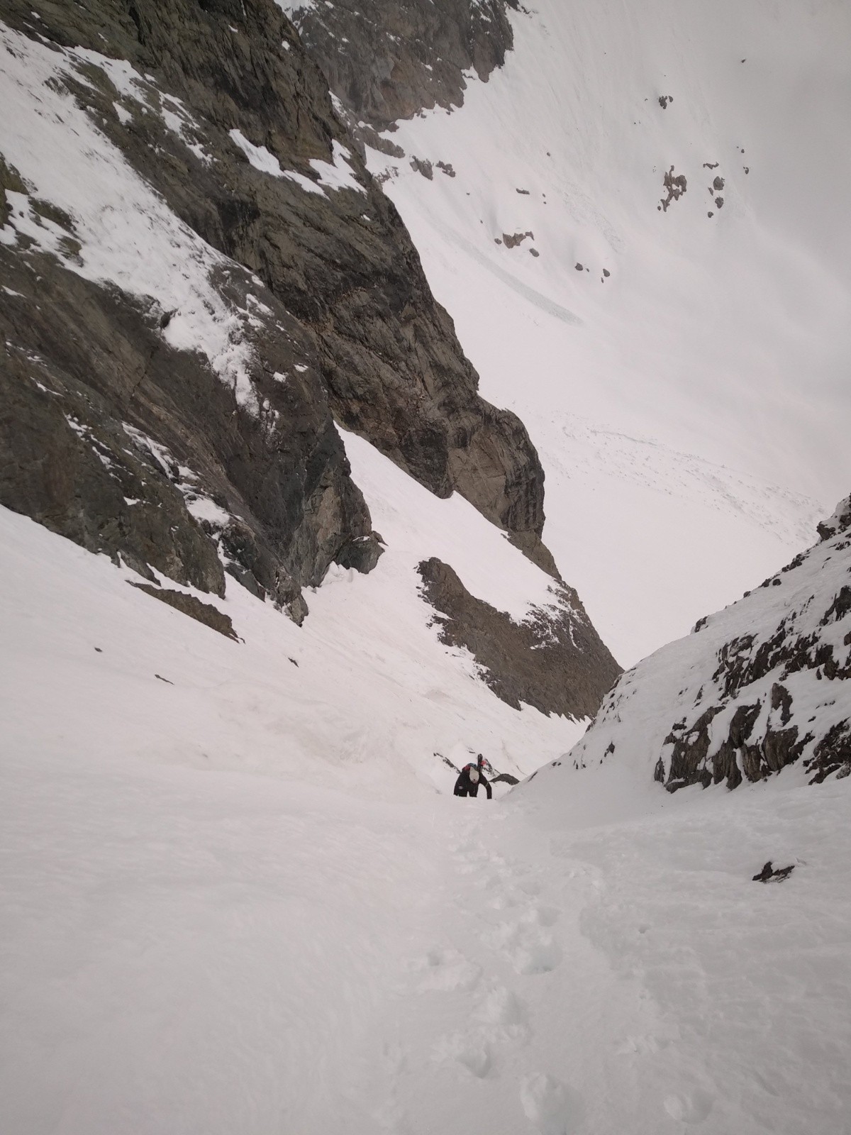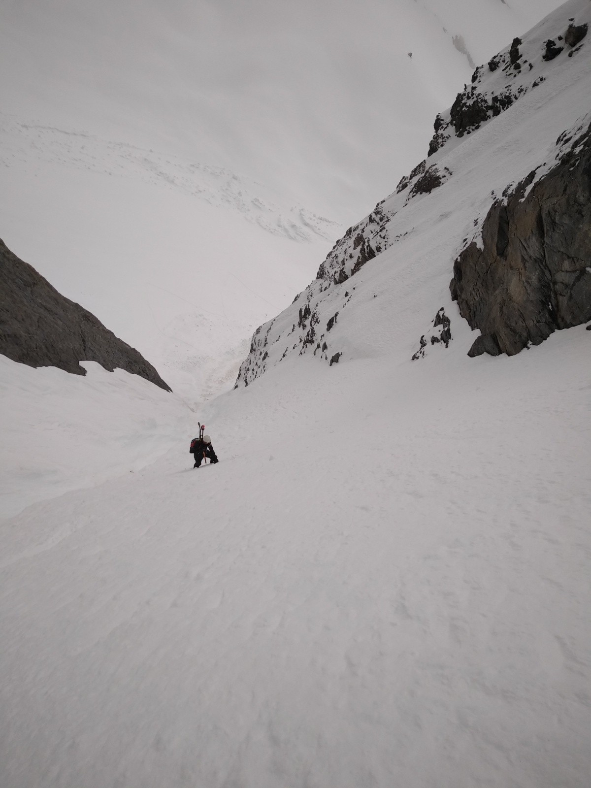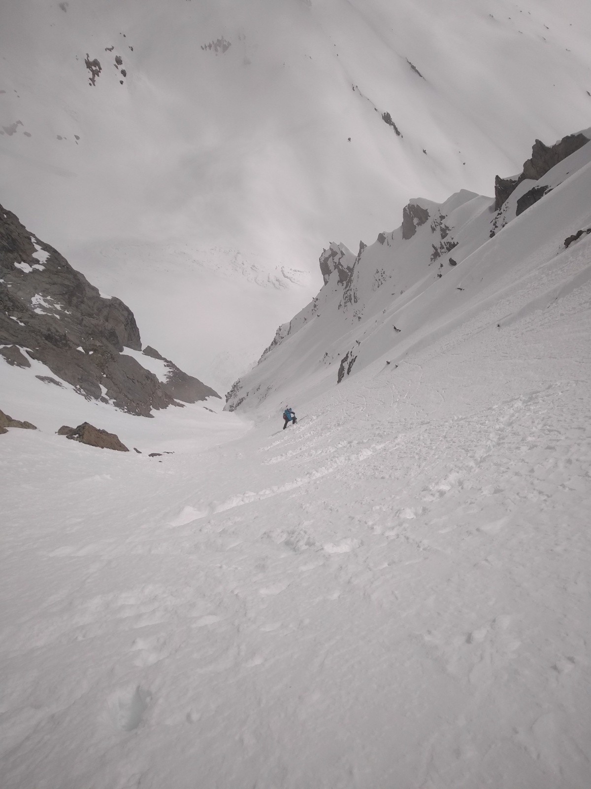 Itinéraire suivi : départ des chapieux a vélo jusqu'au bout de la route carrossable.ensuite montée en direction du refuge puis sur le glacier des lanchettes.le couloir apparaît sur la gauche.une grosse goulotte dans l'axe du coup on skié les rives avec un peu de neige fraîche.auccun regel sur tout l'itinéraire.