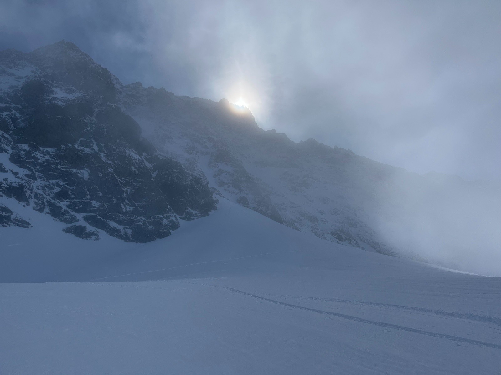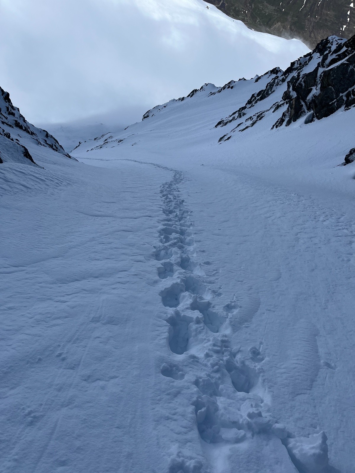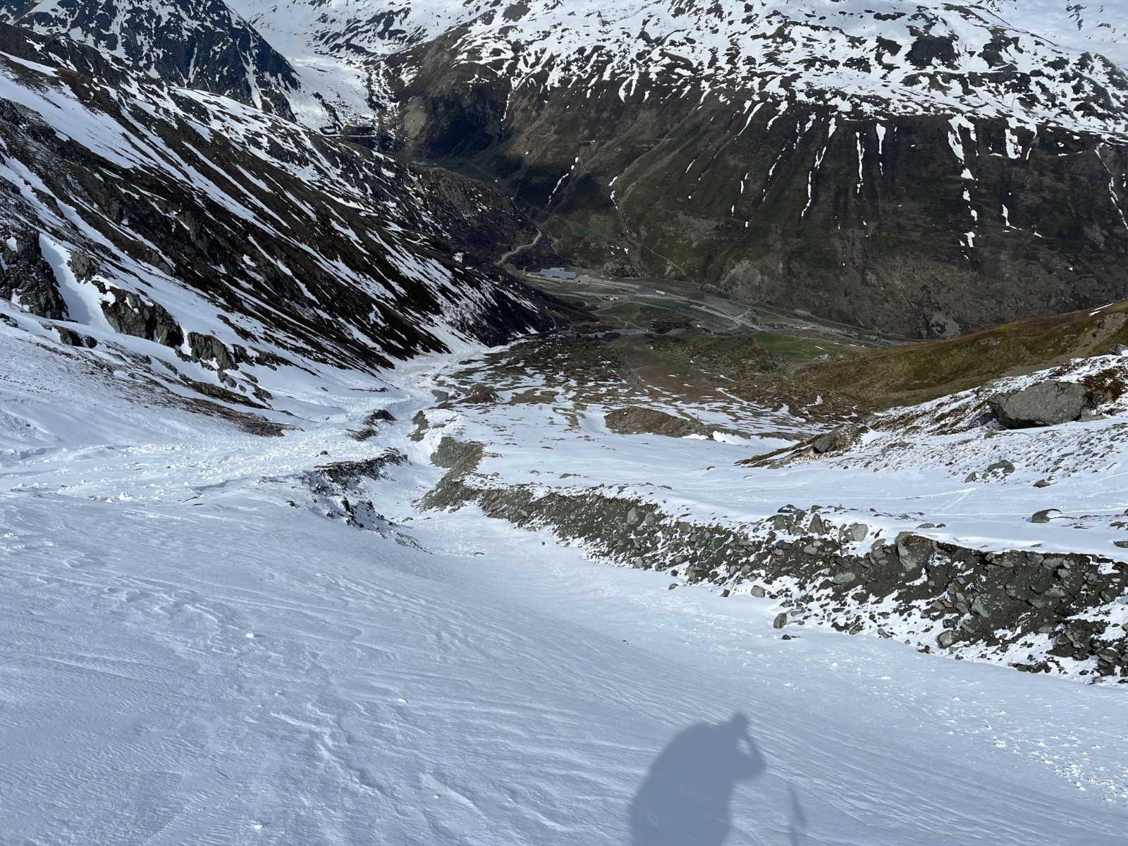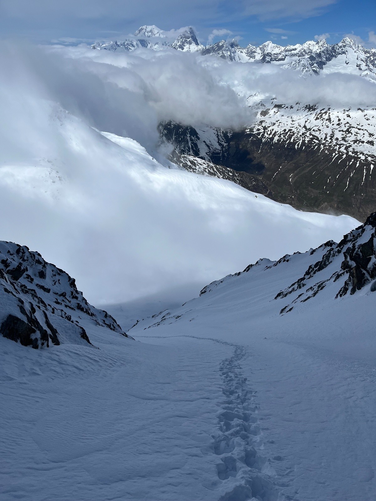 Envie de prendre l'air un peu, mais aussi des limitations d'horaire (retour avant 11h sur le parking). Des potes sont soit en vacances un peu partout en Europe, soit disent "la météo est vraiment dégue). ça commence pas très bien panne de réveil, du coup, départ 1-1h30 plus tard. Aussi j'ai complètement zappé qu'on peut pousser la voiture plus haut et gagner 25min à la montée et 15 à la descente. Bon, on commence avec 2h de moins sur l'horaire idéal. Par contre, côté météo c'est ciel bleu :) Montée efficace, par contre pas un âme vivant dans le coin, et donc traçage pour moi. Des nuages s'accrochent sur le glacier (comme souvent ici), je navigue un peu se basant sur l'Aiguille du Vélan que j'aperçois de temps-en-temps au dessus des nuages. A la base du couloir je sors des nuages (lesquelles complètement disparaissent 15min plus tard). Dans le couloir c'est moins drôle dès qu'on mets les crampons. Enfoncement jusqu'au genoux, donc on peu physique. Je vois assez rapidement qu'avec cette vitesse et les 2h perdus, ça va pas le faire pour sortir dans les temps, du coup je préfère d'avoir de la marge sur le retour. Du bon ski tout au long, en descendant avant 11h, même le bas est parfait. J'ai pris les avalanches rive gauche pour descendre le plus bas possible. C'était agréable de voir le soleil et prendre l'air pour garder un minimum de forme. Pour les photos j'ai pris le gros reflex sauf qu'il n'y avait pas de carte mémoire dedans et ça n'a rien dit me laissant de prendre plein de photos éphémères :(