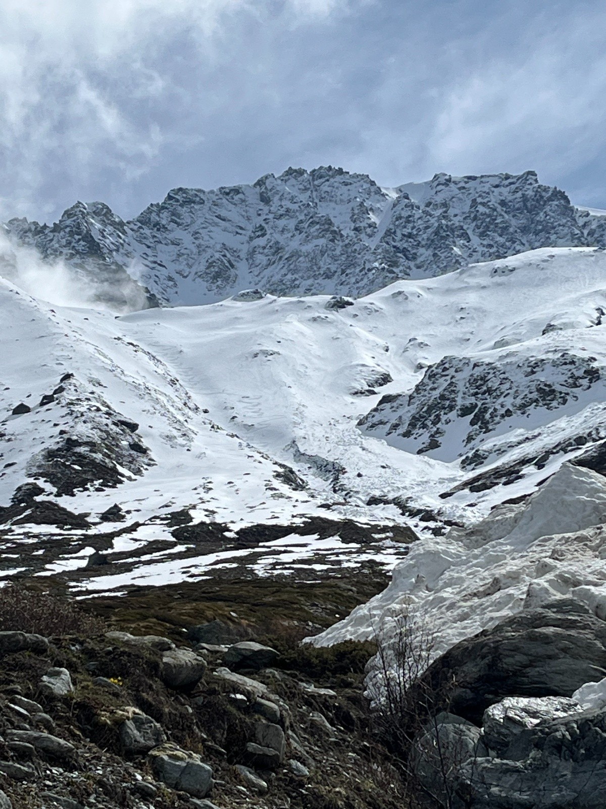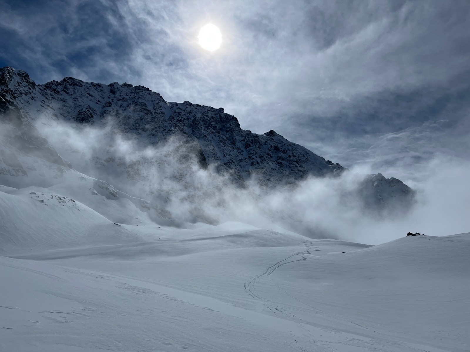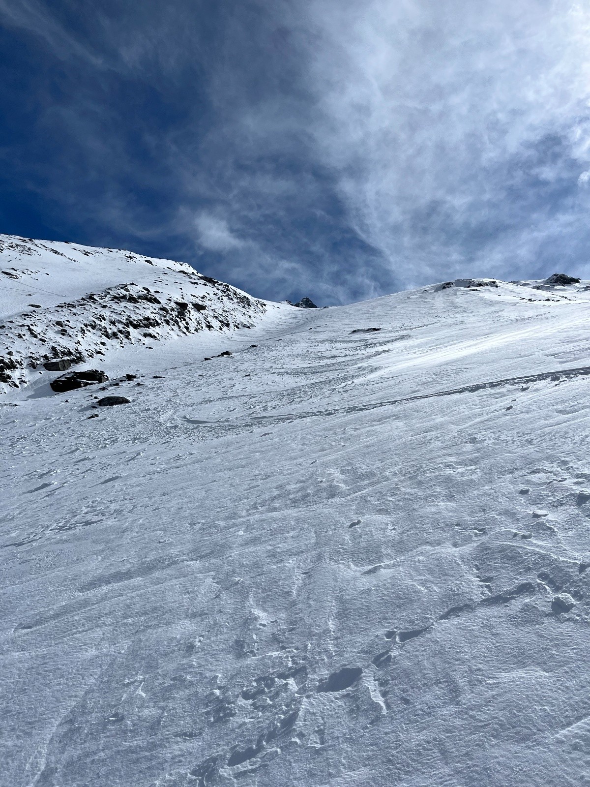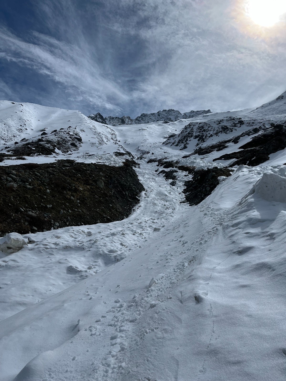 Envie de prendre l'air un peu, mais aussi des limitations d'horaire (retour avant 11h sur le parking). Des potes sont soit en vacances un peu partout en Europe, soit disent "la météo est vraiment dégue). ça commence pas très bien panne de réveil, du coup, départ 1-1h30 plus tard. Aussi j'ai complètement zappé qu'on peut pousser la voiture plus haut et gagner 25min à la montée et 15 à la descente. Bon, on commence avec 2h de moins sur l'horaire idéal. Par contre, côté météo c'est ciel bleu :) Montée efficace, par contre pas un âme vivant dans le coin, et donc traçage pour moi. Des nuages s'accrochent sur le glacier (comme souvent ici), je navigue un peu se basant sur l'Aiguille du Vélan que j'aperçois de temps-en-temps au dessus des nuages. A la base du couloir je sors des nuages (lesquelles complètement disparaissent 15min plus tard). Dans le couloir c'est moins drôle dès qu'on mets les crampons. Enfoncement jusqu'au genoux, donc on peu physique. Je vois assez rapidement qu'avec cette vitesse et les 2h perdus, ça va pas le faire pour sortir dans les temps, du coup je préfère d'avoir de la marge sur le retour. Du bon ski tout au long, en descendant avant 11h, même le bas est parfait. J'ai pris les avalanches rive gauche pour descendre le plus bas possible. C'était agréable de voir le soleil et prendre l'air pour garder un minimum de forme. Pour les photos j'ai pris le gros reflex sauf qu'il n'y avait pas de carte mémoire dedans et ça n'a rien dit me laissant de prendre plein de photos éphémères :(