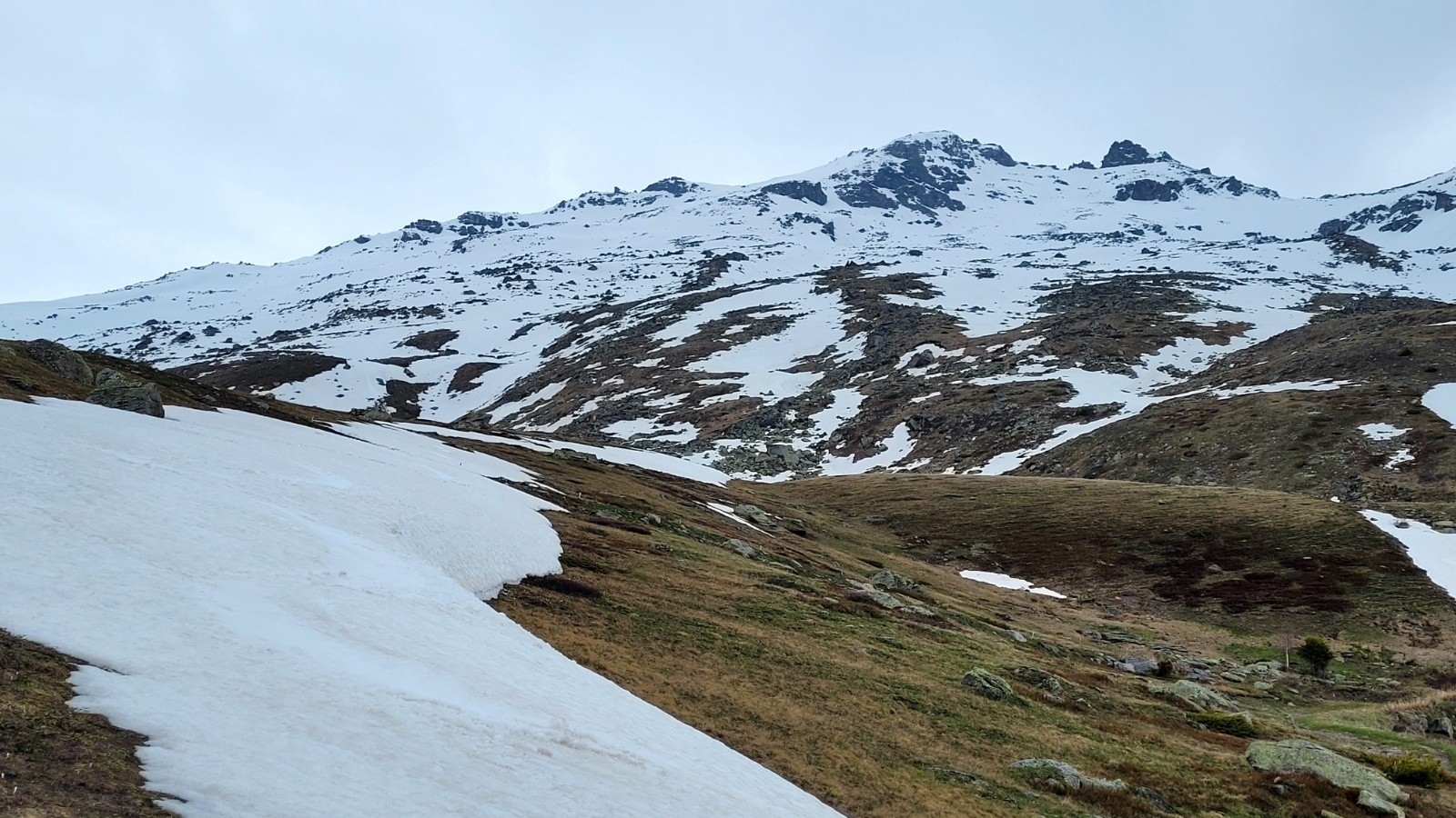 Fin de la descente sur une grosse langue de neige vers 2150 soit presque 1000 m. Hormis un gypaète qui a dû se demander ce que je faisais là, le désert.