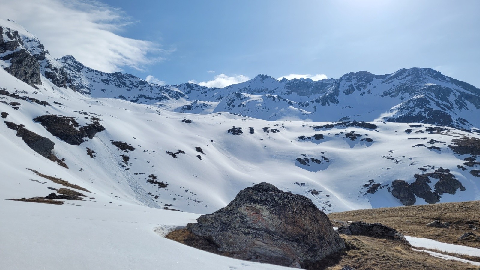 Une première sur ce secteur. Magnifique entrée en matière avec le panorama au Fond d’Aussois, un bout du monde superbe. On peut chausser à ce niveau et remonter les pentes jamais raides qui mènent vers le Plan de la Gorma. Attention à bien repérer le col de Labby assez discret. La dernière partie raide nécessite les couteaux. Fin sur la crête Nord peu avant le point 3390 trop chaotique. Superbe vue sur la Parrachée puissante et sauvage.