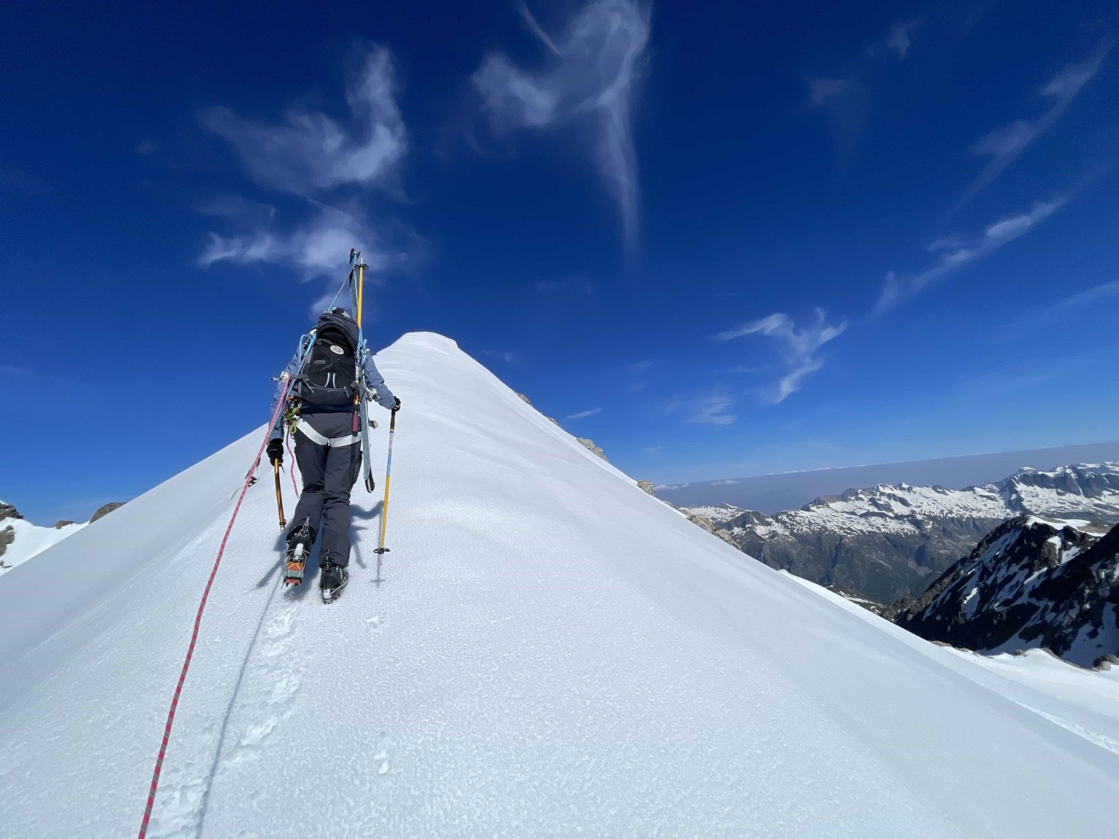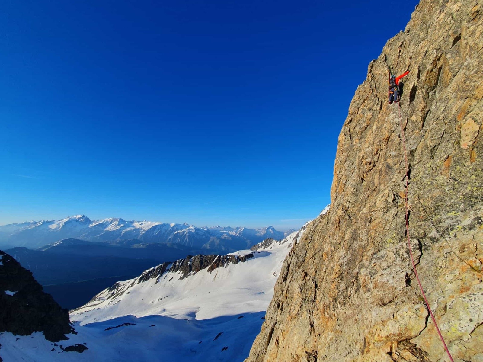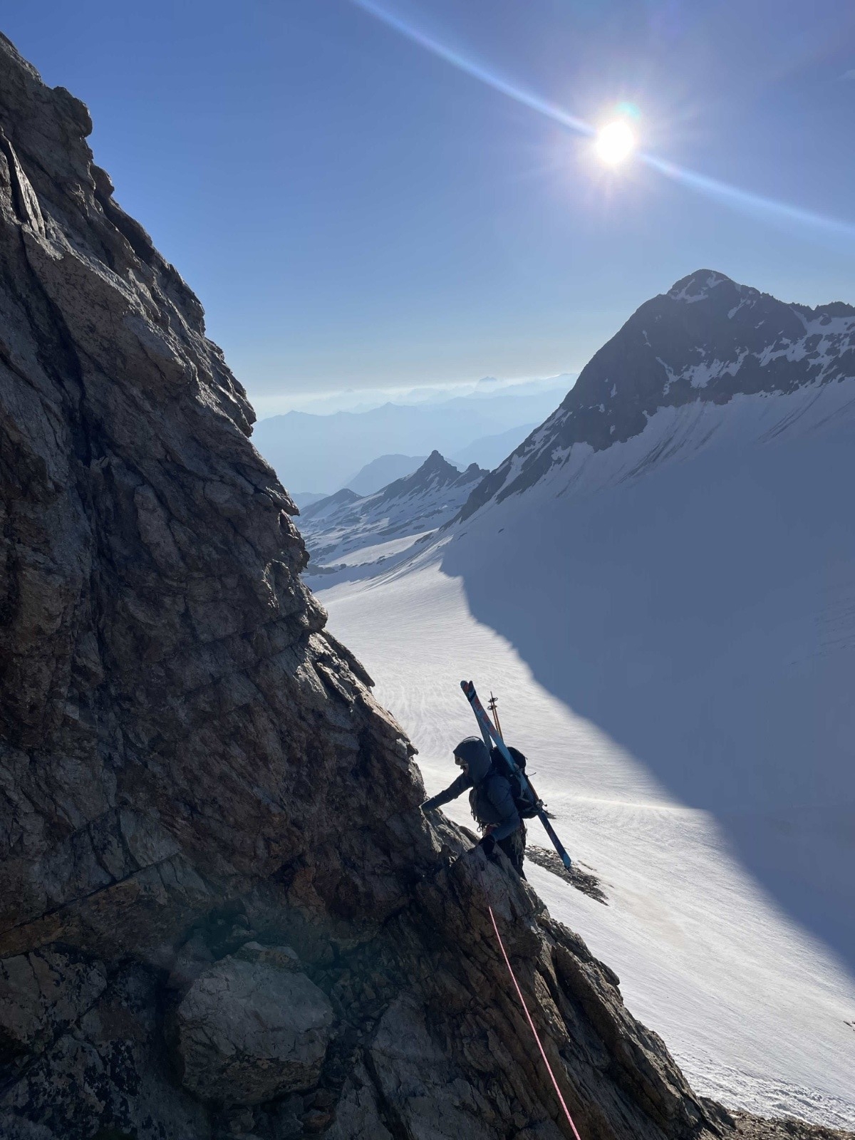 Itinéraire suivi : Nous sommes montés dormir au refuge de l'étendard. Puis ce matin réveil aux aurores, et départ pour le pied de l'arête ESE de l'étendard. Superbe arête, assez facile, en tout cas se prêtant bien à la grimpe skis sur le dos (pas de renfougne ou de devers). Deuxième moitié de l'arête tout en neige qui porte bien ! Hyper esthétique.