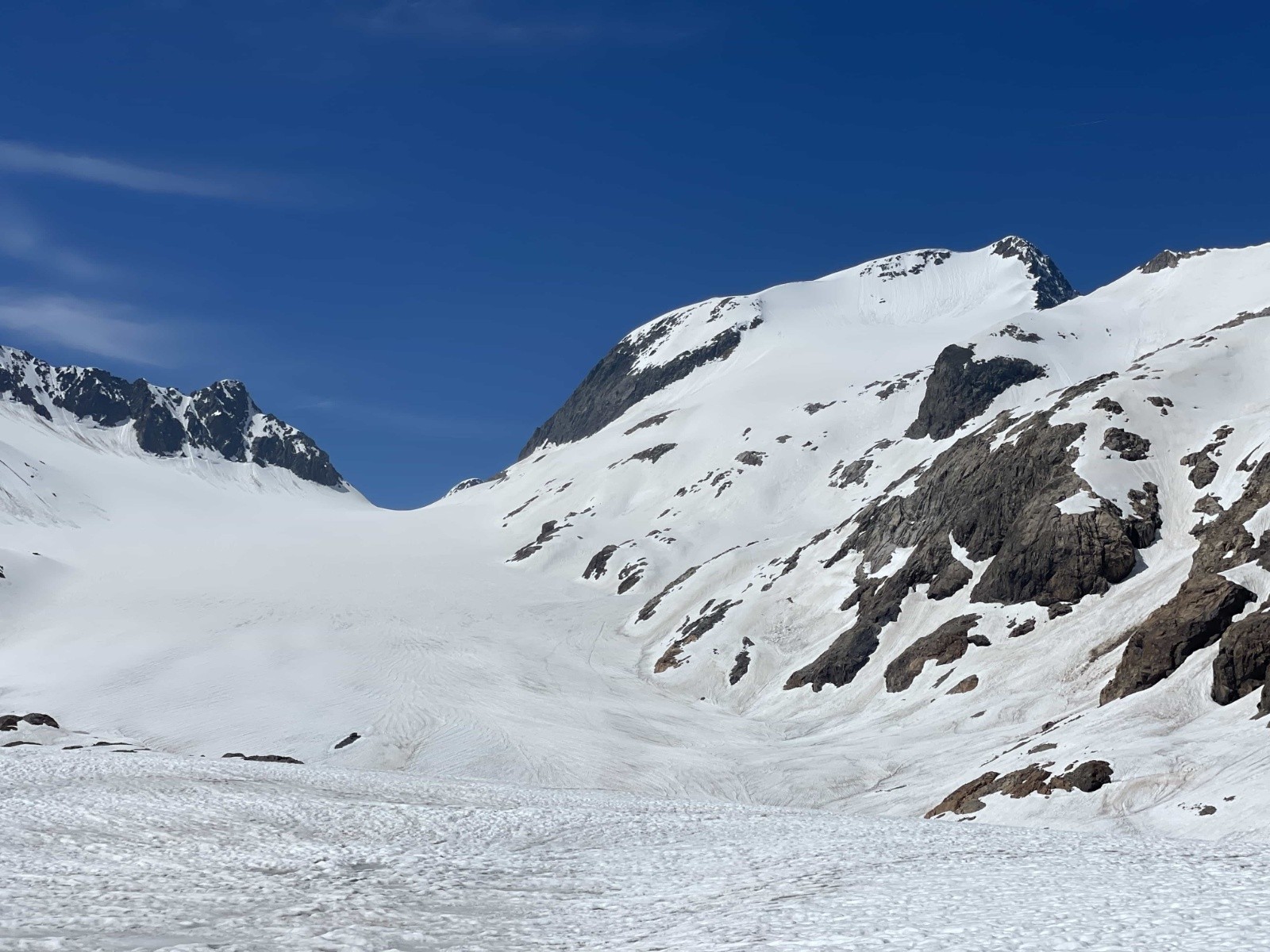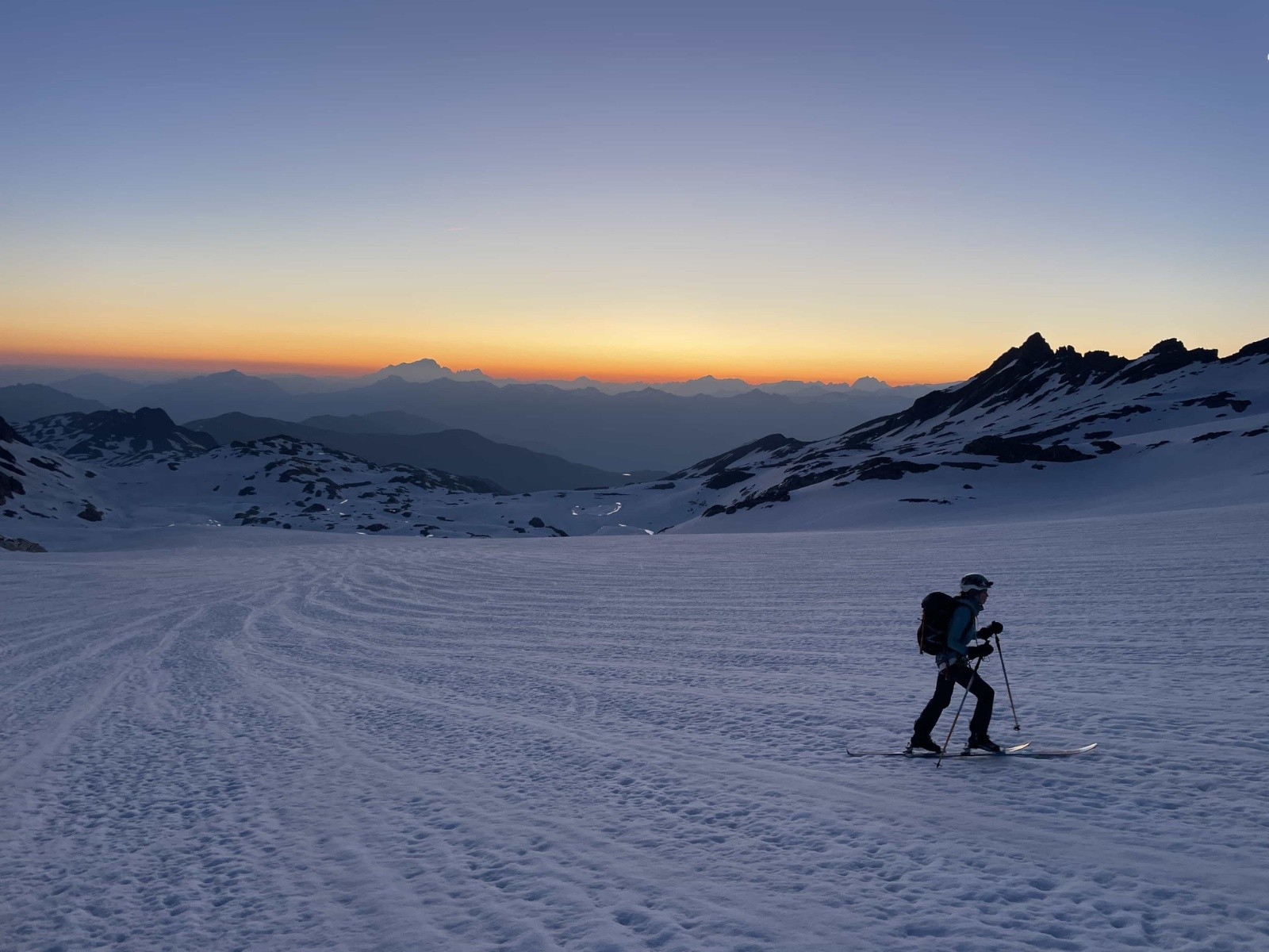 Conditions pour le ski : bon du sommet au bas du glacier, compliqué ensuite, ça masse bien les jambes, à cause des nombreux reliefs causés par la pluie.