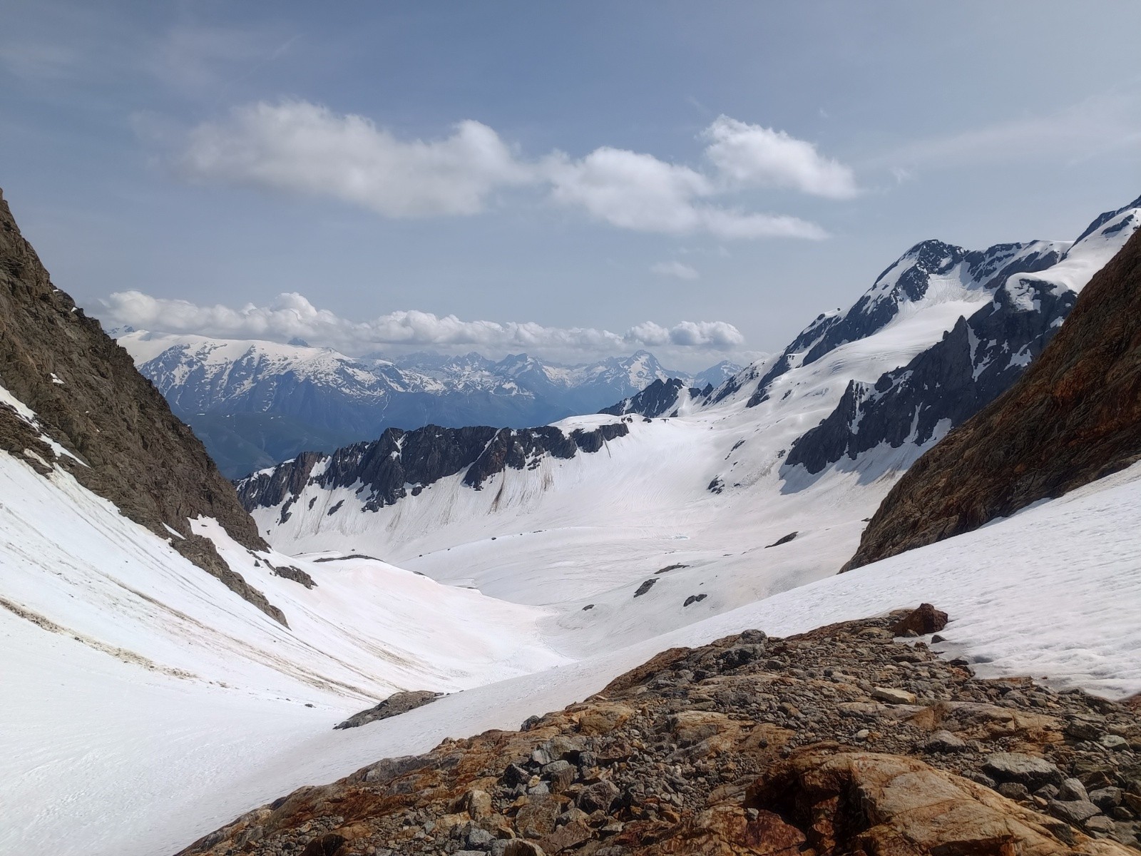 Là çà décaillait lentement sous les skis, arrivée au bas de la Laisse, je me suis ainsi dit que si çà trainais à décailler en profondeur, la descente de la Laisse serait tendu voir très piégeuse, en gros de quoi ne pas profiter de la pente avec cette neige défoncée, autant ainsi aller voir le glacier, ayant le temps d'aller assez loin, autant voir où me menait ce long chemin que j'ai toujours voulu faire jusqu'au bout.