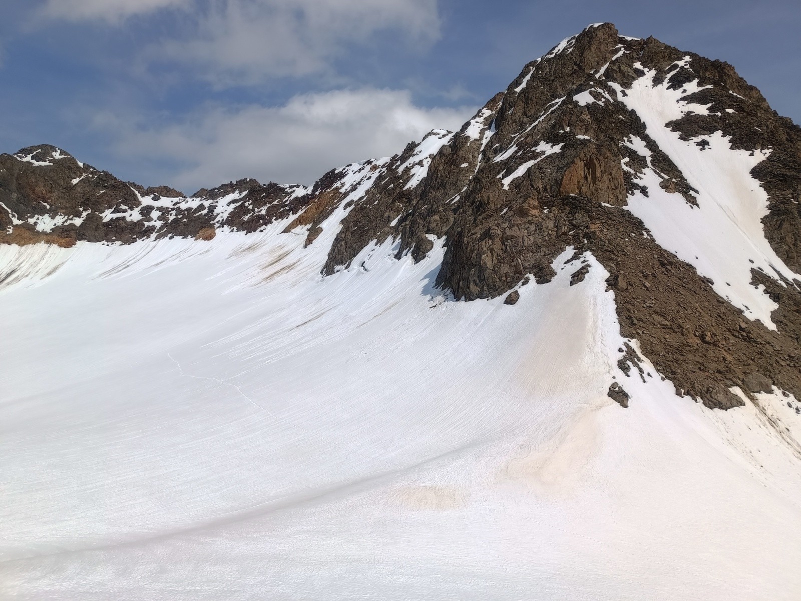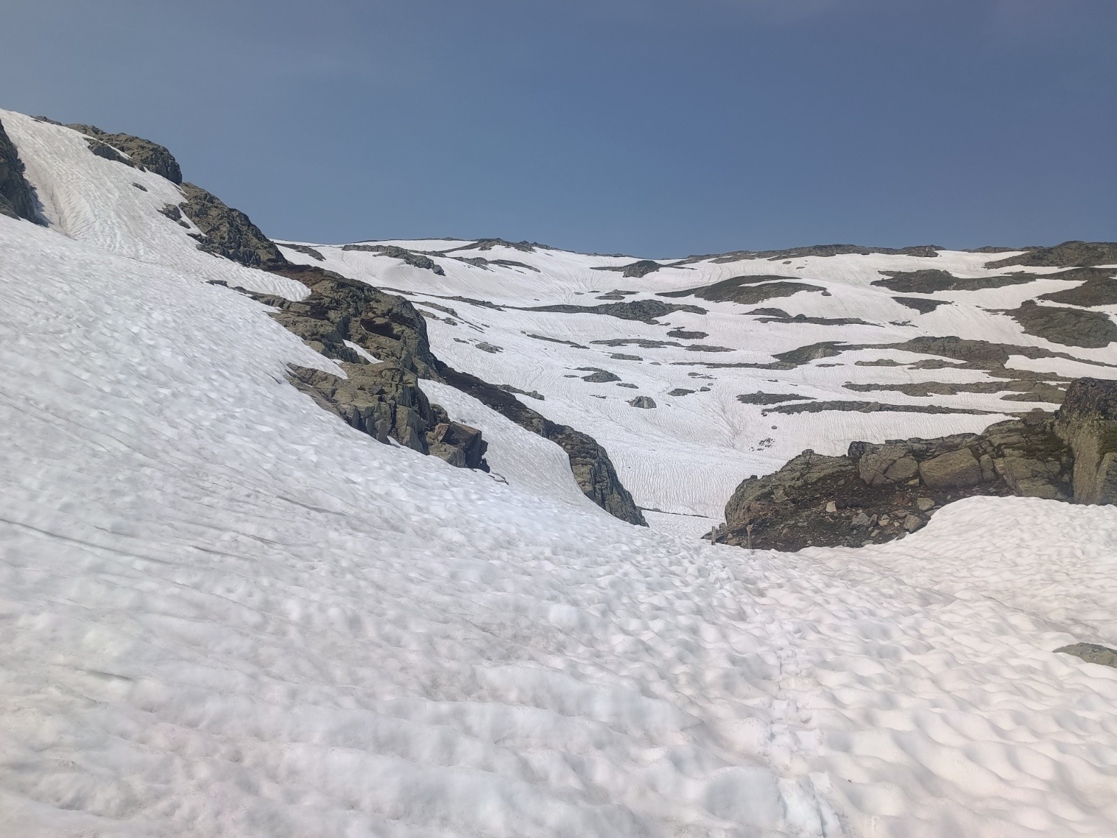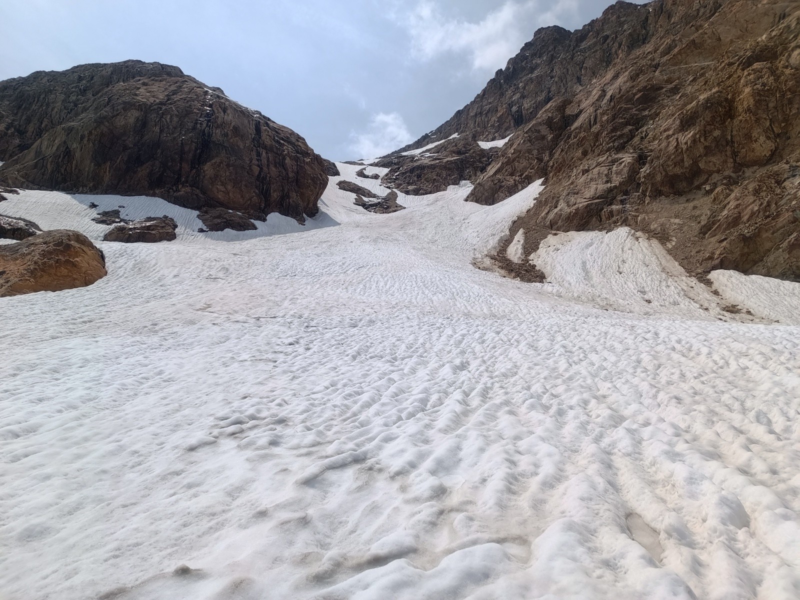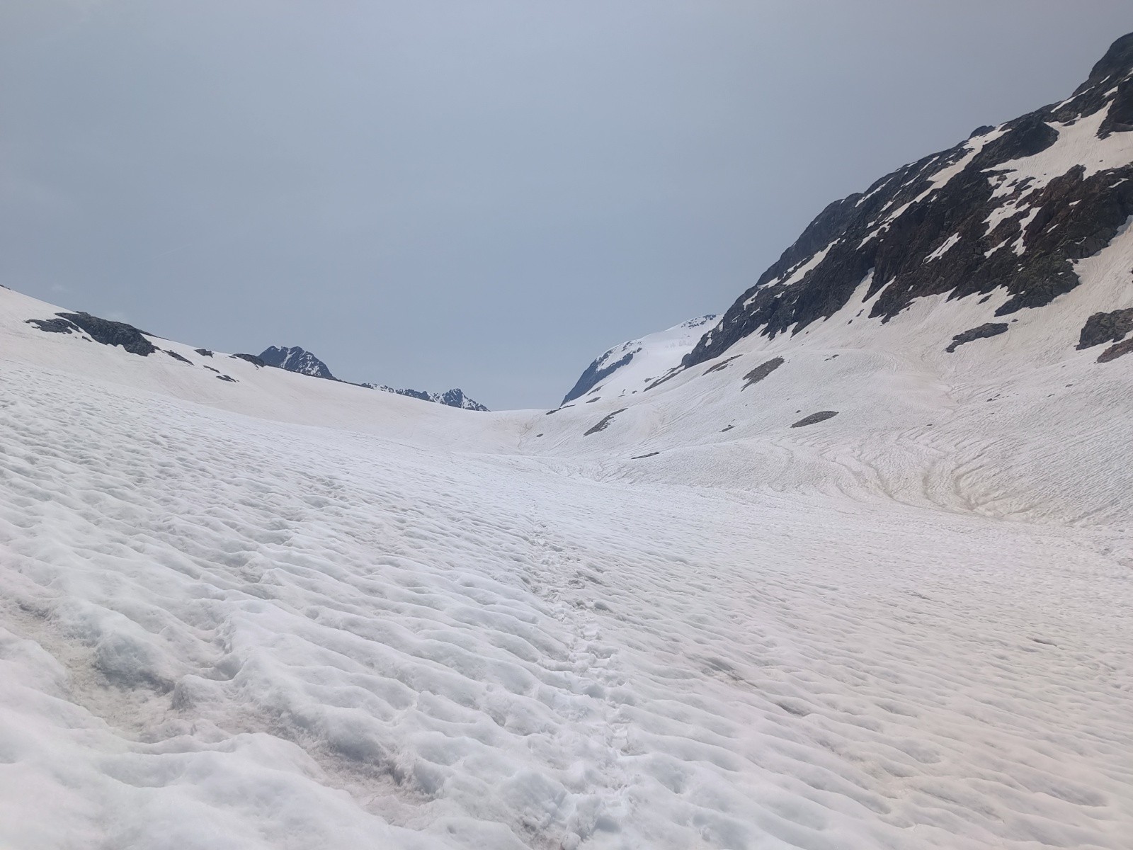 Heureusement, les pentes sont assez plates dans cette région si on vise le glacier car mon idée première était une aiguille de laisse puis trainouillage autour des lacs une fois la neige devenue soupe.