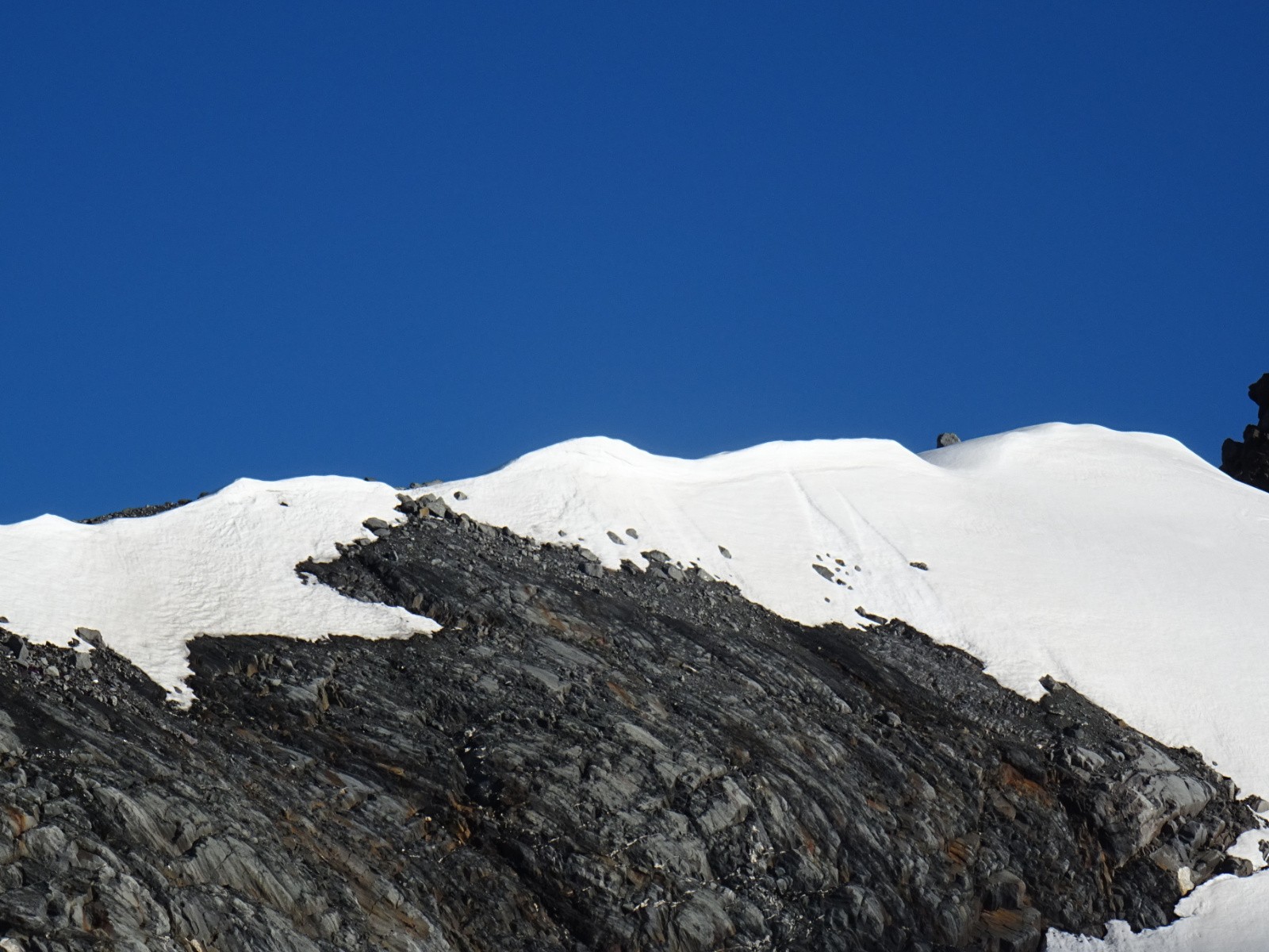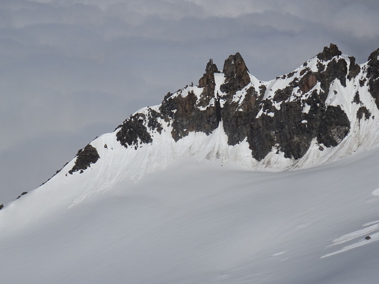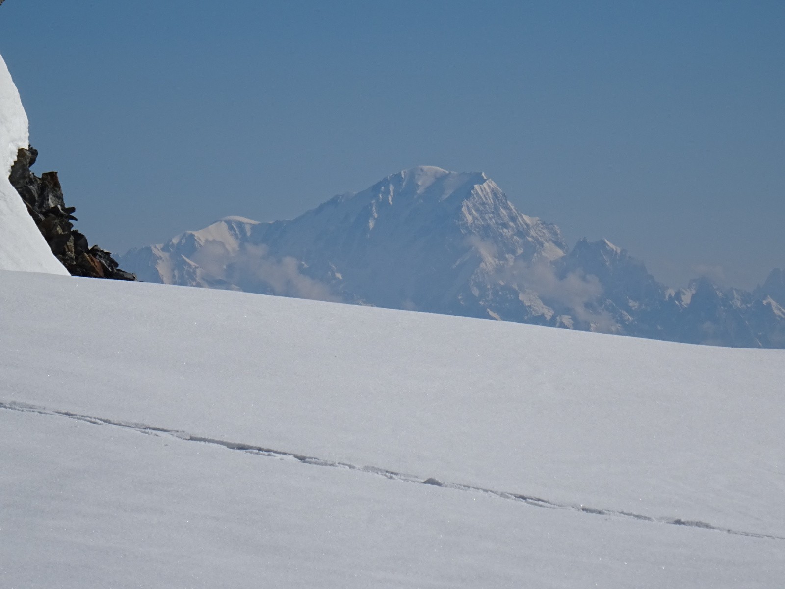 Conditions pour le ski : neige inégale, un peu merdique sur le haut (petite croûte sur fond assez mou...) jusque vers 3200m, devenant ensuite correcte puis plutôt agréable au fur et à mesure de la descente ("moquette" à poils plus ou moins longs, un peu collante à la fin)