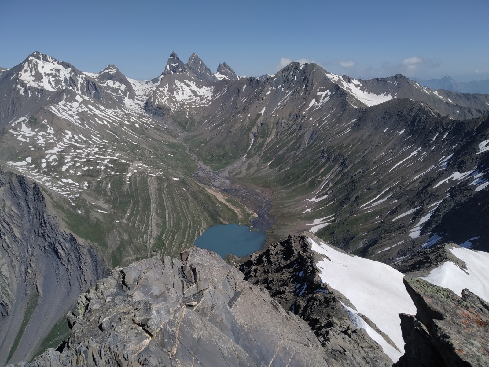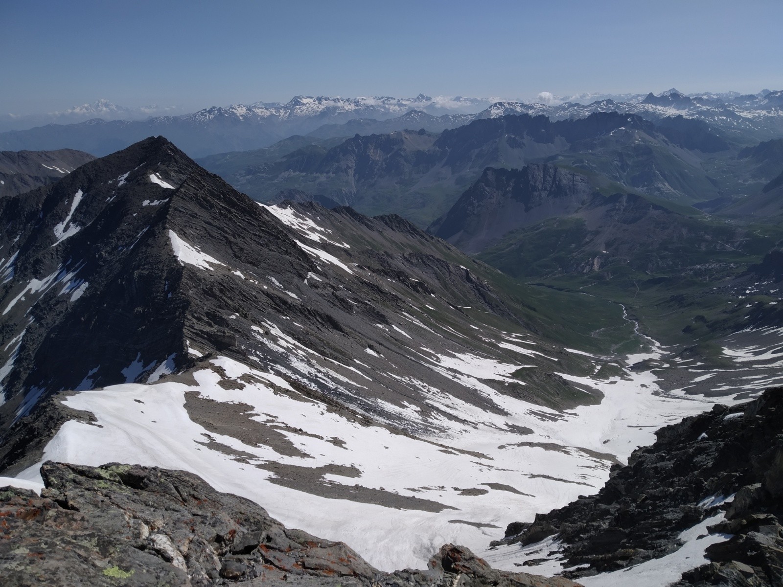 Le névé commence à 2300m avec une grosse coupure qui justifie de peauter seulement à 2400m à la montée. Sur le haut en montant ca zip pas mal dans la neige humidifiée en surface. J'ai rejoins l'épaule nord puis la facette nord-est par une traversée qui fait passer dans la pente d'ardoises schisteuses et douteuse. Peut-être est-ce mieux de monter directement vers le sommet sous l'arête? Peut-être qu'il vaut mieux avoir plus de neige pour rejoindre le sommet... J'ai mis 3.2 en raison du final un peu exposé quand même.