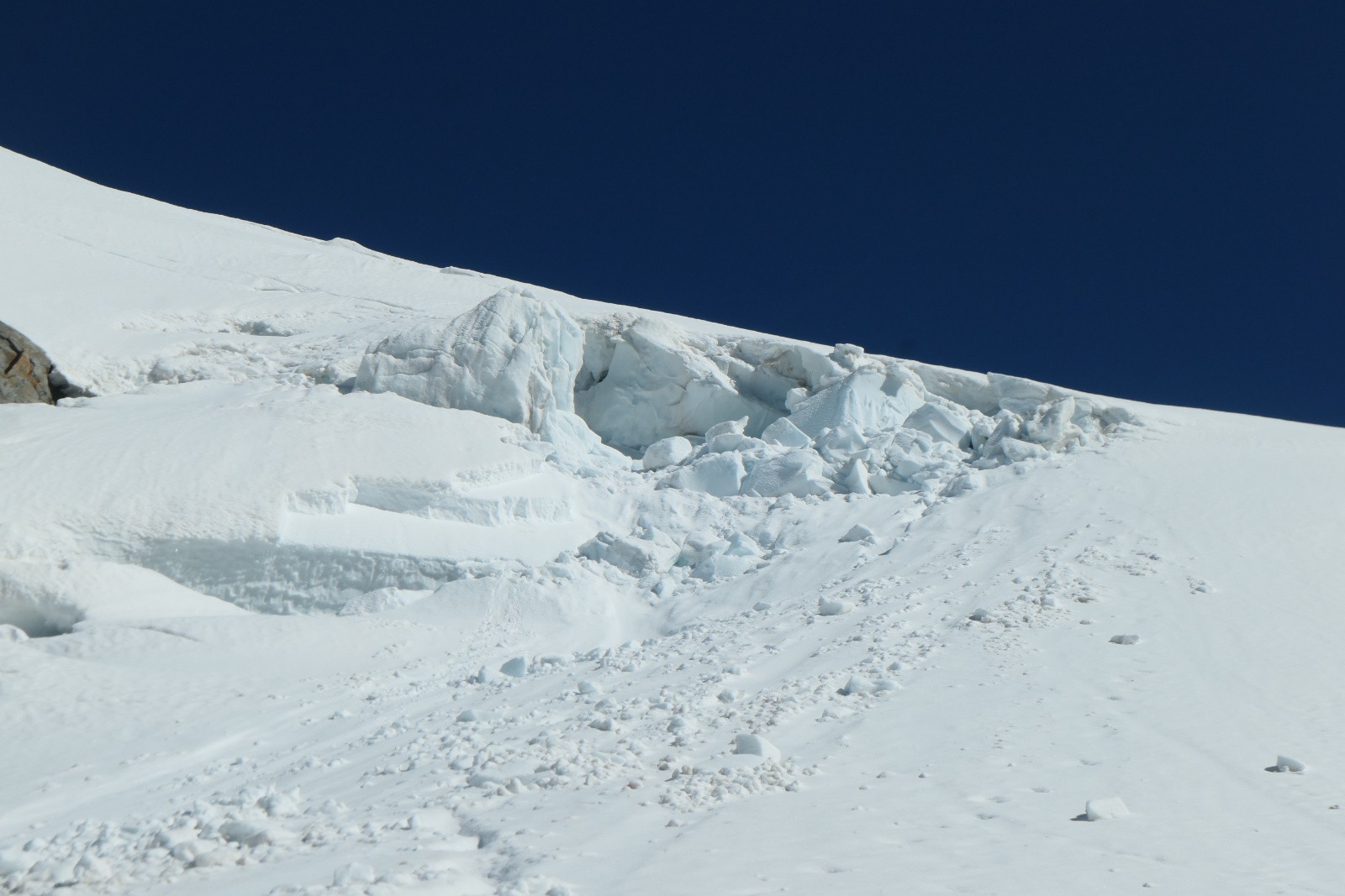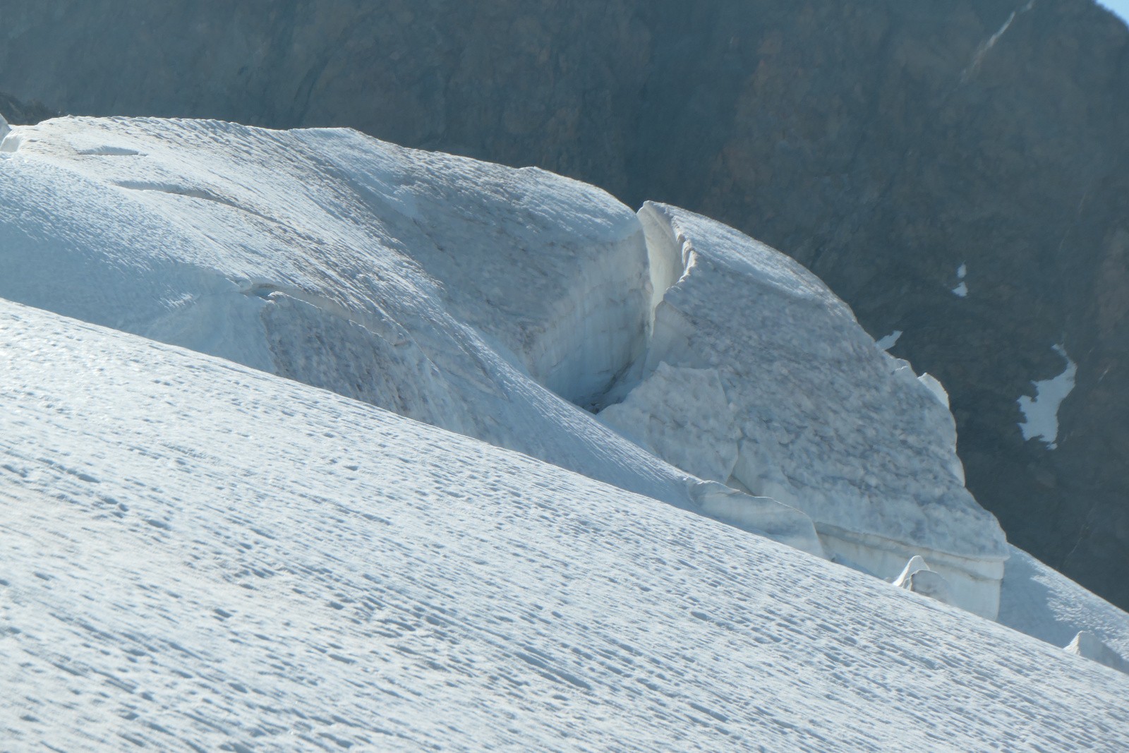 Conditions pour le ski : lisse au-dessus de 3300m, un peu de relief en dessous mais jamais très profond. Du ski bien correct avec une neige décaillée à la descente et un bon regel pour la montée. Glacier encore bien comblé, une crevasse qui s'ouvre dans la face SW