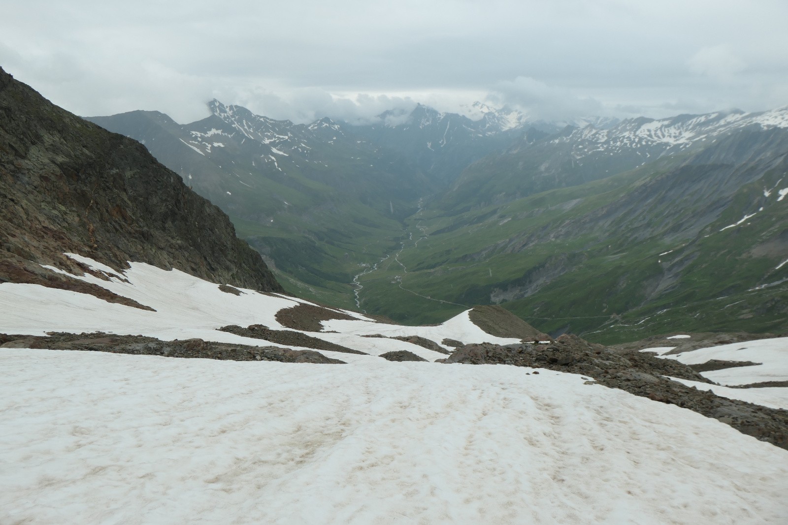 Au sortir de la tente, c'est tout sauf engageant, bruine et brouillard au petit dej pour accompagner les crêpes. "On fait quoi?" "Bon maintenant qu'on est là, allons voir ce que ça dit plus haut. Le chemin est bien humide, et quelques torrents à traverser ont tôt fait de nous tremper les pieds. Après 500m de portage on commence à apercevoir les sommets, c'est bon on passe au-dessus de la crasse. Comme l'an dernier on attend d'être 50m sous le refuge Robert Blanc pour se rappeler qu'il fallait obliquer à droite un peu plus bas. On traverse assez facilement et retrouvons le chemin qui traverse depuis le refuge. Les névés ne sont pas très larges, on atteint ensuite la moraine que l'on remonte jusque l'aire de chaussage à 2800m. La suite déroule bien à ski jusqu'au sommet par un bon regel. Le vent est un peu destabilisant sur la dernière pente. On profite de la vue puis d'une très bonne descente de 400m. De là nous décidons de remonter au sommet profiter de quelques virages supplémentaires. On s'arrêtera finalement 50m en dessous car le vent se renforce et les nuages se sont mis en place, on n'y voit plus grand chose. Seconde bonne descente, neige décaillée mais toujours assez ferme jusqu'en bas, les reliefs ne sont jamais très creusés. Déchaussage tout confort sur le chemin, il tombe quelques gouttes mais rien de bien méchant comparé à l'orage de grêle qu'on s'est pris en ces lieux 13 mois plus tôt. Plus qu'à prendre le sentier pour arriver tranquillement à la voiture. Encore du bon ski en ce premier juillet!