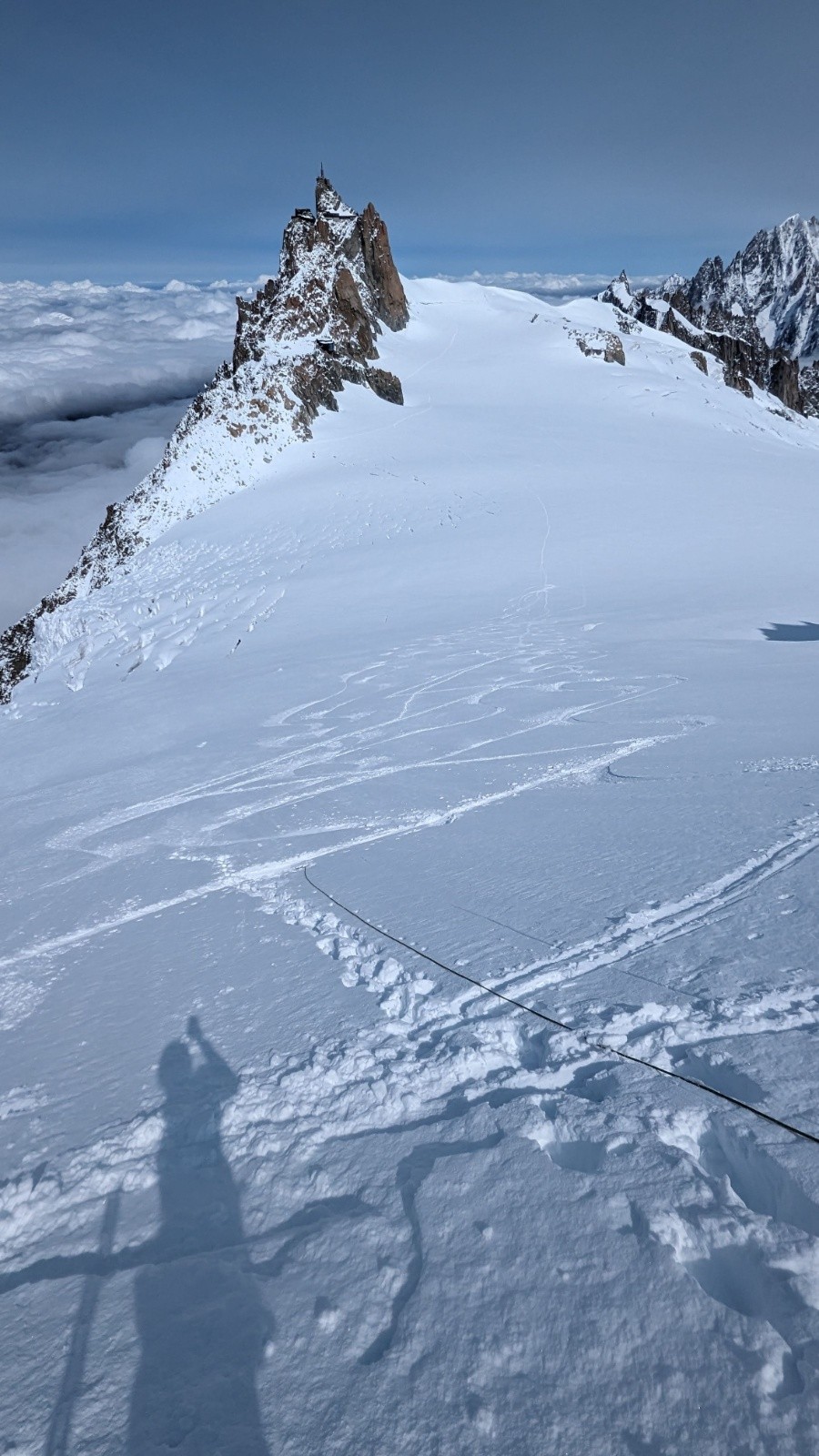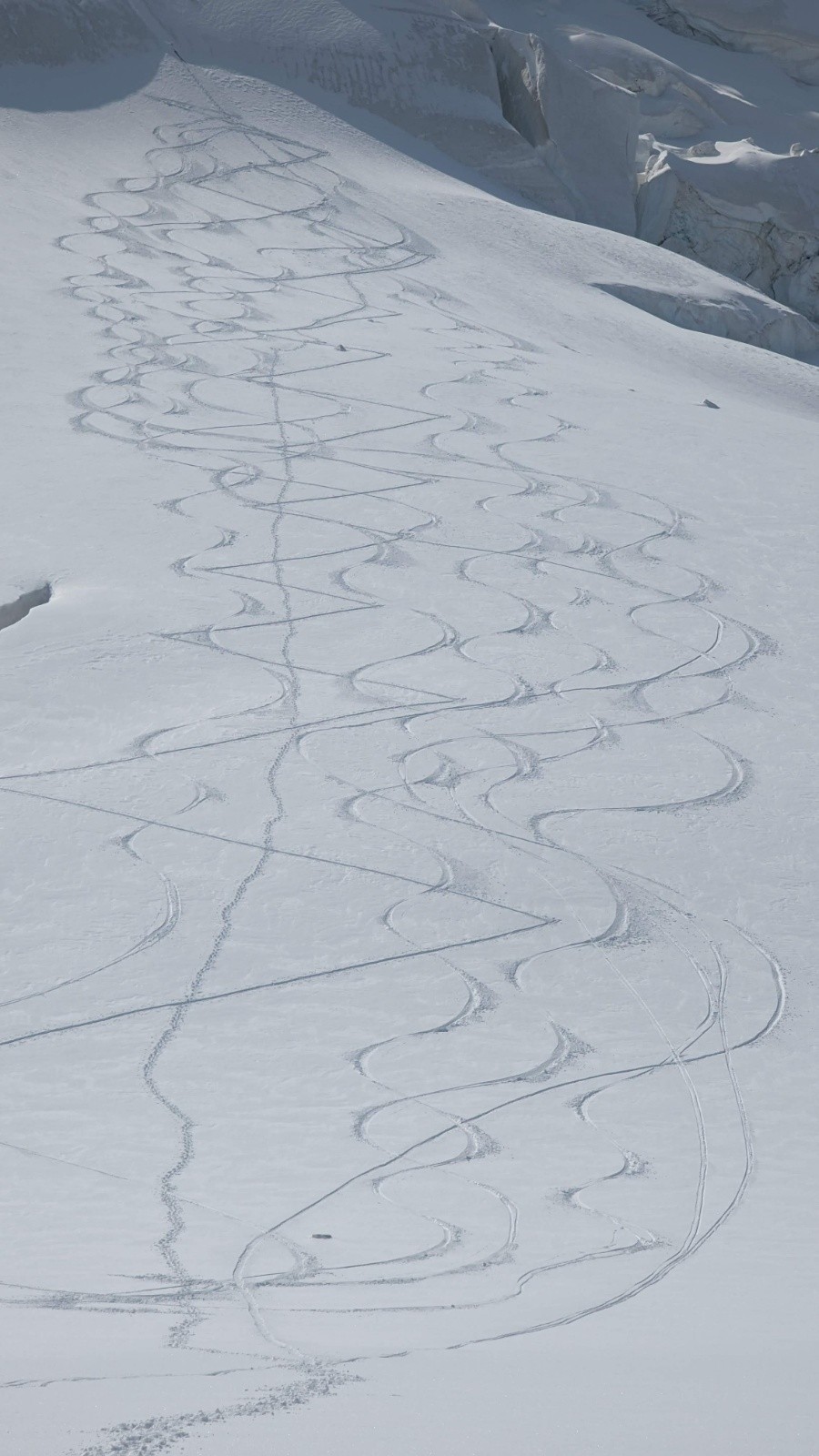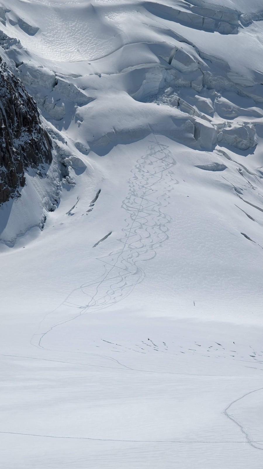 Avec de la motivation pour le ski mais moins pour le risque, on est resté dans le secteur entre le col du midi et les premiers séracs / le mur de glace au Tacul, c'est 200m D+, où on a fait 3 fois la descente ! :) Au 'sommet' de notre ligne on a trouvé de la neige pas trop ventée - un plaisir à skier. 100m plus bas, plus affecté par le vent, mais toujours correct à skier.