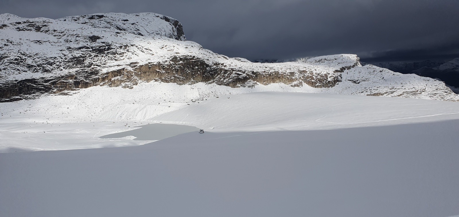 Conditions pour le ski : Premières traces de neige vers 2200m, sols entièrement blancs en Nord vers 2400m (2/3 cm), 5cm vers 2600m et 10/15 cm de belle poudreuse vers 2750m. Première trace de sous couche (la neige de la semaine dernière mouillée et regelée) dans certains creux vers 2600m. En fait ce n'est skiable que sur le glacier ou un peu plus bas sur les zones de snow-farming. Une de ces zones sert en ce moment de pente d'entrainement pour du slalom et permet de chausser un peu avant le glacier. Une fois là haut ça fait bien blanc avec 10/20 cm de poudre sur le bas et un peu plus sur le haut mais plus travaillée par le vent. Je n'étais pas de service mais juste là pour le plaisir de ressortir les skis, mais je n'ai pu m’empêcher de faire un petit trou dans la neige sur le haut vers 3400m pour faire un peu le point sur les chutes de neige de ces derniers jours. ( petite vidéo d'analyse du manteau pour les curieux https://www.facebook.com/groups/meteofrancealpesdunord/permalink/1101875400798680/ ) Il y a 70 cm de neige là haut dont 50 cm de récente plus ou moins ventée avec une belle trace de sable datant du foehn de lundi dernier.