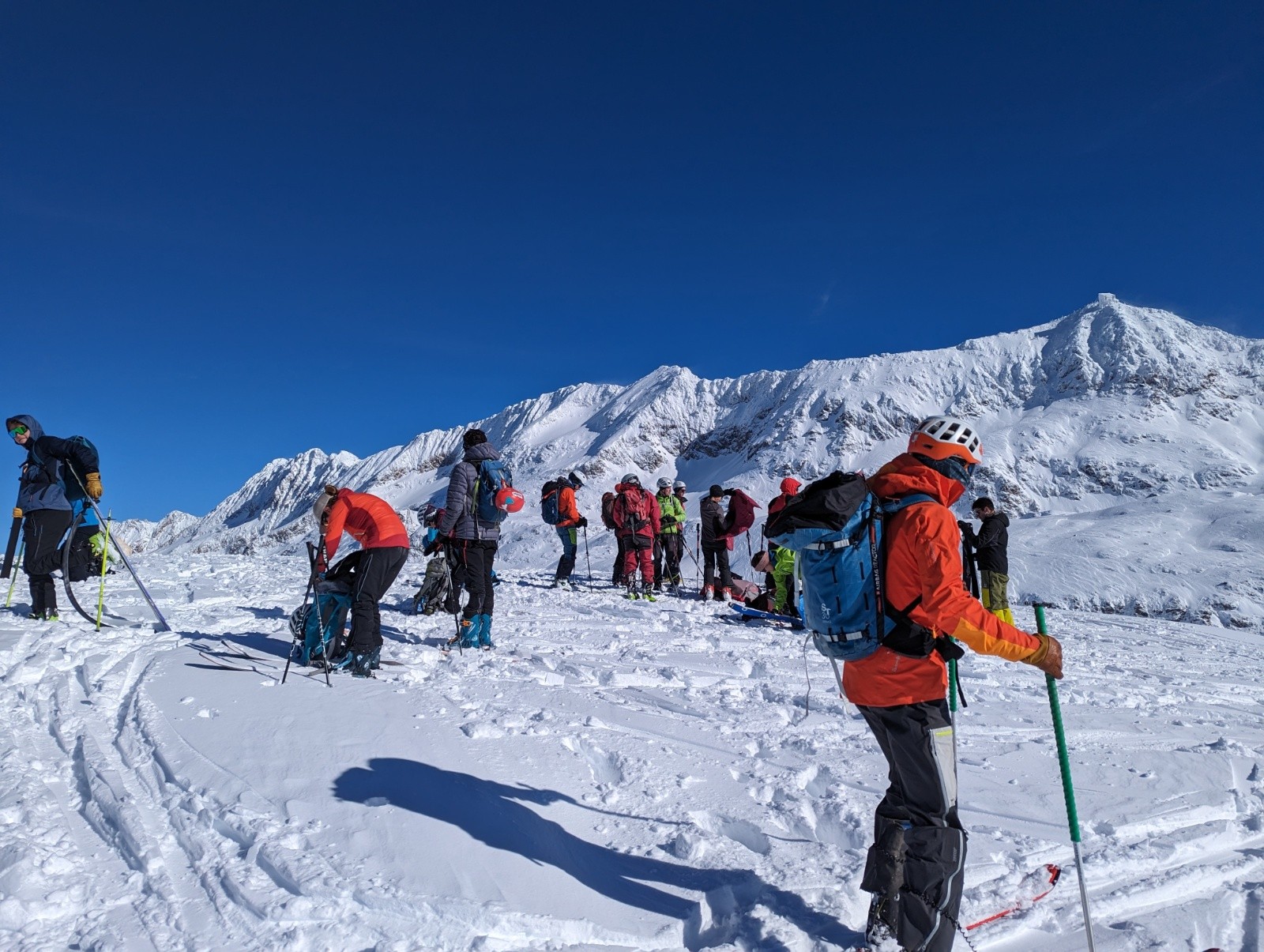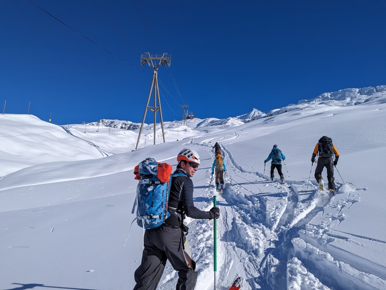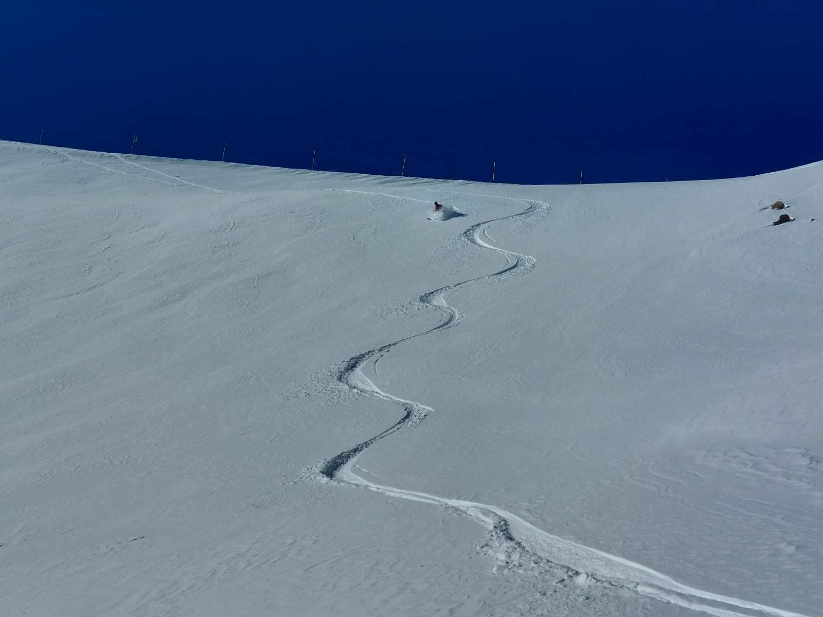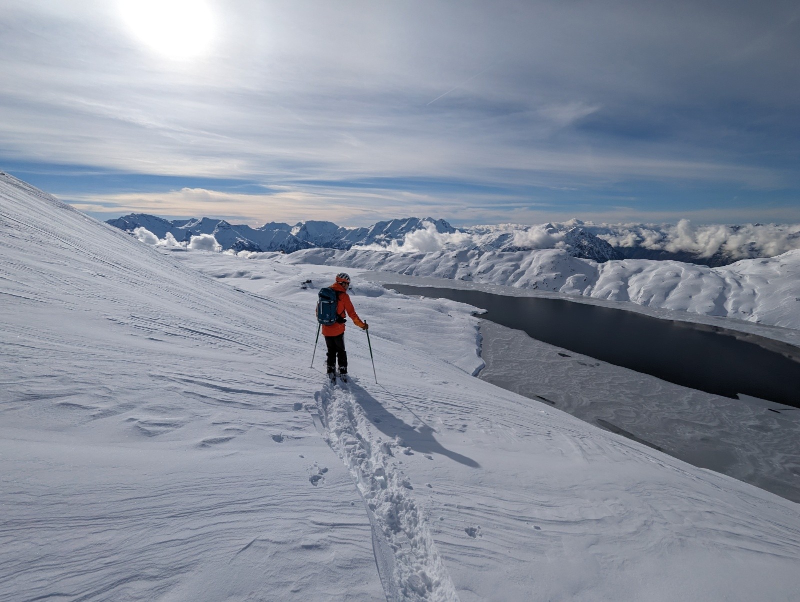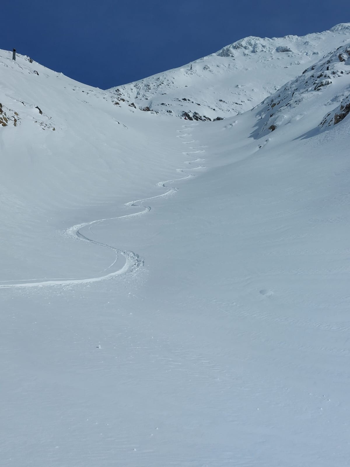Itinéraire suivi : Retour a l'Alpe d'Huez une semaine après, on est sur de biens meilleures conditions. Montée par les pistes, il y a du monde ! Mais c'est large. On se découvre rapidement après le départ, puis le vent de Nord nous saisit vers 2500m et on remet le coupe vent. On se rend vite compte que l'épaisseur de neige ne posera pas de problèmes et que ce sont les zones ventées et sous les canons qu'on va devoir éviter pour descendre. On décide de quitter la foule du Dôme des Petites Rousses pour aller chercher de la poudreuse sous le tunnel. Je touche un caillou juste sous la neige sous le Dôme à 2700, mais j'étais en petite vitesse car il y en avait des visibles à proximité. Je me demande si nous faisons le bon choix dans la remontée vers le tunnel qui est bien soufflée, et Thibaud trouve le petit couloir en poudre vierge bingo ! Pas de bol pour le groupe en train de dépoter à la moitié de celui-ci qui soupireront "Oh non !" au passage de Thibaud qui ouvre. Nous décidons de rentrer sur ce succès pour avoir le temps de se requinquer avant Cinémontagne à Grenoble. Descente sur le bord de piste assez rapide sur la fin, et on ne touchera plus rien. On espère que les conditions s'amélioreront dans les semaines à venir car à priori la semaine prochaine s'annonce très moyenne pour les amateurs de neige isérois.