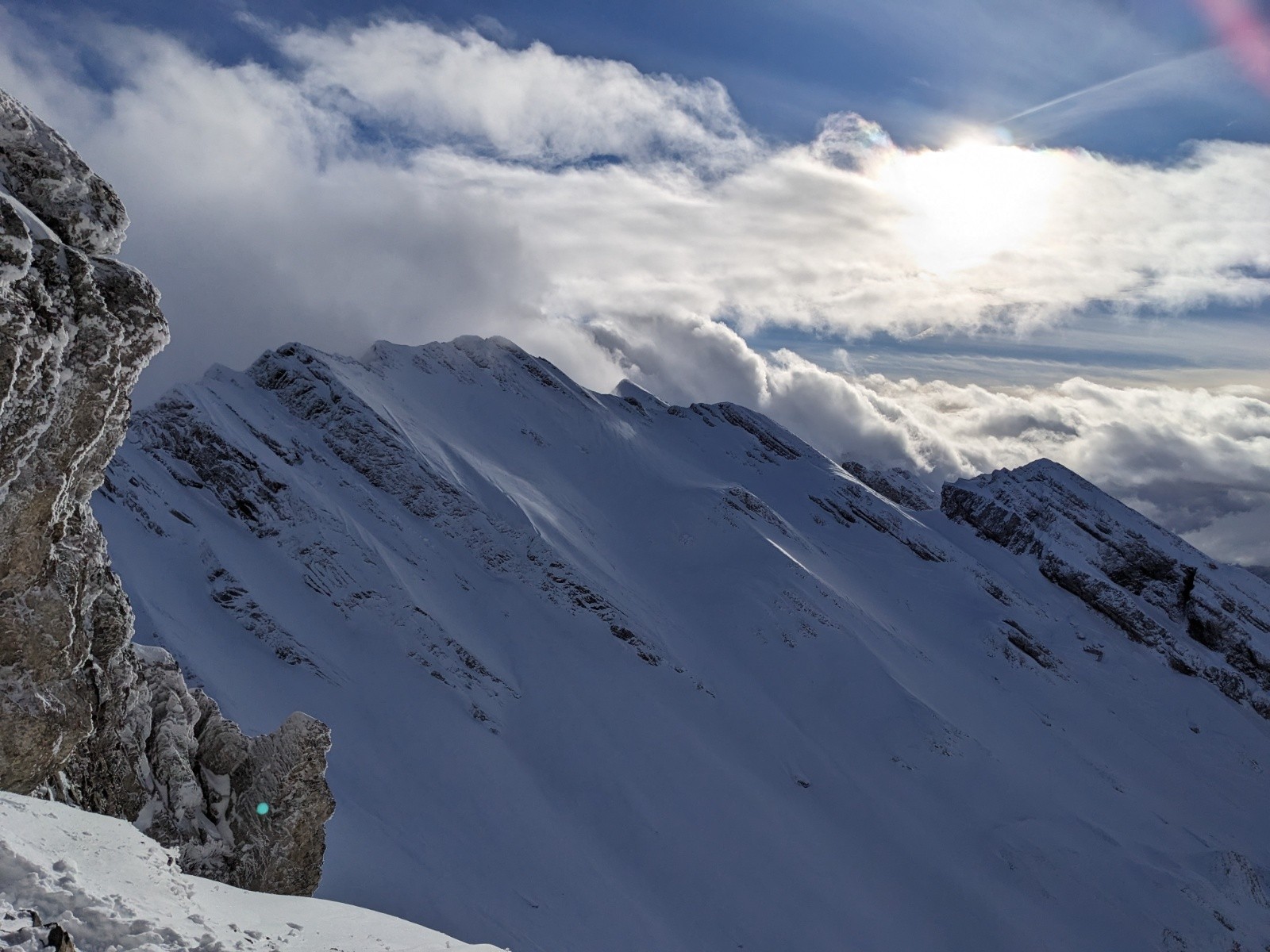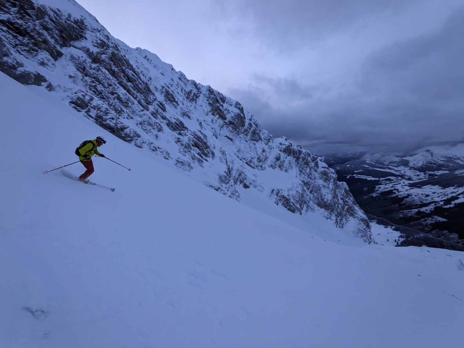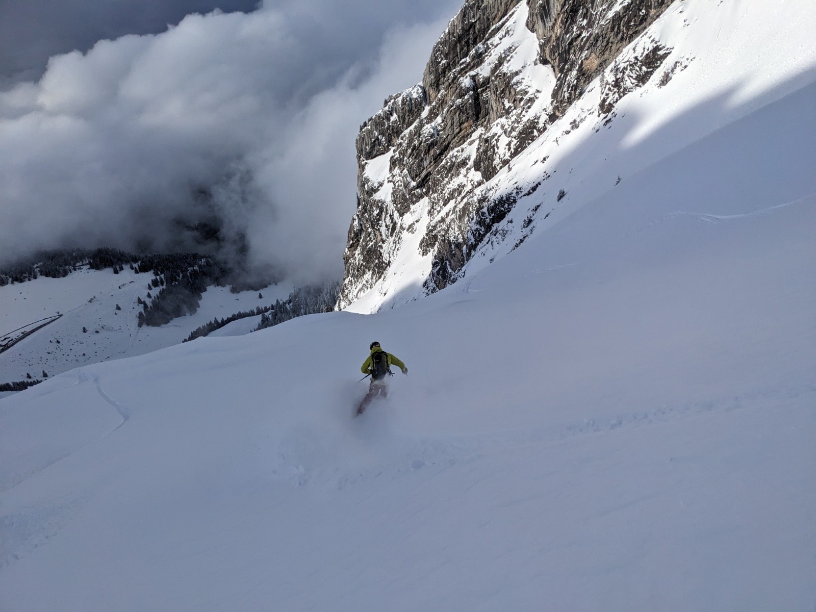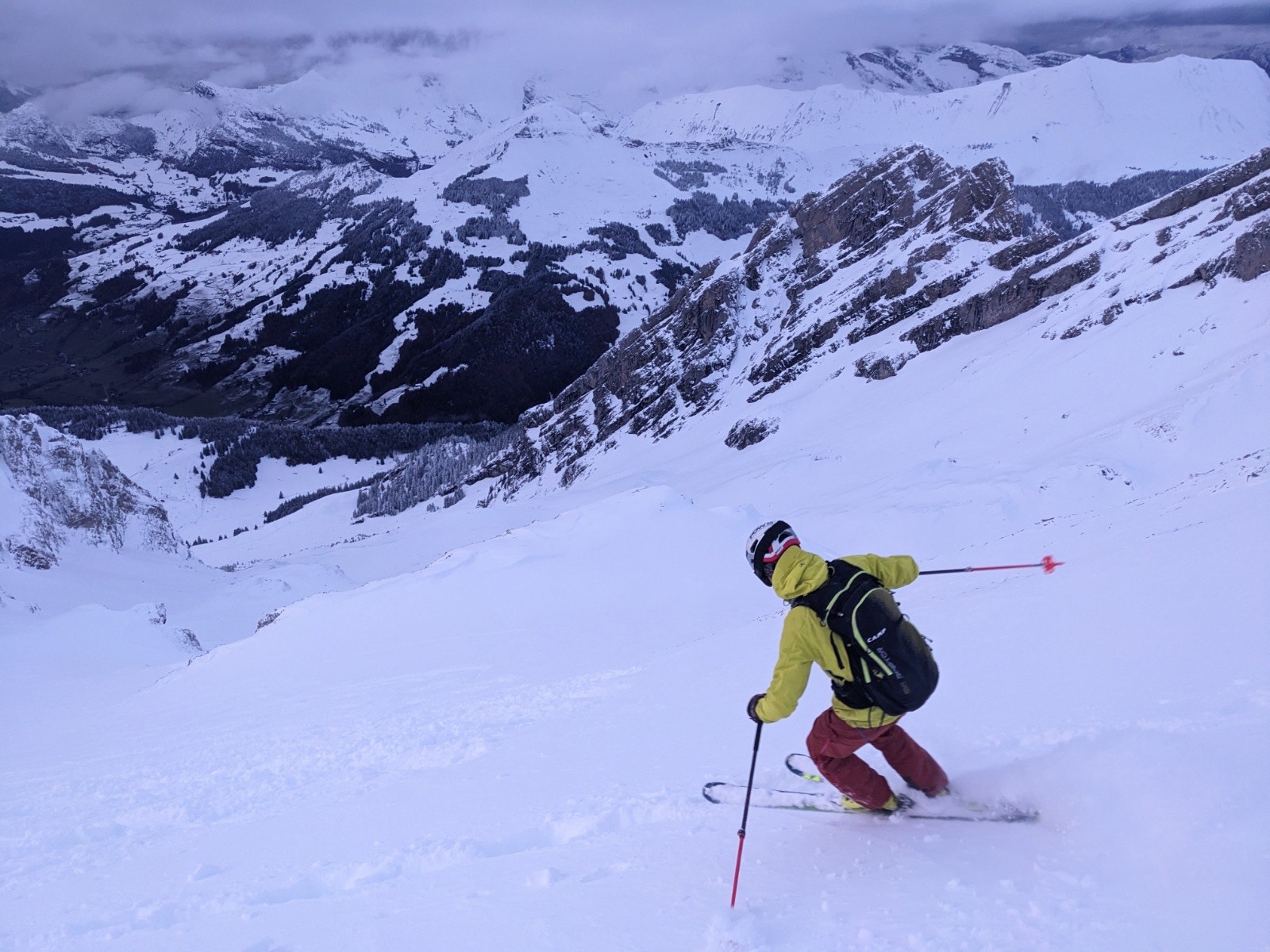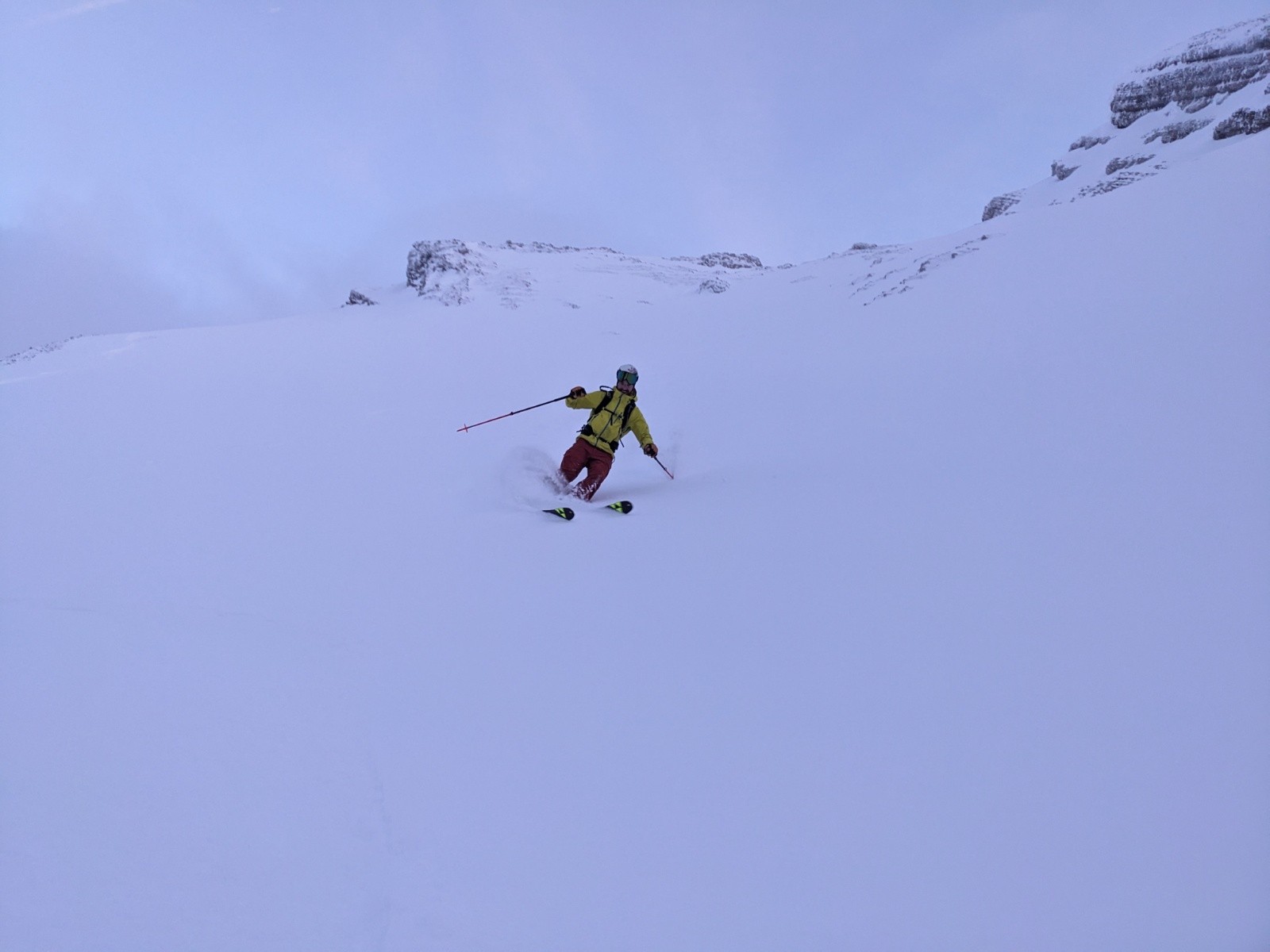Conditions pour le ski : Bonne poudre dans toute la combe un peu lourde sur le bas. Les bosses sont bien soufflées.