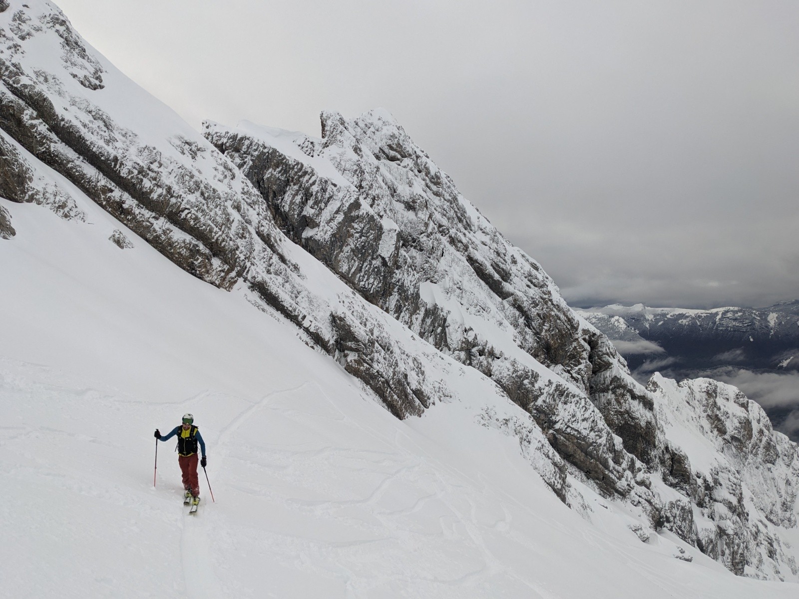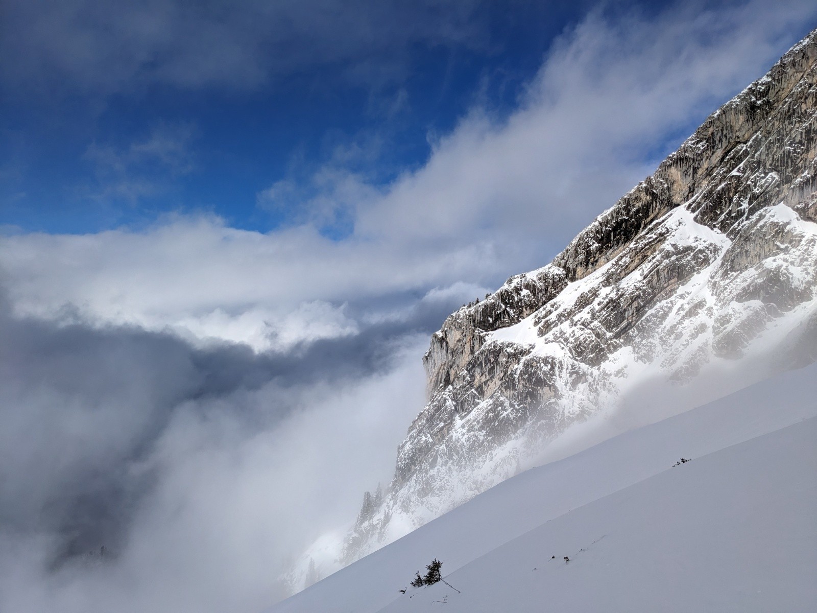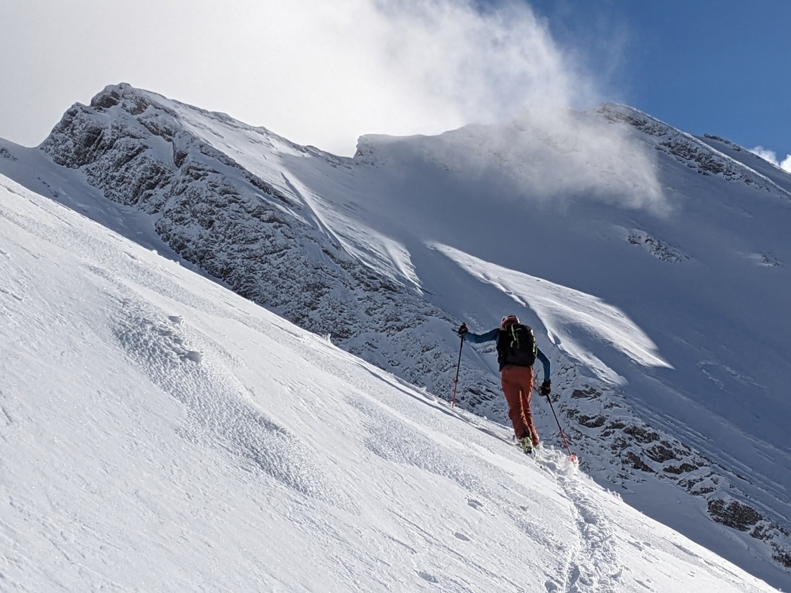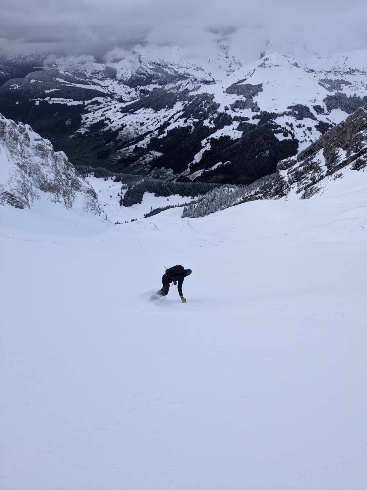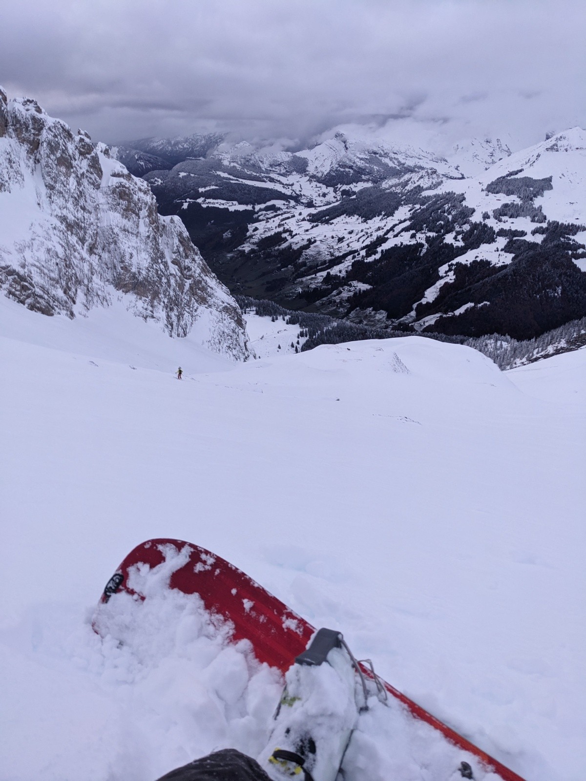 Conditions pour le ski : Bonne poudre dans toute la combe un peu lourde sur le bas. Les bosses sont bien soufflées.