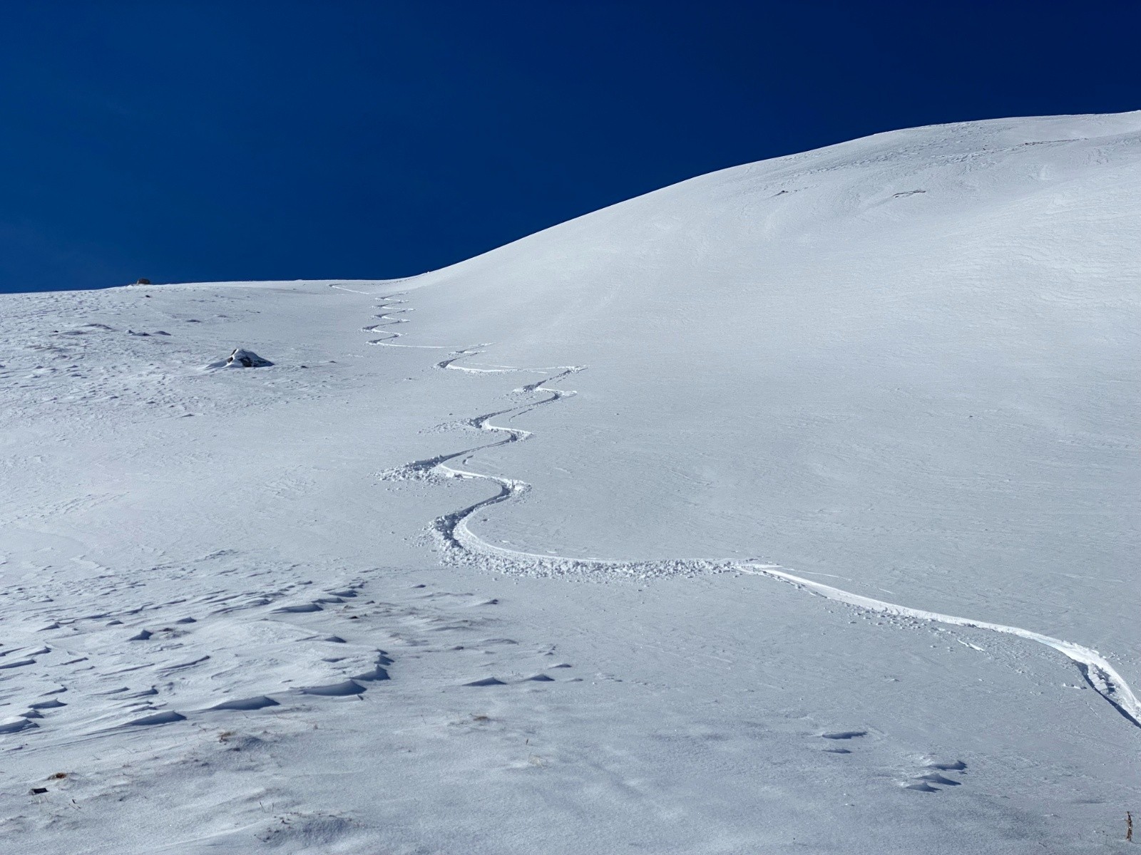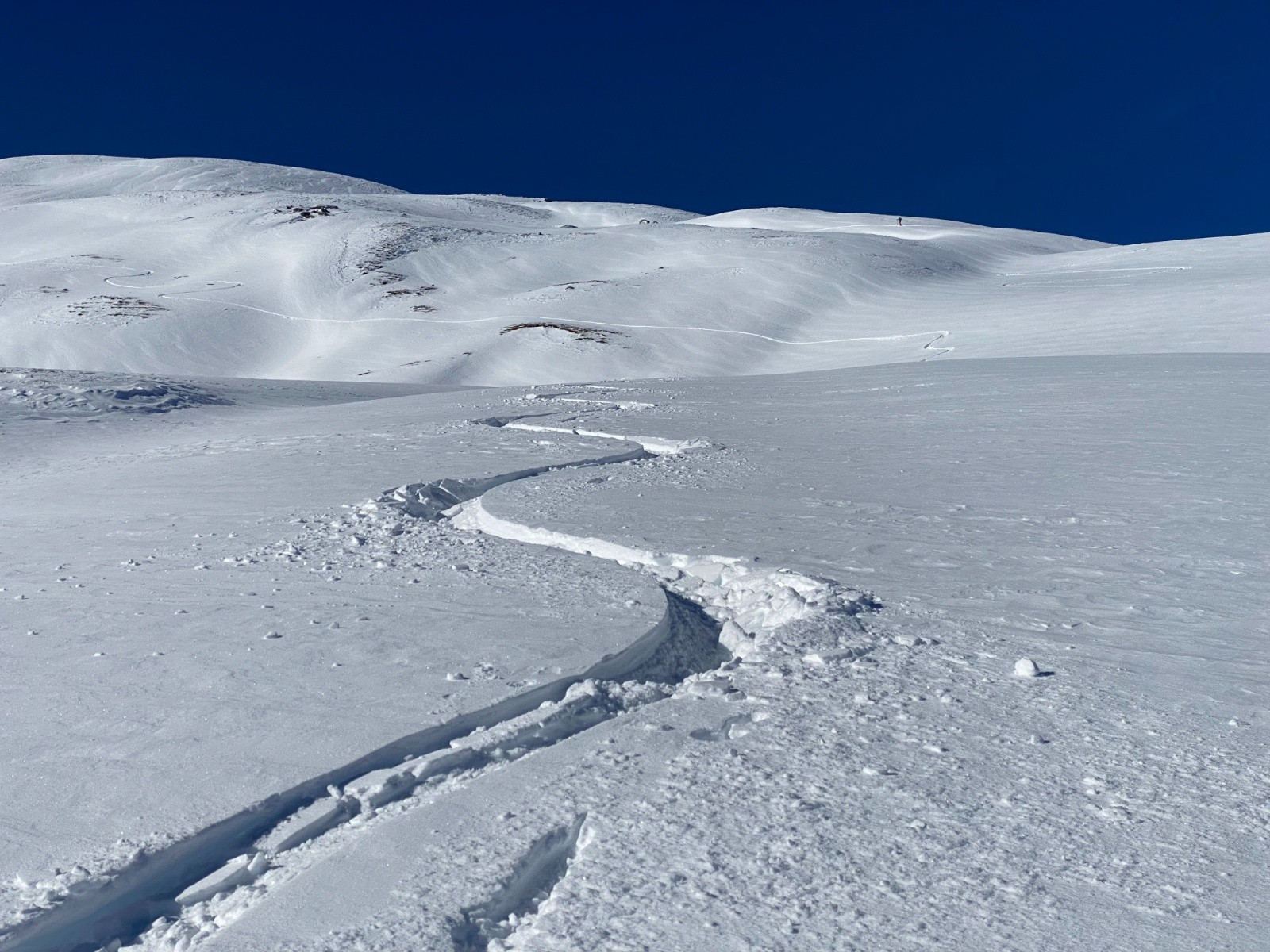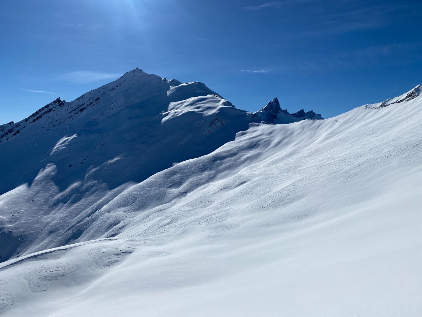 Activité avalancheuse :une petite plaque déclenchée par le 1er groupe juste sous le sommet. Précédemment le vent avait sévi assez bas puisque on trouve des croupes avec peu de neige.