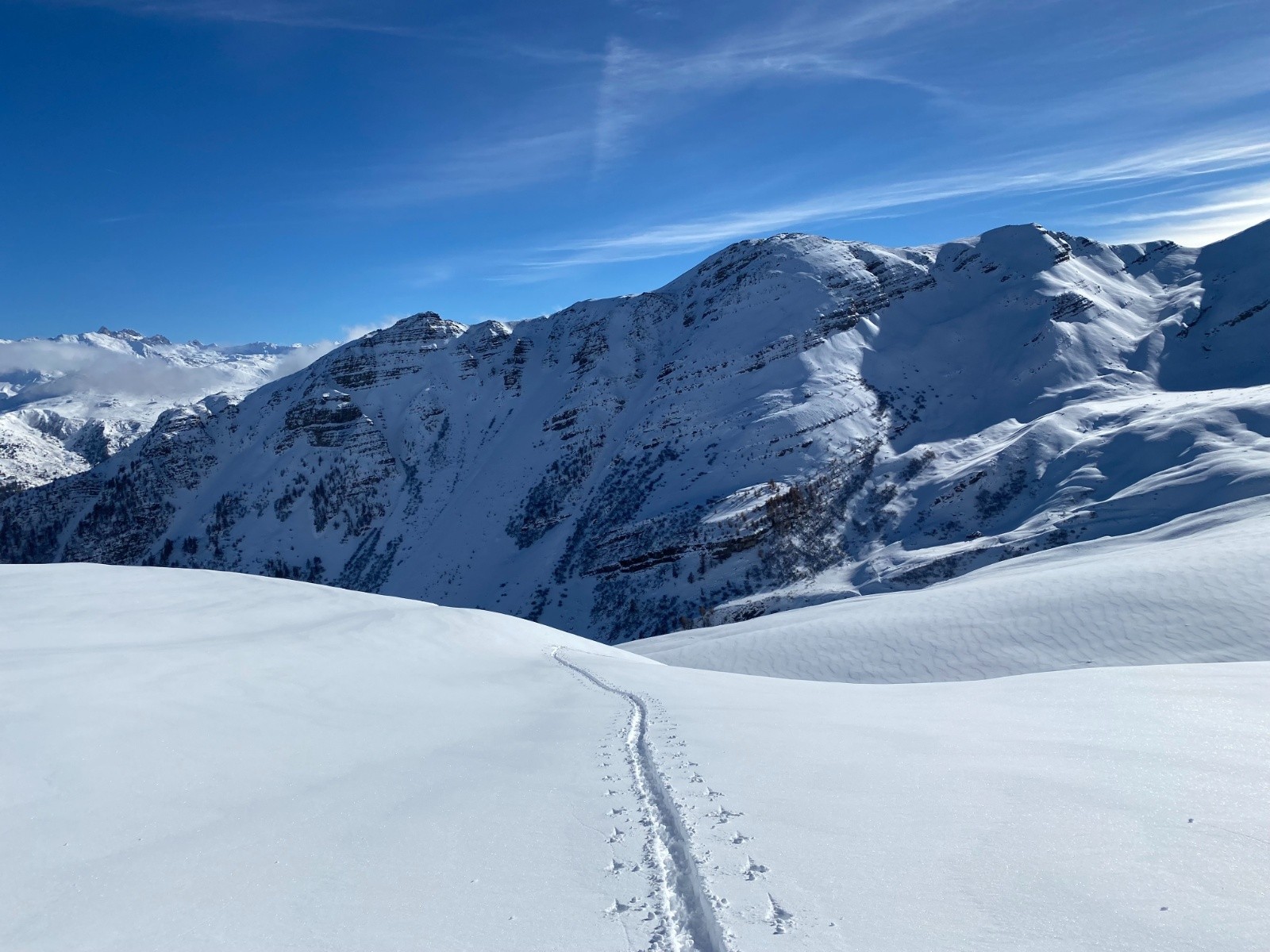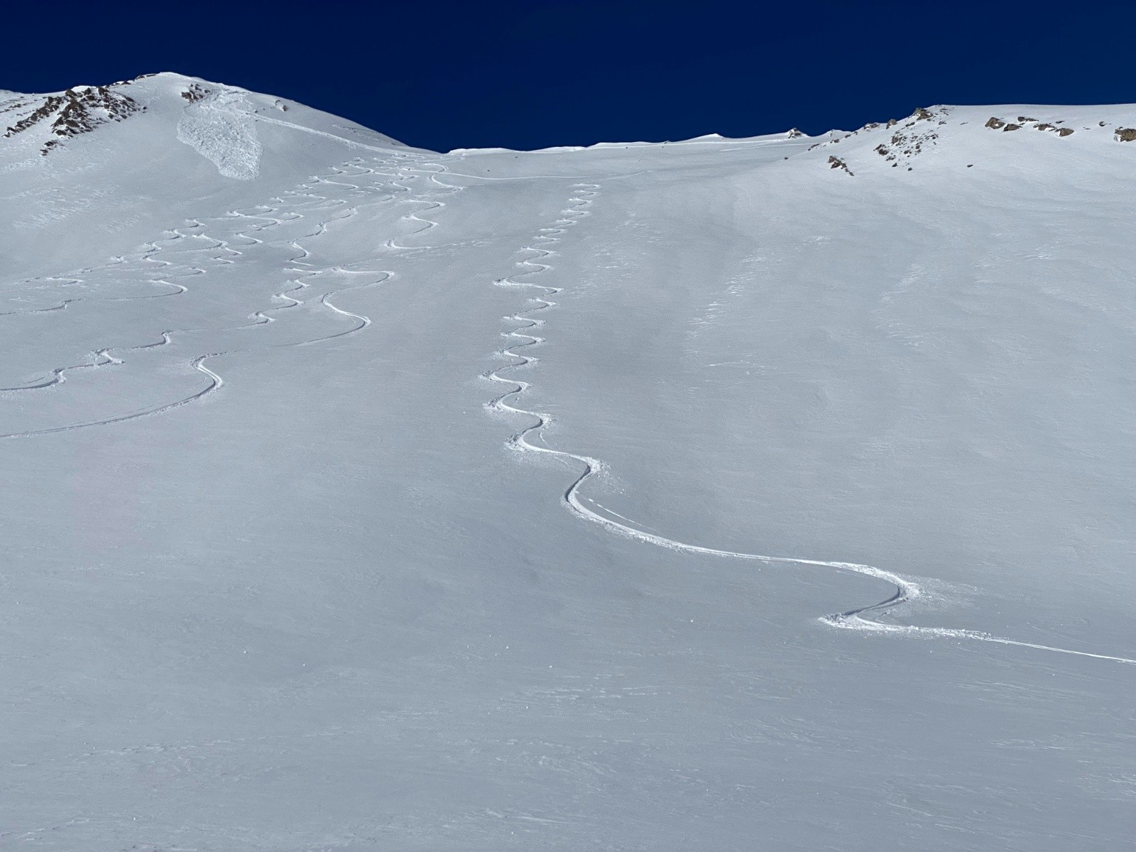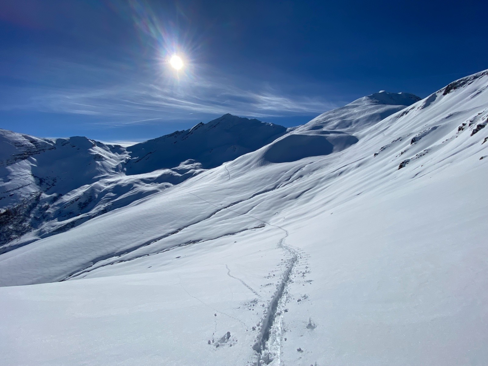 Activité avalancheuse :une petite plaque déclenchée par le 1er groupe juste sous le sommet. Précédemment le vent avait sévi assez bas puisque on trouve des croupes avec peu de neige.
