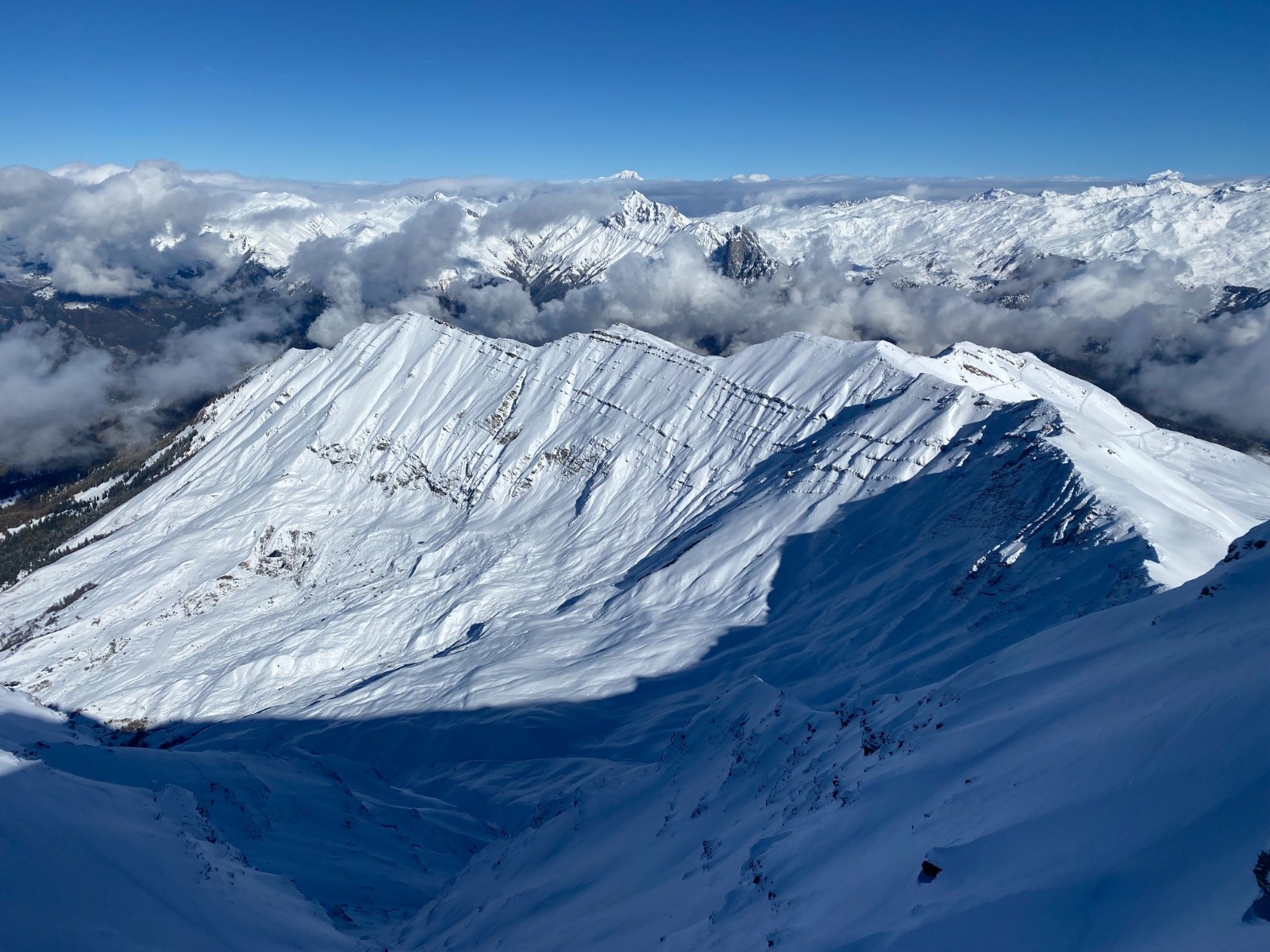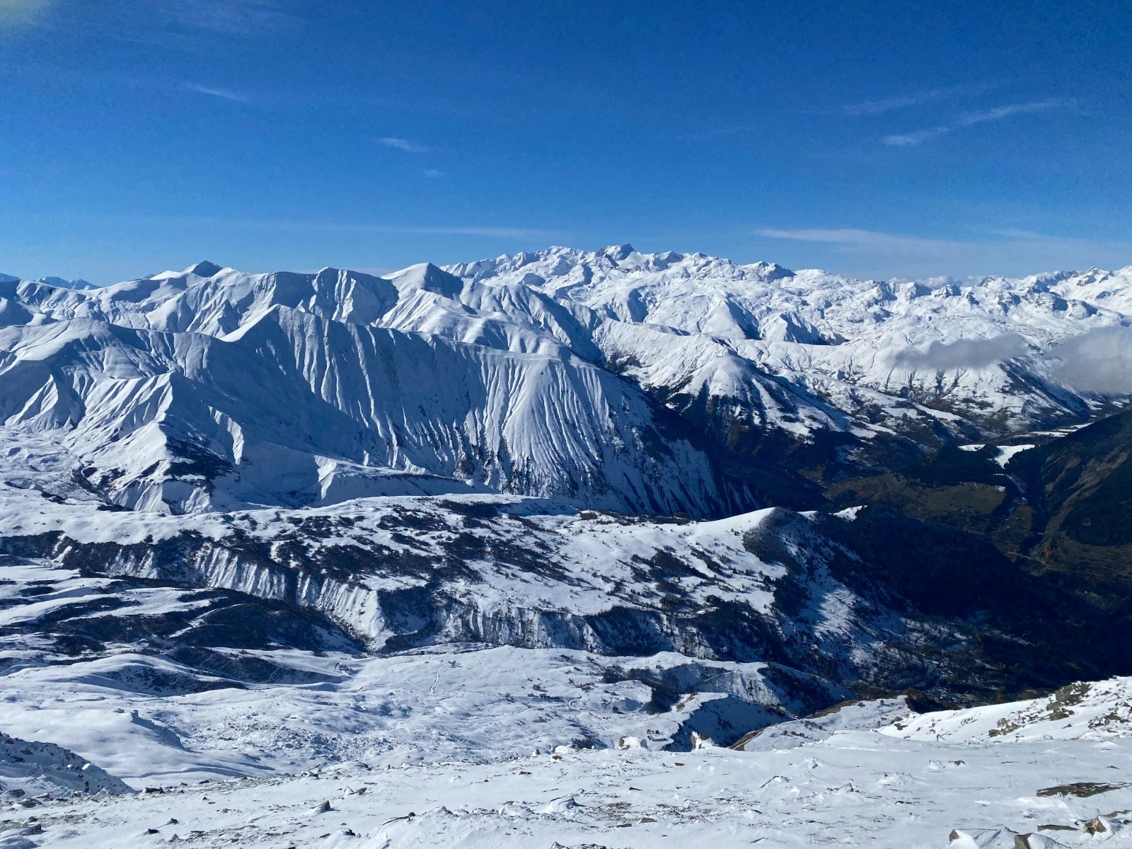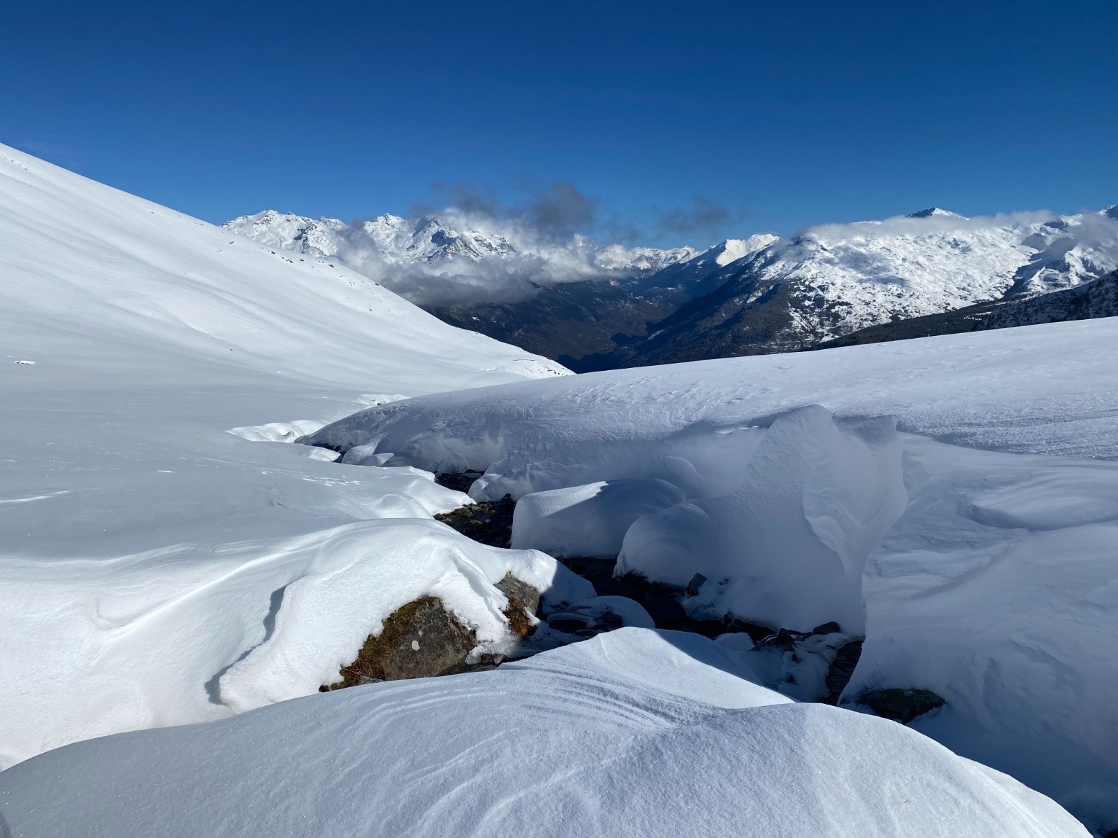 Versant W de la Pte d'Emy bien pelé, Couloir Nord plutôt bien rempli. Gde Chible NE, pas mal pour un mi-novembre. Haut des Sallanches et Paroi du Midi ont été bien soufflés.