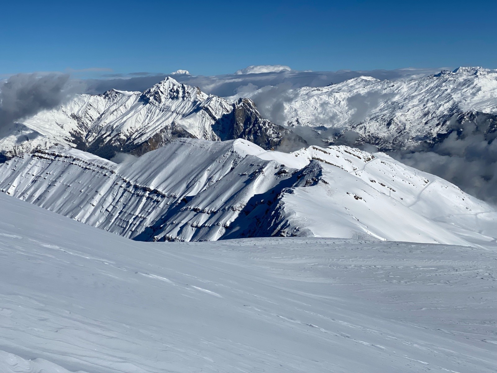 Conditions pour le ski : C'est globalement bon même si on peut toucher dans plusieurs endroits. Neige déjà humidifiée dans les zones qui ont bien vu le soleil (en remontée au télésiège des Arpons et sous le départ de ce même télésiège).