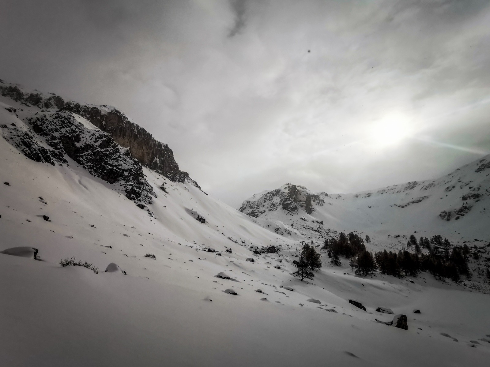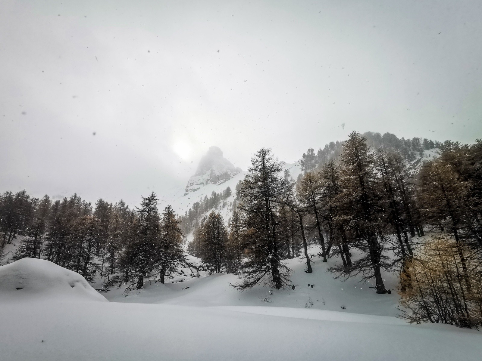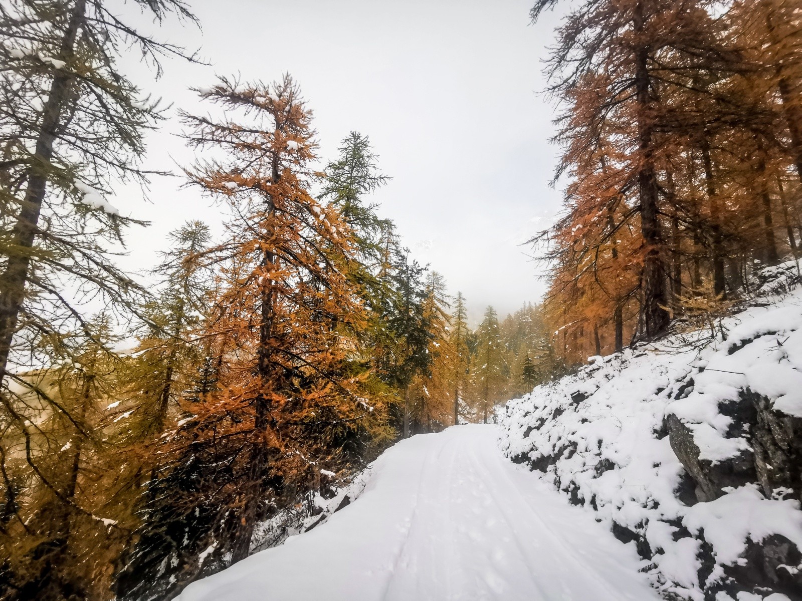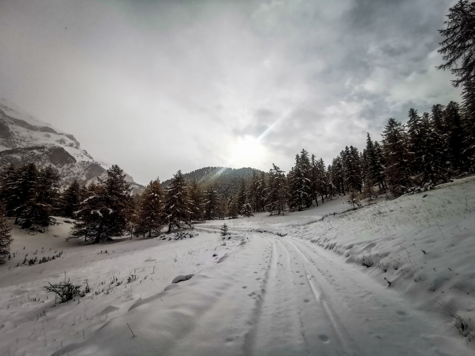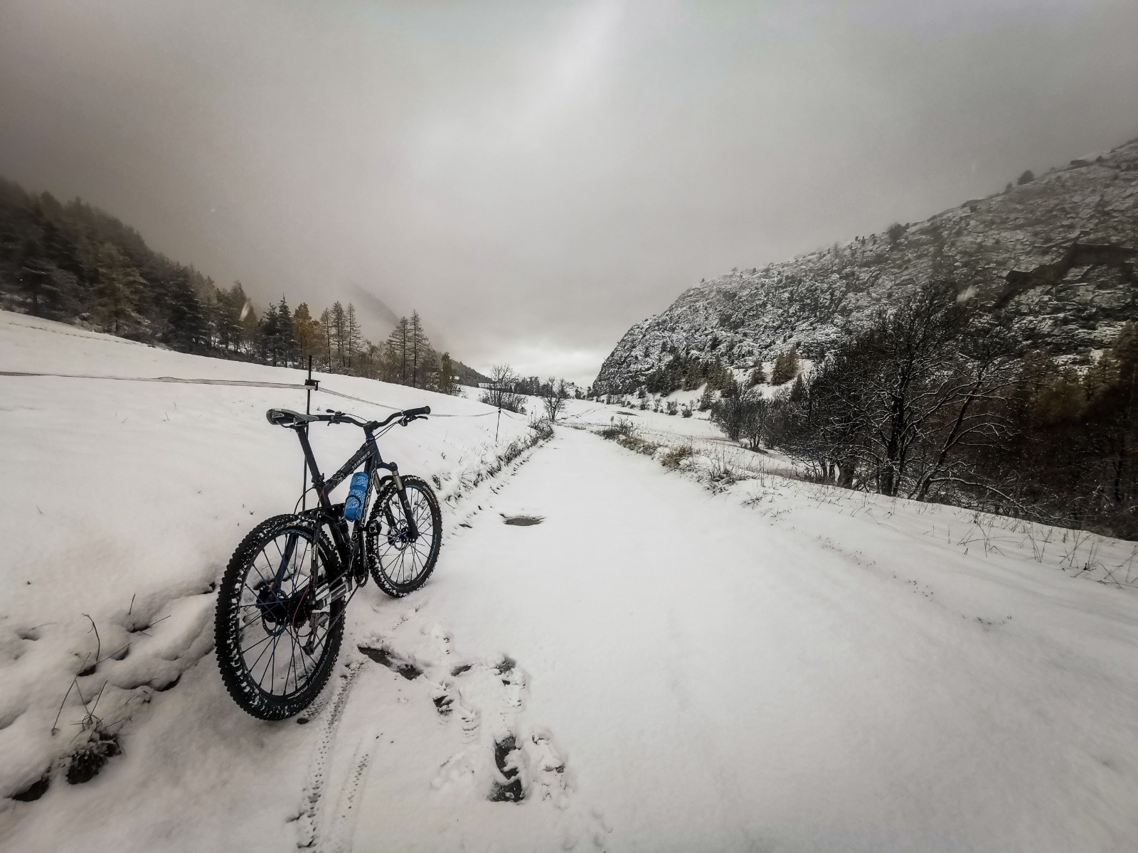 Météo maussade et réticence à prendre la voiture : c'est l'occasion d'aller bricoler dans un coin proche de la maison ! Briançon est sous la neige ce matin, mais il faut encore monter assez haut pour trouver de la sous-couche. Normal pour un 12 novembre ! La piste DFCI de Rocher Baron, qui flirte avec les 2000m, m'offre un accès de choix en VTT pour chercher l'or blanc.