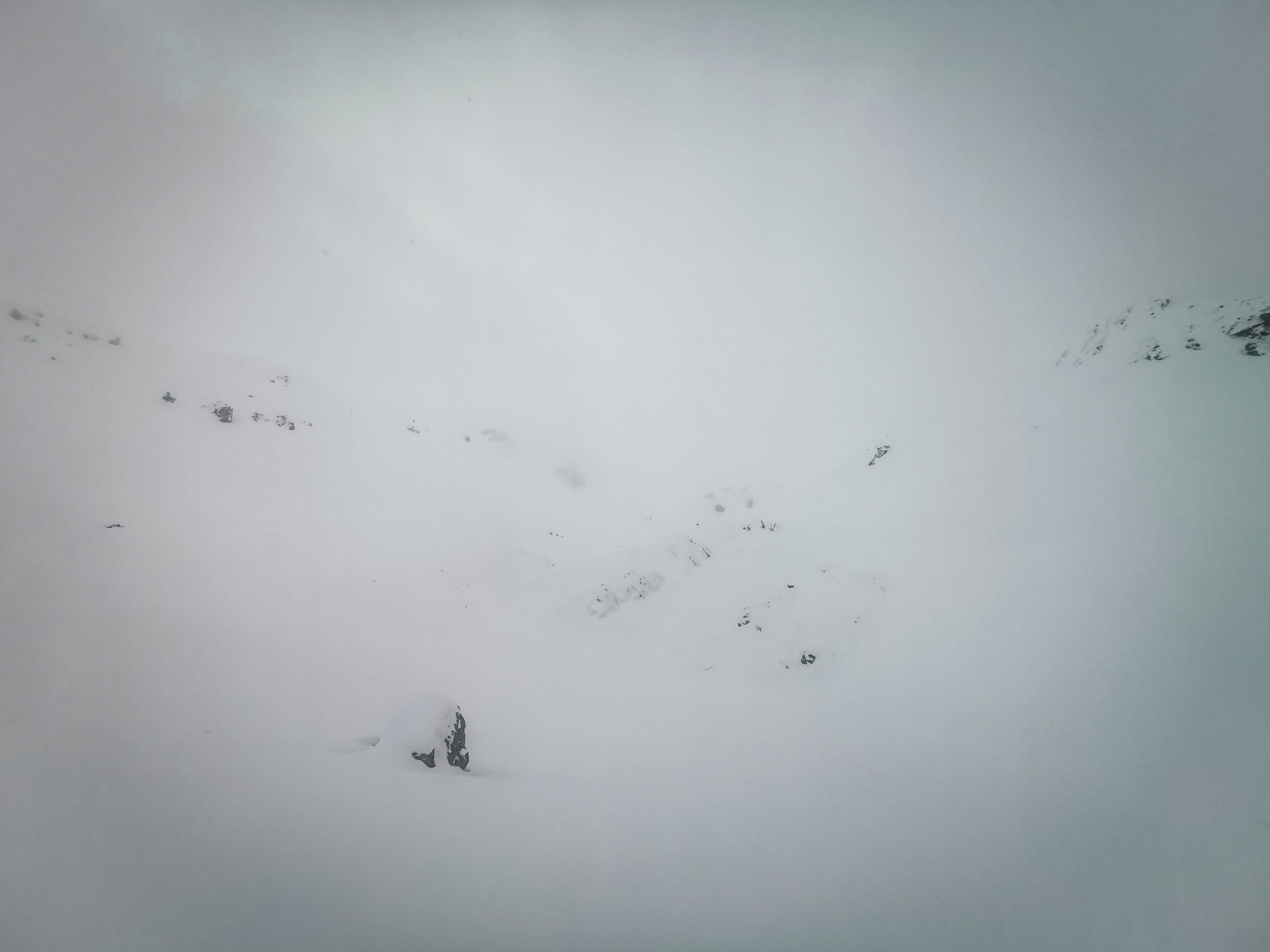 Une fois arrivé sous le col de l'Alpavin, je décide de bifurquer vers le Roc de Serre Chapelle, puisqu'il fait de toute façon trop moche pour que je bascule sur le lac de l'Ascension (l'idée initiale), et que ce sommet est à peu près le seul point doté de visibilité dans mon champ de vision. Un contrôle des pentes sur la carte me révèle qu'il y a un peu de 30° pour accéder au Pas de la Casse de l'Ase. A ce stade je n'ai eu aucun wouf ni autre signe avant-coureur, et la zone à 30° traversée juste en-dessous m'a semblé stable et homogène. D'autre part ce versant a été un peu dégarni et les quantités sont faibles. Pour moi la situation semble OK.