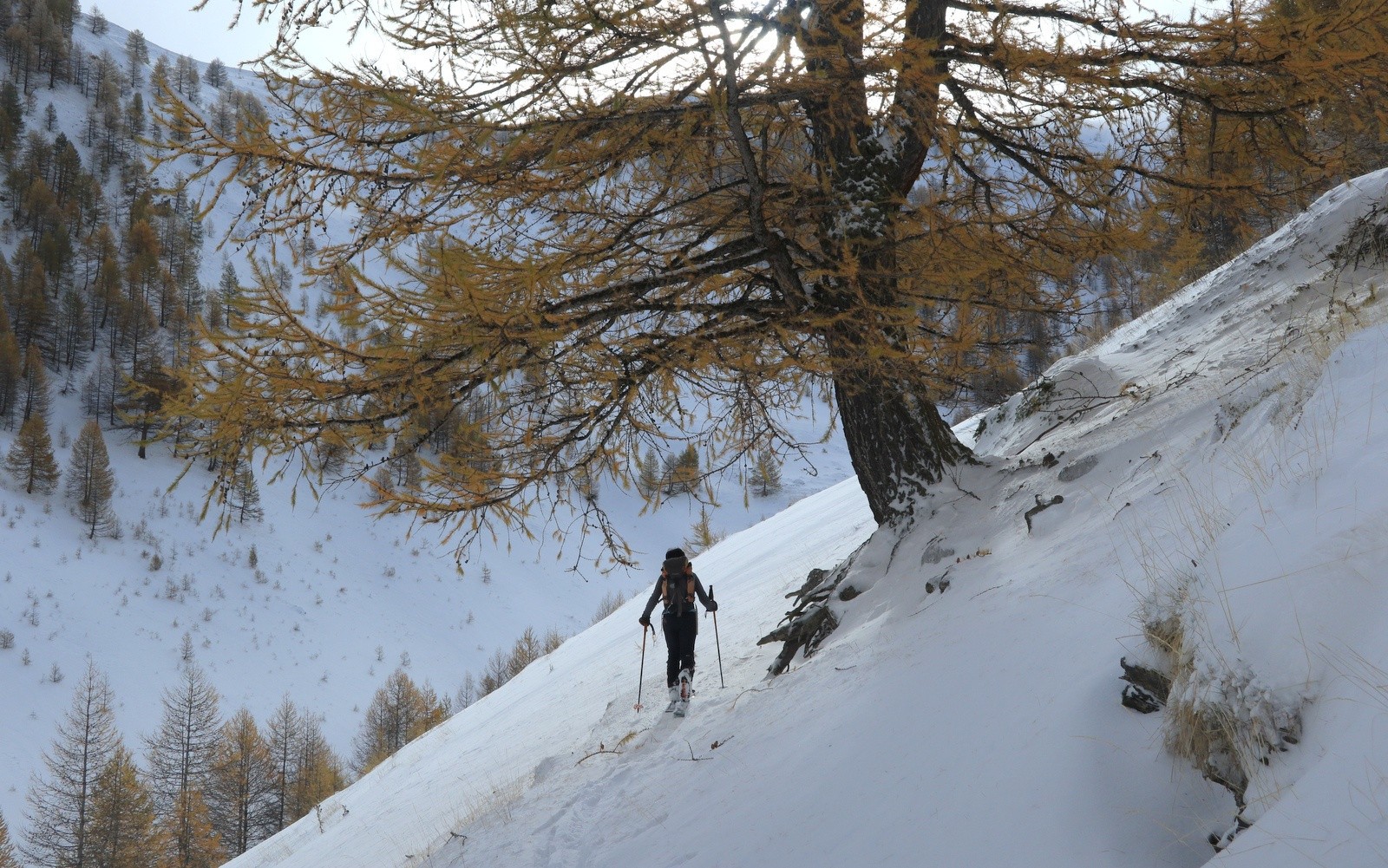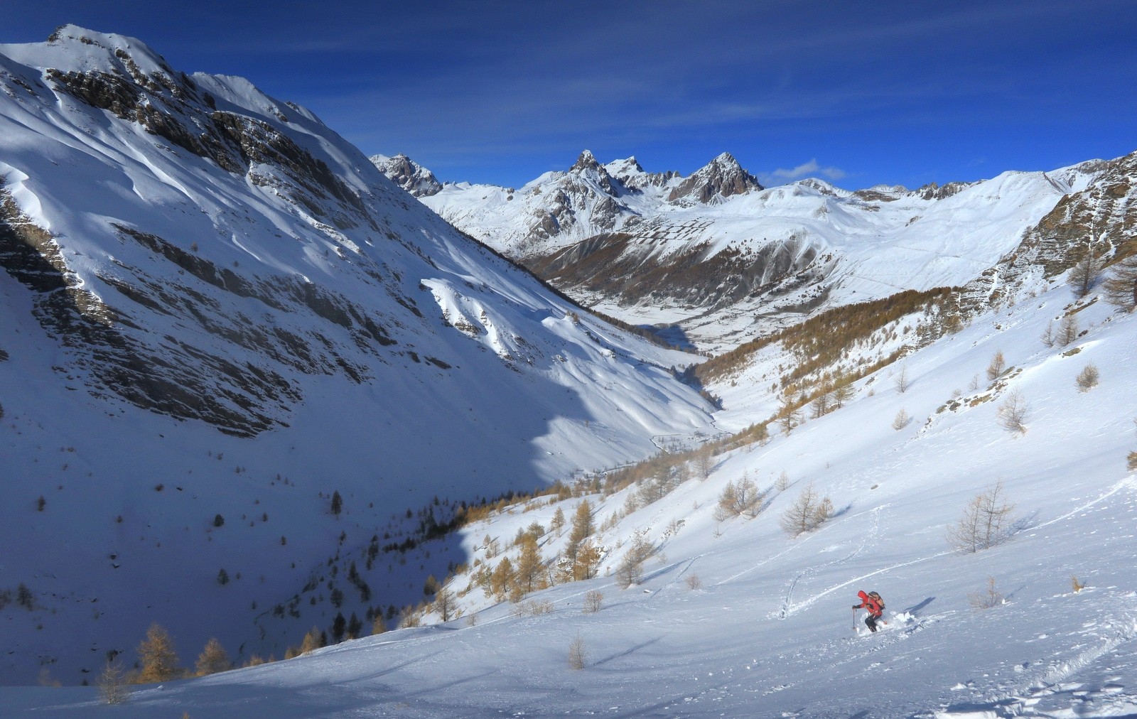 Les pentes autour du Col de Larche et en rive droite de l'Ubayette sont très peu enneigées.