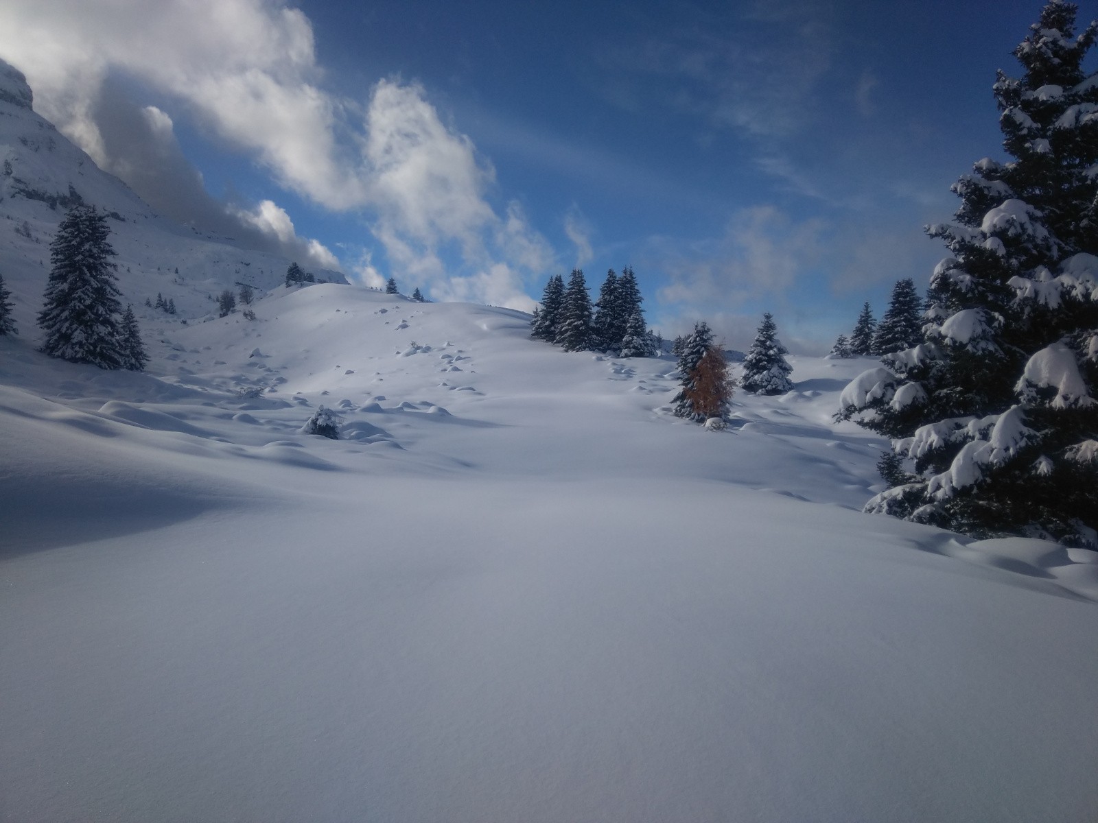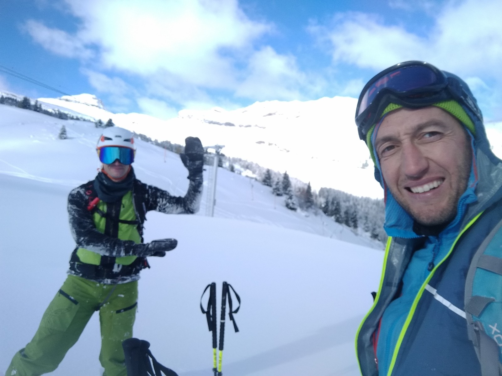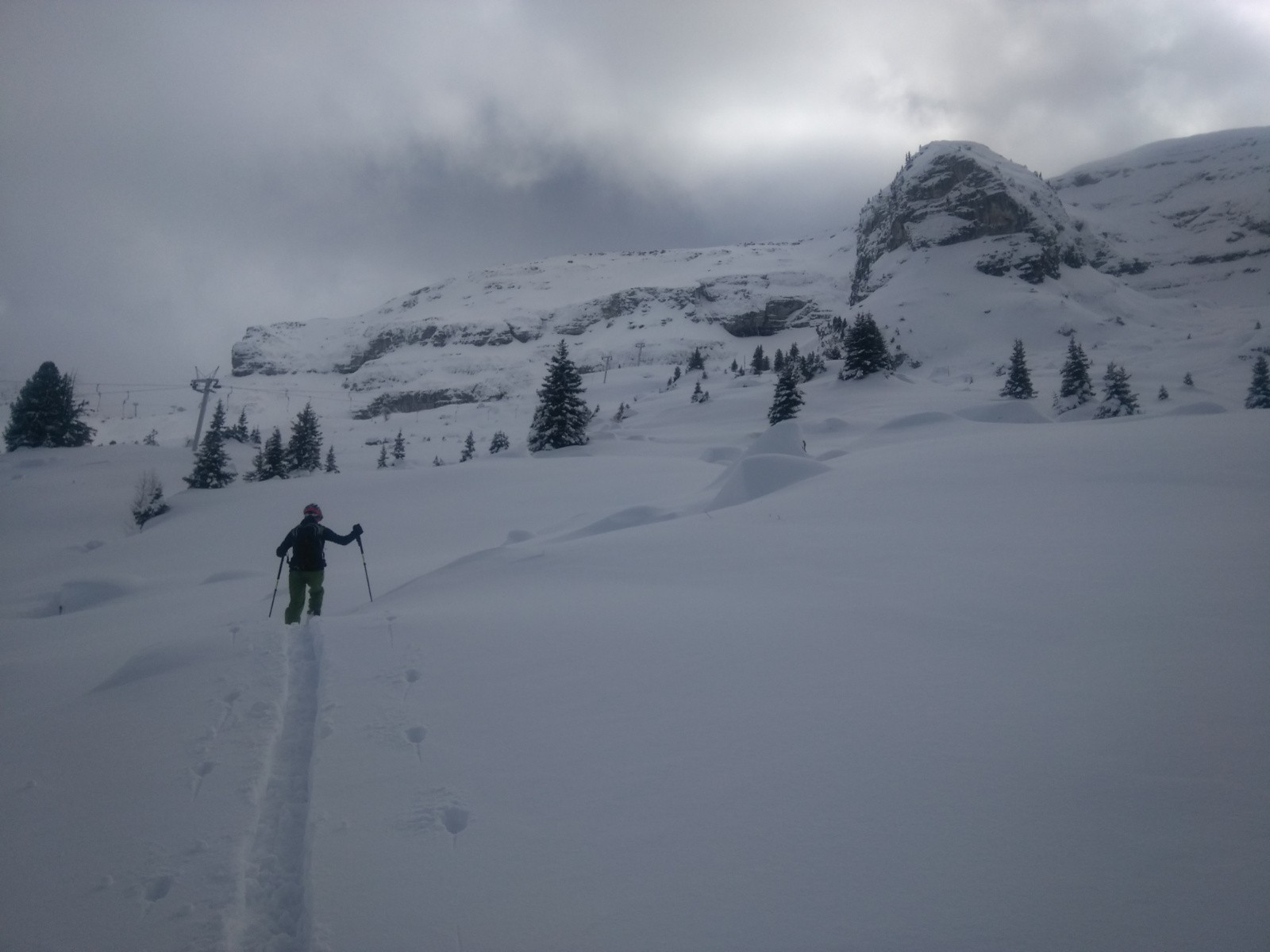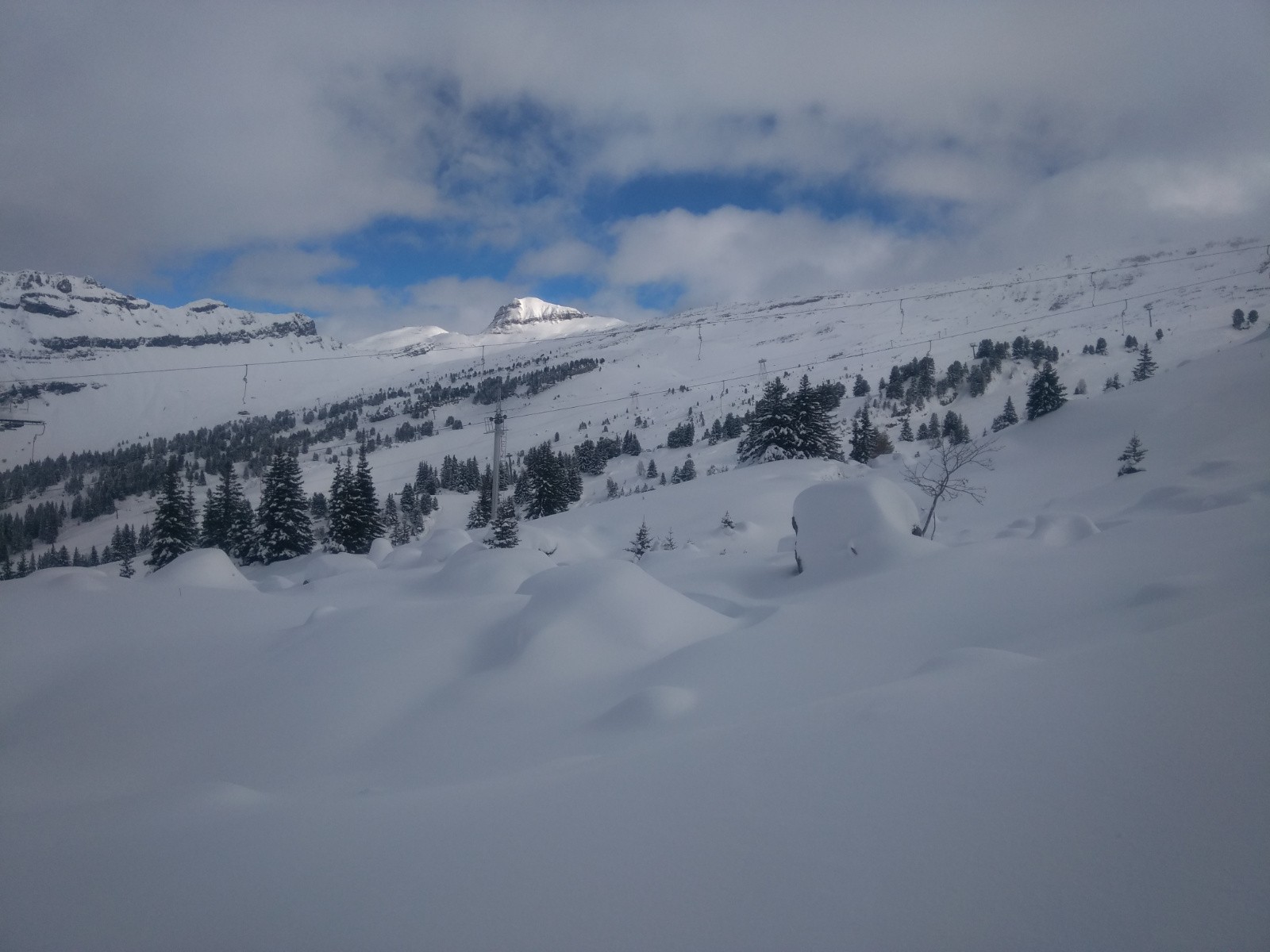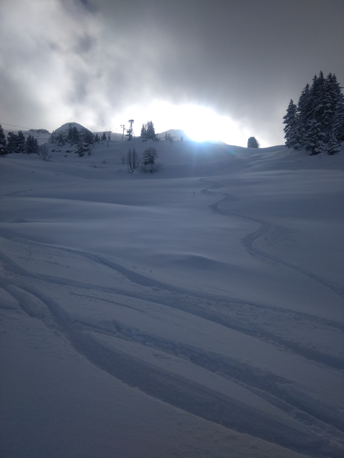 A la base nous devions rejoindre des copains au sommet des grandes platières mais vu que le brouillard restait accroché, changement de programme. Beaucoup de monde jusqu'au sommet du télécabine. Après plus grand monde, normal on a tracé autant en montée qu'en descente. Poudre partout. On serait bien resté à tricoter mais retour maison oblige !!!!