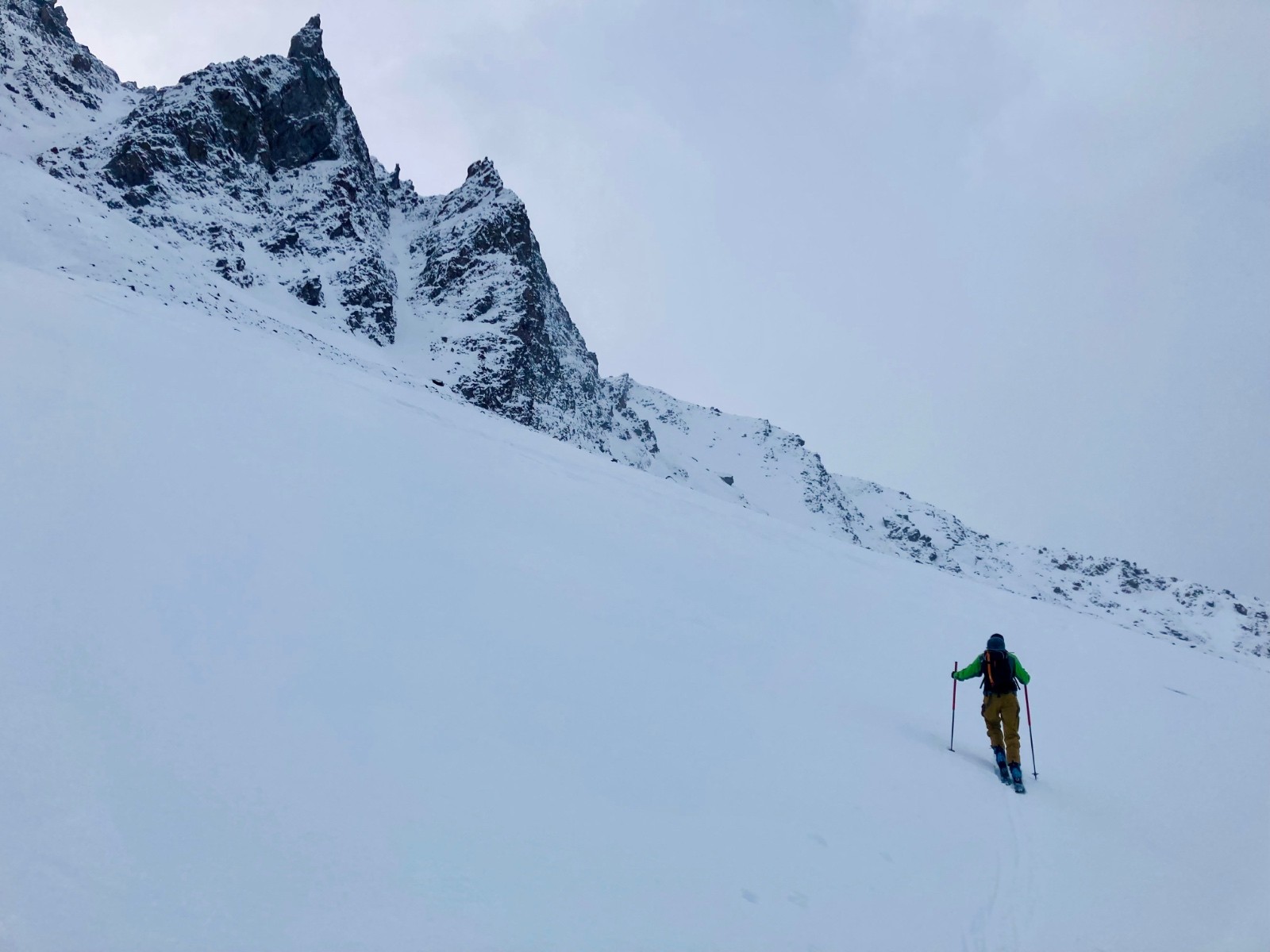 On s’arrête à quelques encablures de la sortie (un ressaut qui demande un déchaussage à la descente, on est pas là pour la gloire ni la fierté)