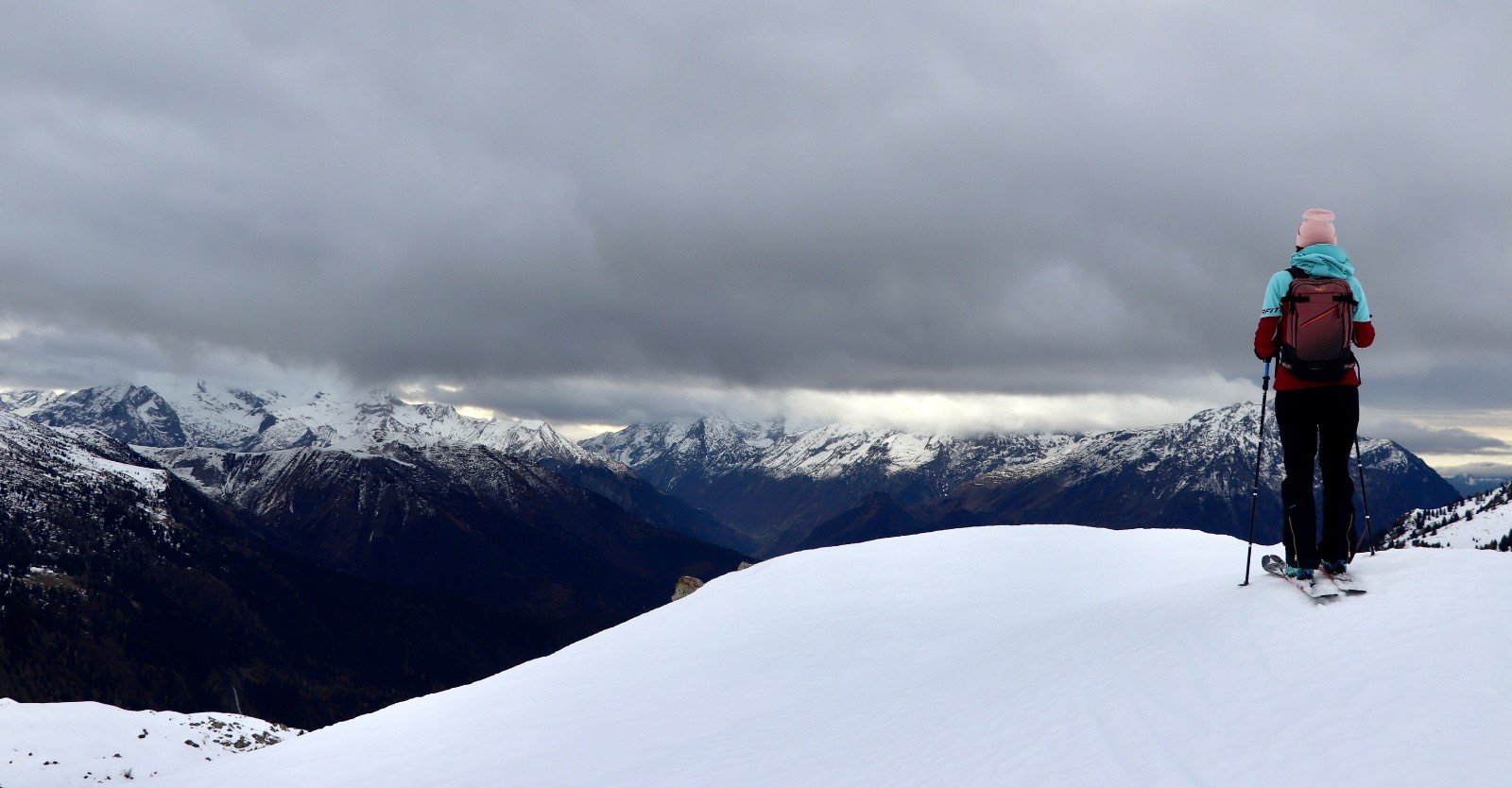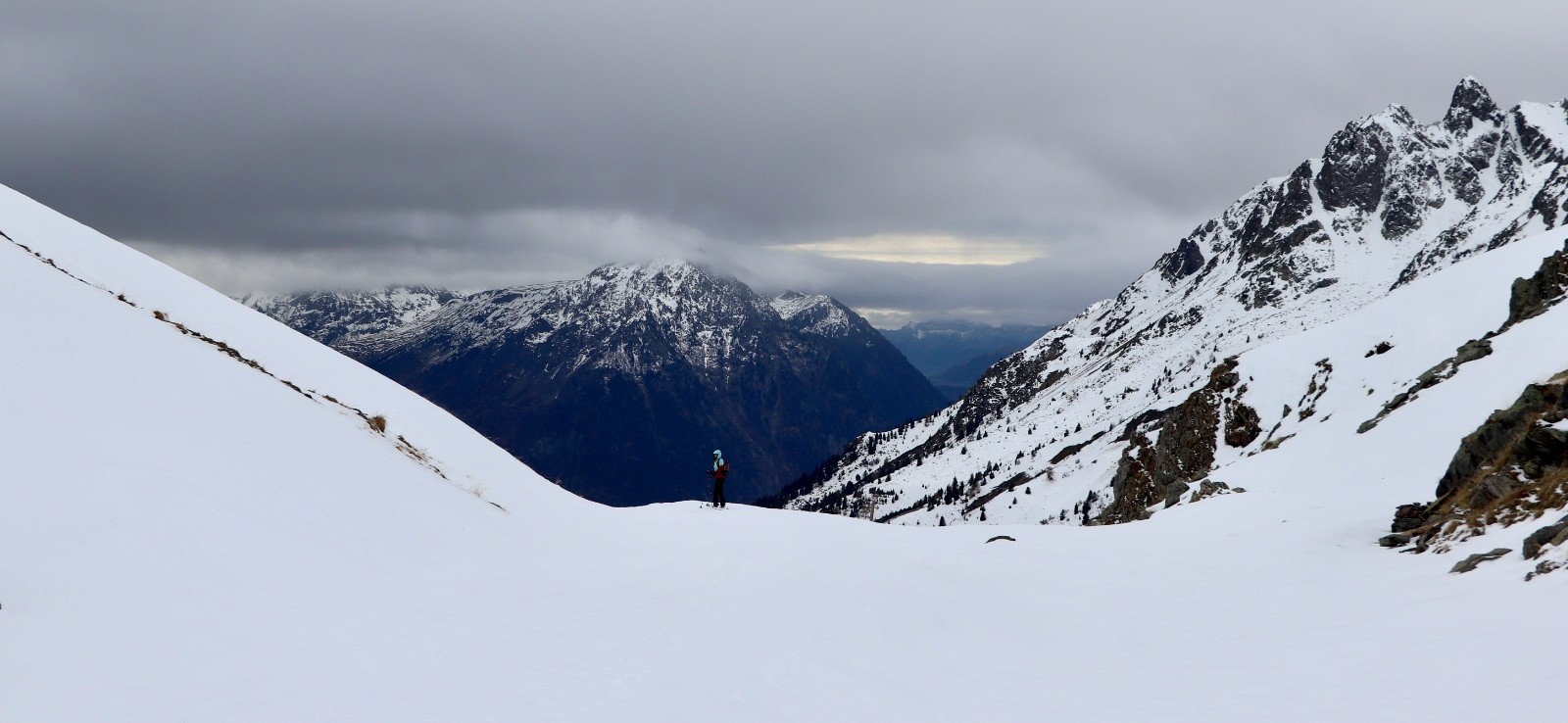Après le redoux et la pluie de la semaine précédente, nous tentons tant bien que mal une virée au dessus de Vaujany. Le choix ne fut pas mauvais, nous stoppons en voiture vers 1800 m et pouvons chausser directement les skis. Nous nous retrouvons totalement seuls au monde dans le secteur. L'enneigement au dessus de 2000 m devient bon mais la qualité de la neige, sous l'effet du réchauffement laisse à désirer. L'ambiance est austère avec de nombreux nuages accrochants le relief, mais la vue reste bien dégagée sur le Barrage de Grand Maison et le massif des Grandes-Rousses. A partir du Col du Sabot, nous revoyons notre objectif à la baisse, abandonnant les Aiguillettes de Vaujany pour le sommet de Côte Belle (2 395 m), nous bottons sous les skis comme jamais. Un début de saison en douceur.