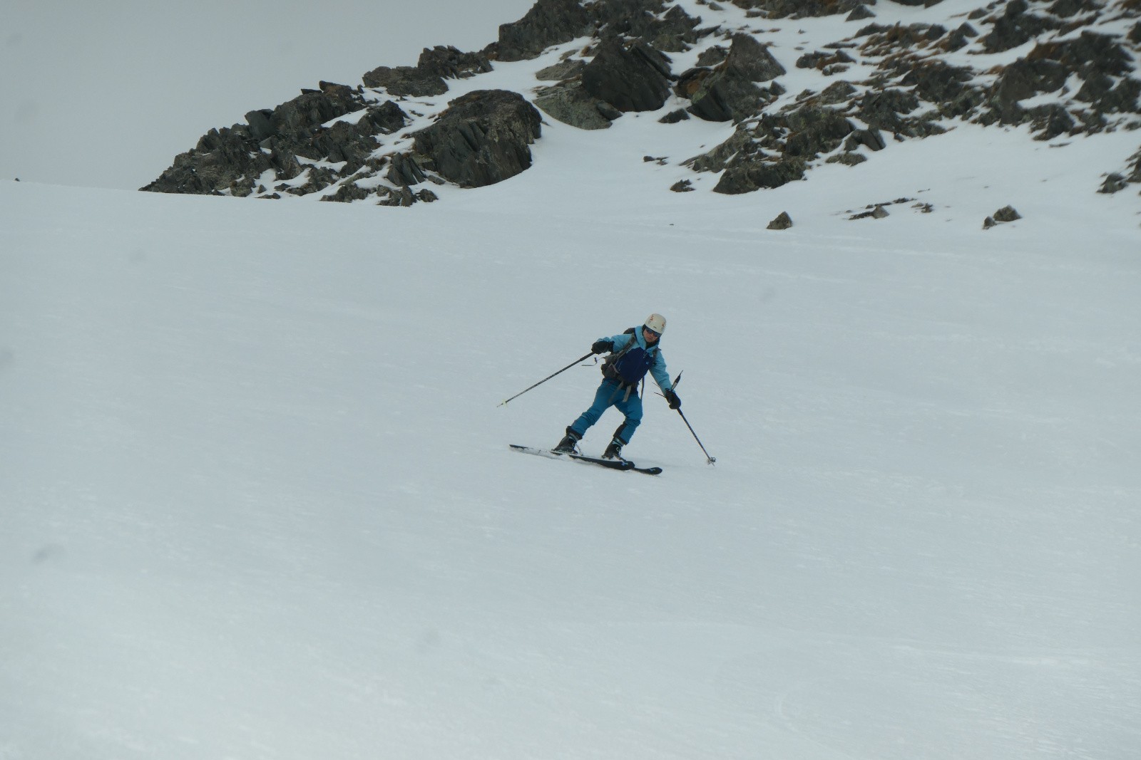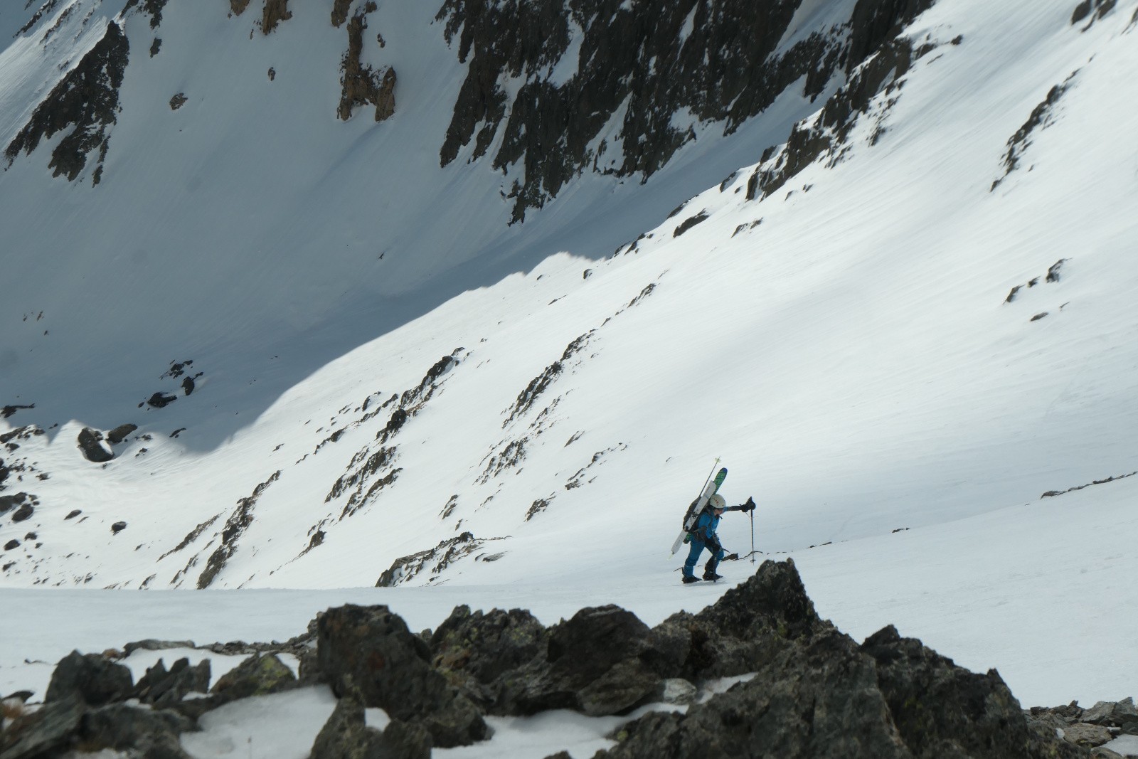 On sort les crampons dans la pente finale où la neige est vraiment béton. quelques dizaines de mètres sous le Col de Piéfroid, les rafales de vent nous cueillent voire nous déstabilisent avec les skis sur le sac. Il a en plus eu la bonne idée d'aller décaper le passage du col, en belle vitre, on s'y verrait presque dedans. Bref, pendant qu'Emeric grimpe efficacement au sommet je m'arrête demander un peu d'aide à mon piolet. Pas en position hyper confort j'essaie de pas lâcher mon sac en route. Voilà t'il pas que j'entends mon compagnon gueuler depuis le col "Glaaaad". A peine plus tard un bâton dévale la pente pour finir sa course quelques centaines de mètres plus bas. Dans ma posture je ne peux pas bien faire bien plus que de le regarder filer. Au col il y a effectivement de la vitre et du vent. On réfléchit comment descendre. Pendant ce temps une poche à crampons part rejoindre le bâton. En tout cas, on descendra légers!