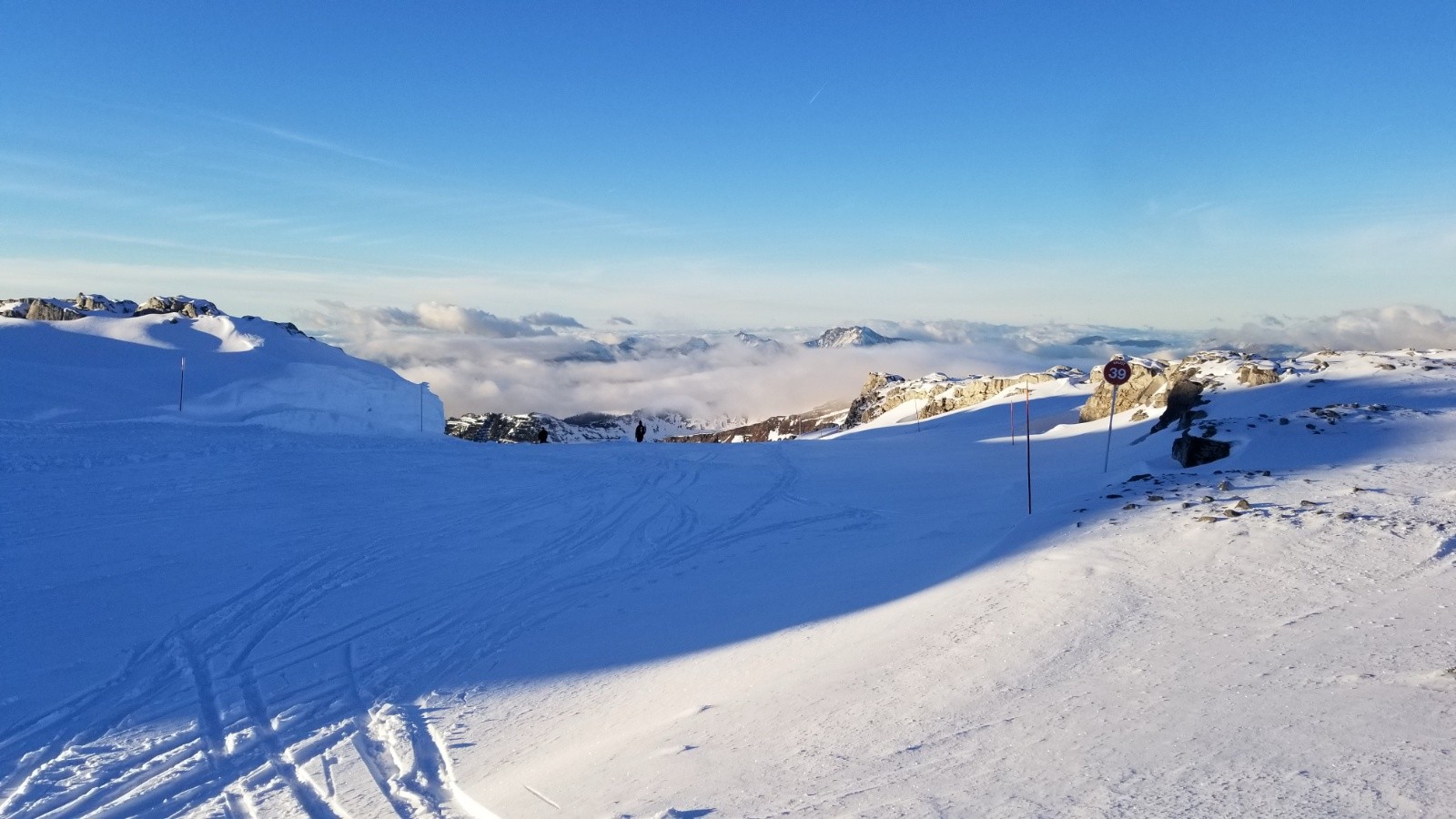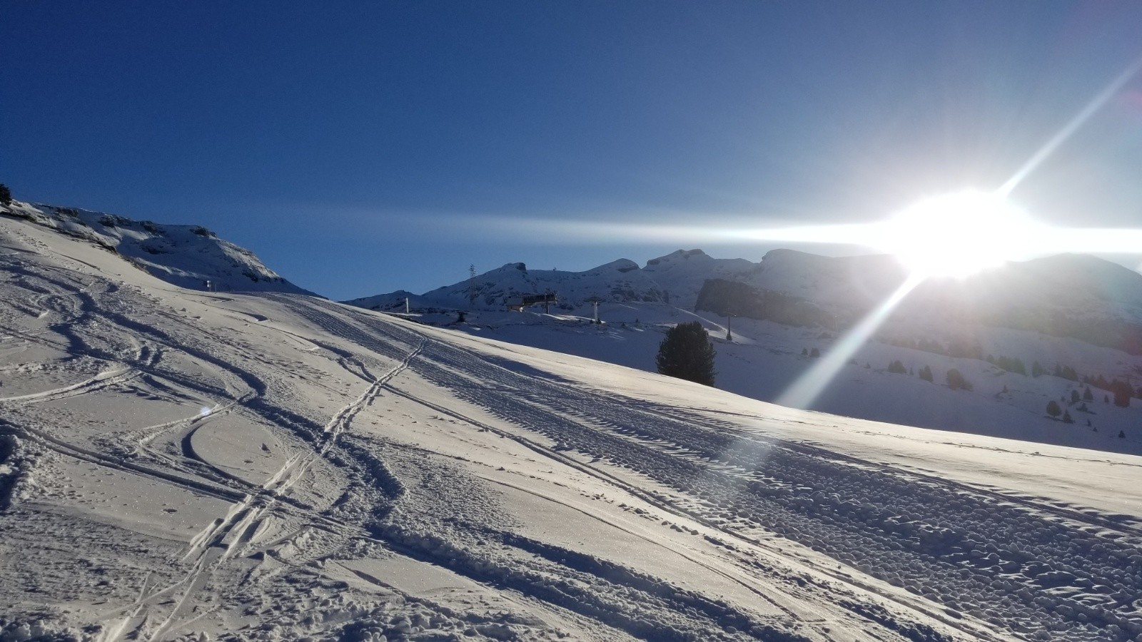 Petite couche de neige fraîche (entre 5 et 8 cm selon l'altitude) posée sur un fond béton/glacé. Ça reste pas si mal à skier! Les traces de dameuses regelées peuvent être assez piégeuses.