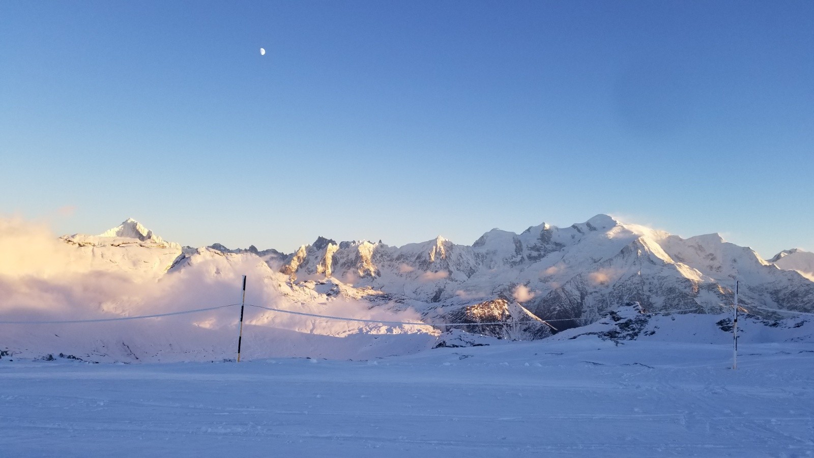 Bis repetita, pour à nouveau profiter d'un massif du Mont-blanc plâtré et fumant, sous le regard bienveillant de la Lune déjà bien haute!