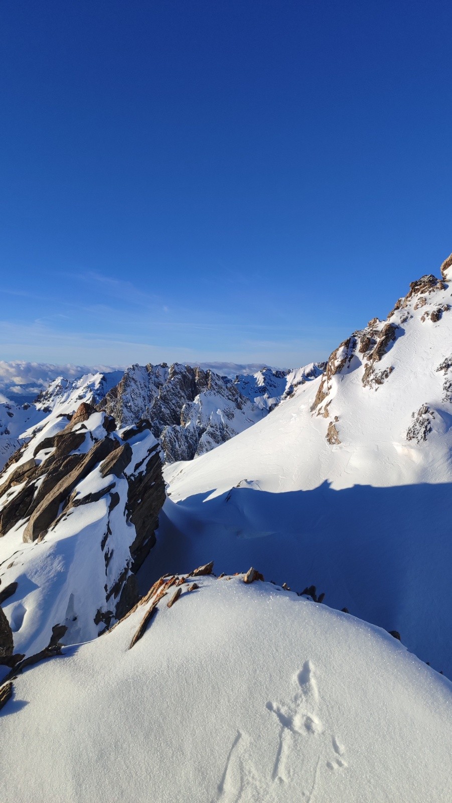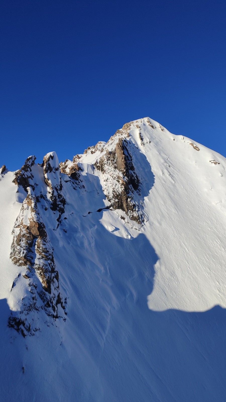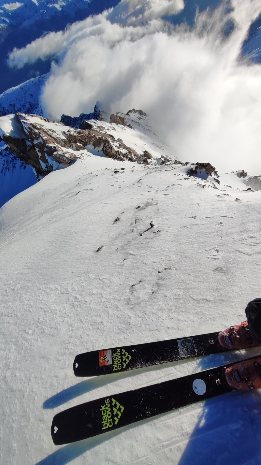 Conditions pour le ski : infame à moyenne. Je n'ai vu qu'une fois quelque chose de similaire.. au sommet j'ai eté surpris du decaillage, mais sur la glace je tenais uniquement grace à la neige transfo en mouvement. Dans la face c'etait innomable, au dessus des falaises j'ai eu beau tout essayé je me faisais chasser, aucune adherence, impossible de passer la couche de vitre. À pied cest rando. Dans le 50° beton aussi à vitre mais ca tenait mieux. Heureusement
