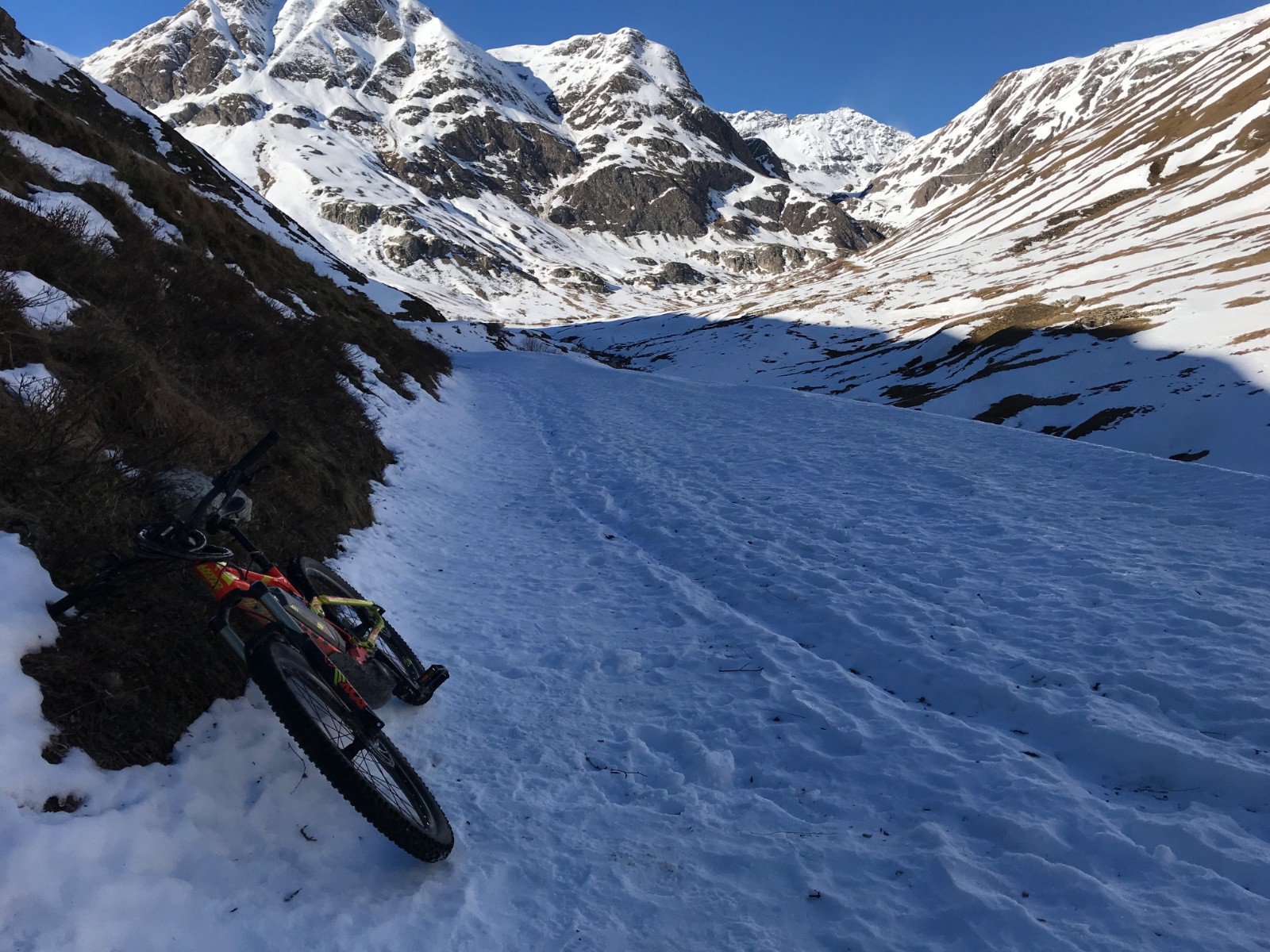 La route est enneigée et plutôt verglacée, c’est bien dur à la descente. Le tunnel passe encore, mais une coulée obstrue l’entrée et il faut se plier en quatre.