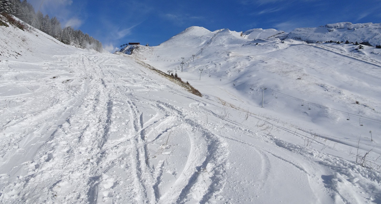 En dessous de 1800m , beaucoup de touchettes mais ça reste skiable jusqu'au parking.En altitude, la petite couche de poudreuse a été très soufflée.Dans le haut,il vaut mieux skier sur les zones où il y a la sous couche de l'ancienne neige durcie.