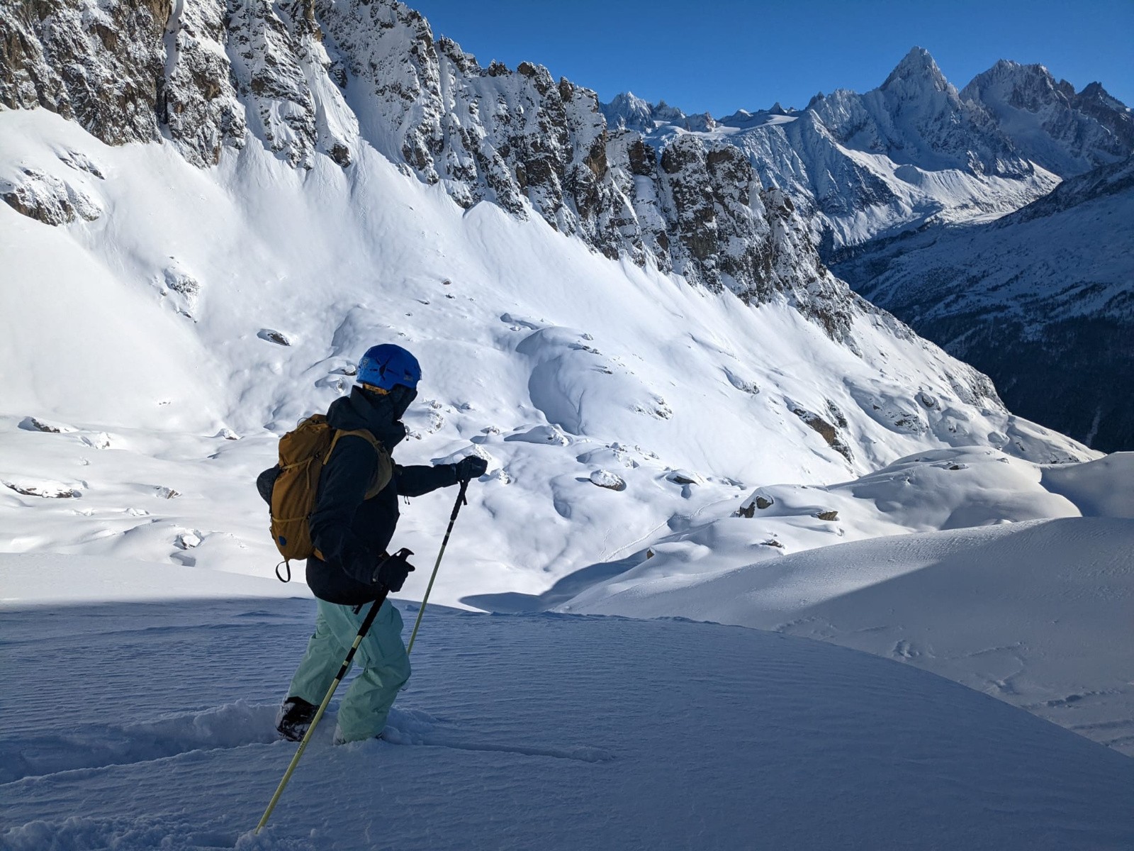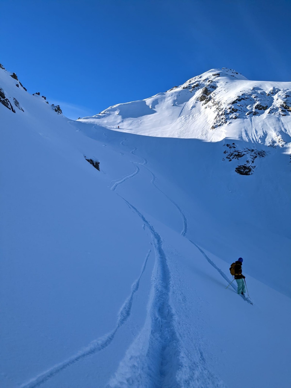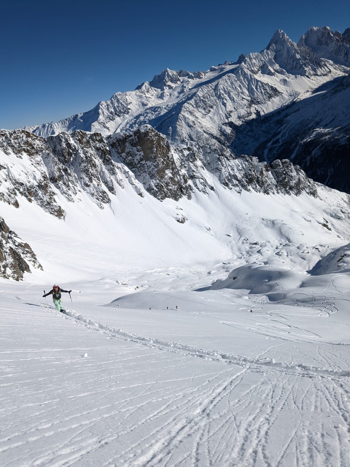 On profite de la dernière journée d'ouverture de la Flégère pour aller se balader autour des belles montagnes Chamoniardes, après une montée en benne dans un silence de monastère, c'est laché de morts de faim de poudre direction l'index , beaucoup montent vers la Glières, on essaie de fuir la foule alors traçage jusqu'en haut du TK de la Floria pour une descente dans le joli vallon jusqu'à arriver à l’itinéraire bondé menant au lac Blanc, alors demi tour avec l'idée de montée voir la combe des aiguilles crochues, 3 personnes sont juste avant nous, ça sent le bon plan tranquillité, on fait la rencontre de Tonio qui cherche des âmes vaillantes pour s'engouffrer dans cette mythique traversée, désertée ce jour, en sachant bien qu'un peu de randonnée nous attends quelque part !