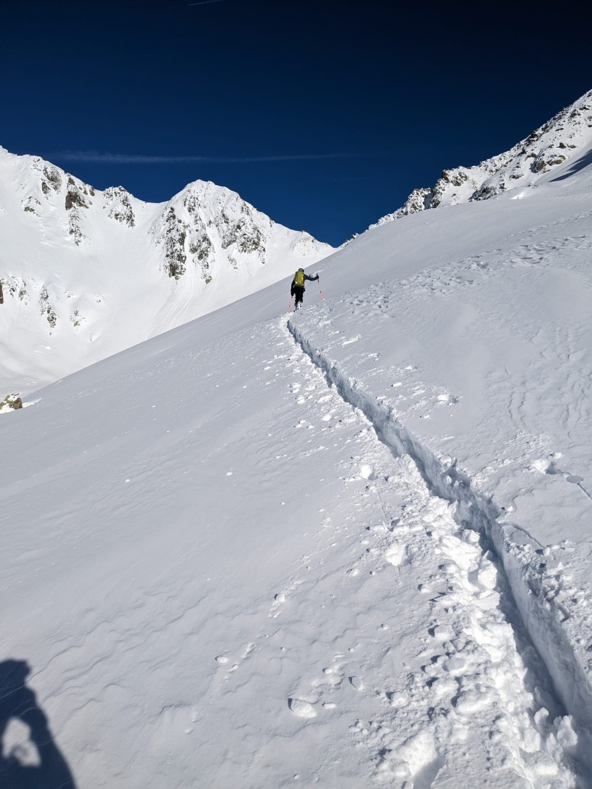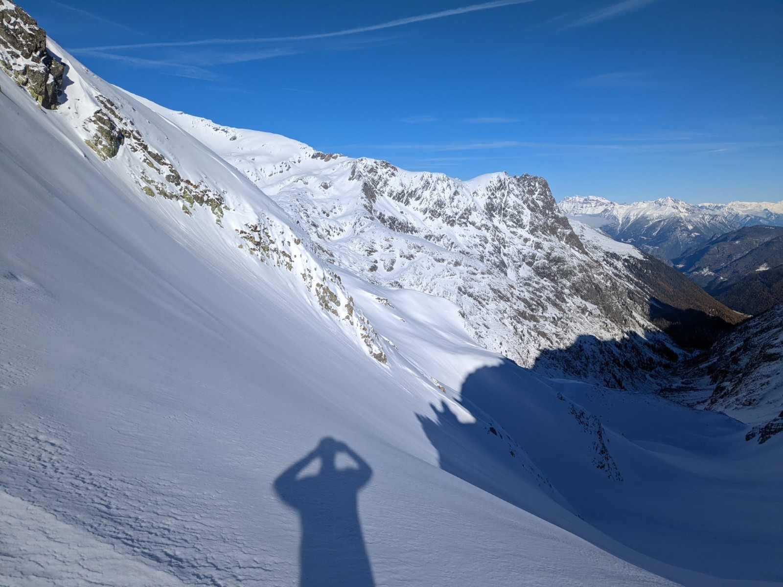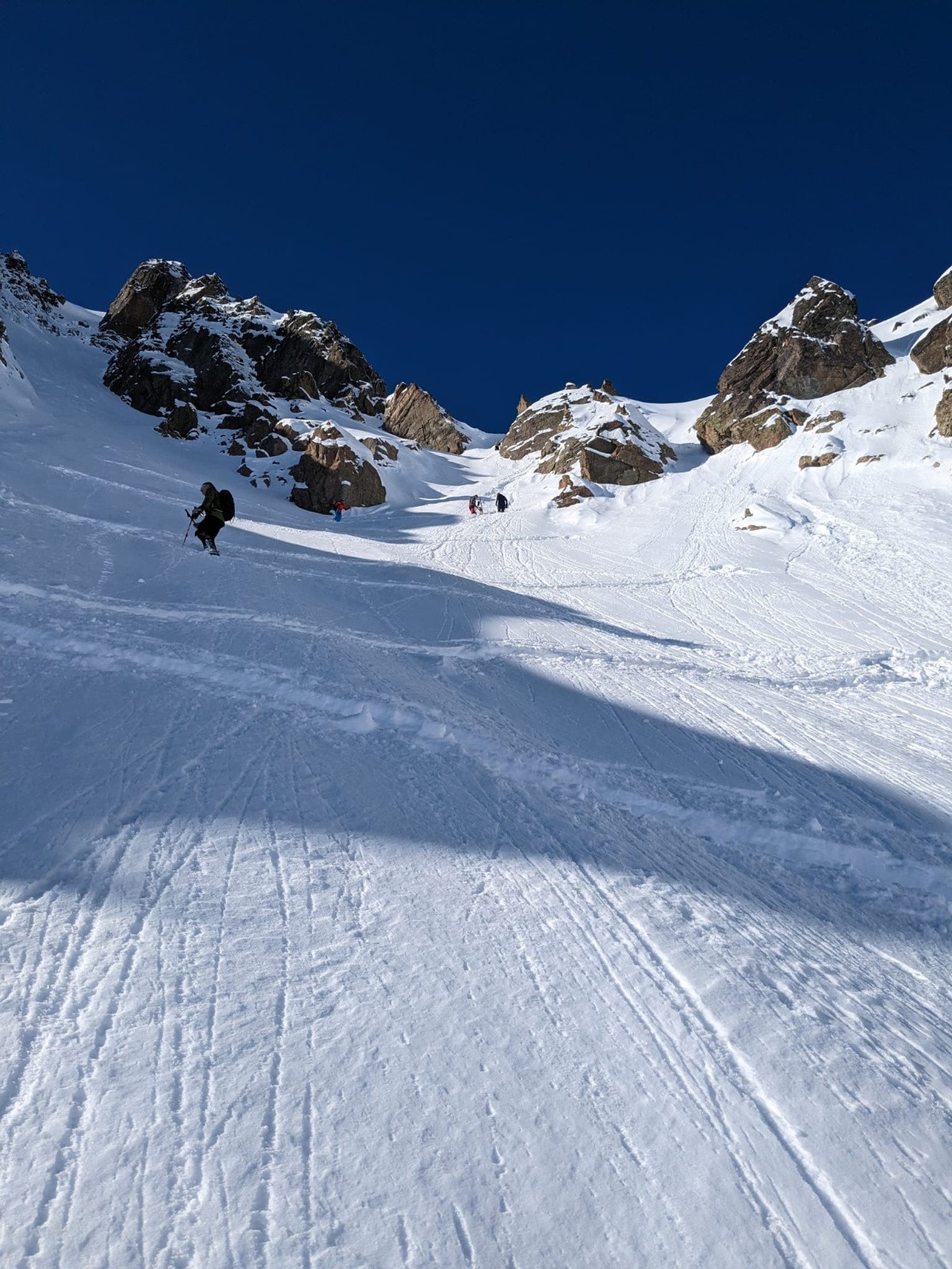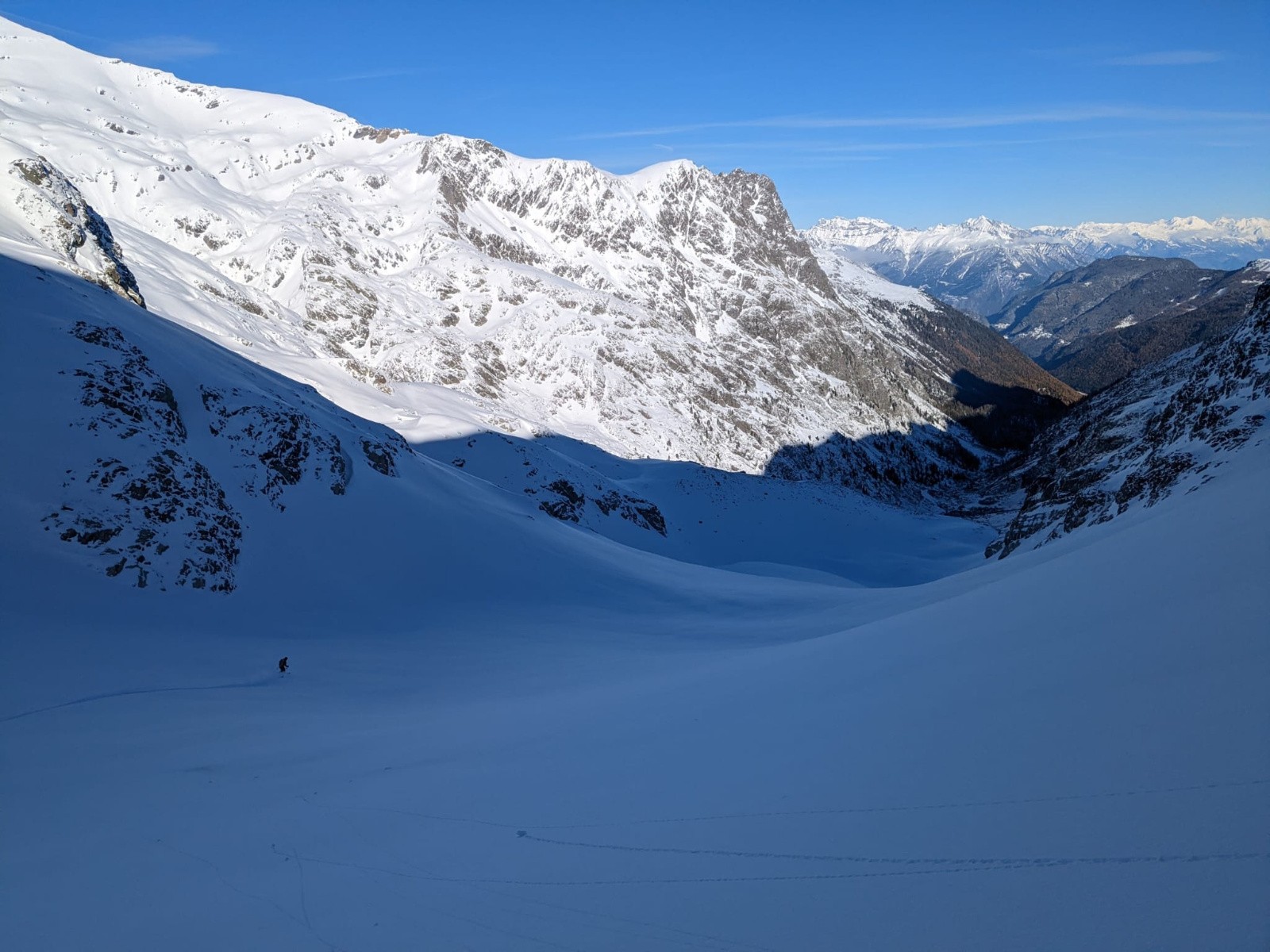 On entame une belle descente soft, content d'avoir 96 au patin vu la pente et la quantité de neige ! une petite traversée à chauffé un peu, on repeaute sous un gros soleil, le T shirt est de sortie avant de remettre la polaire arrivés dans la combe d'Envers de Bérard. sortie au col et on découvre ce vallon tout à l'ombre ou l'on sait qu'on va passer encore un bon moment de ski , la question étant de savoir jusqu'à ou ?