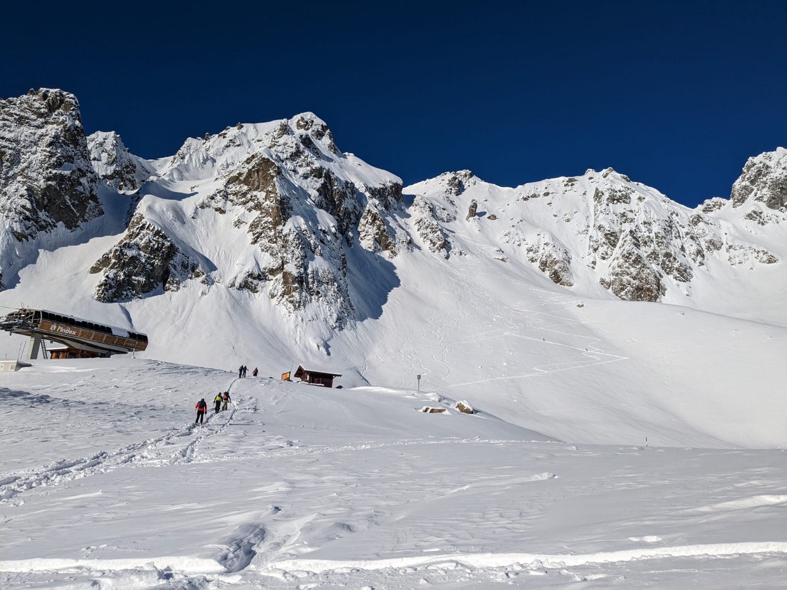 Conditions pour le ski : 20 cm de poudre froide sur fond béton le matin au soleil et dans les zones ombragées, quelques patches dégarnis, et d'autres avec des accumulations