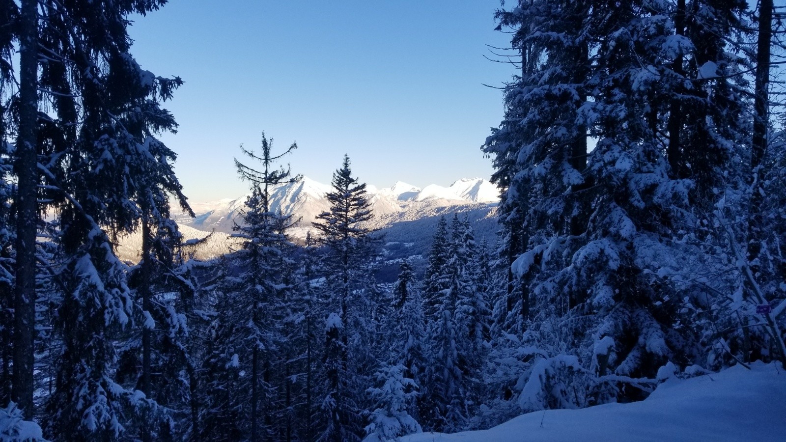 Petite pause au sommet de la télécabine, puis j'enquille la suite dans une solitude totale. Le panorama hivernal est magnifique!