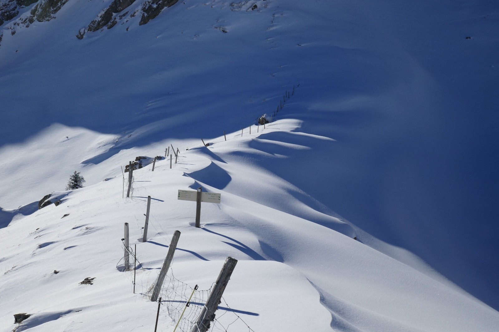 la trace arrive sur la crête. Il faut redescendre vers l'ouest pour le Col Ratti.